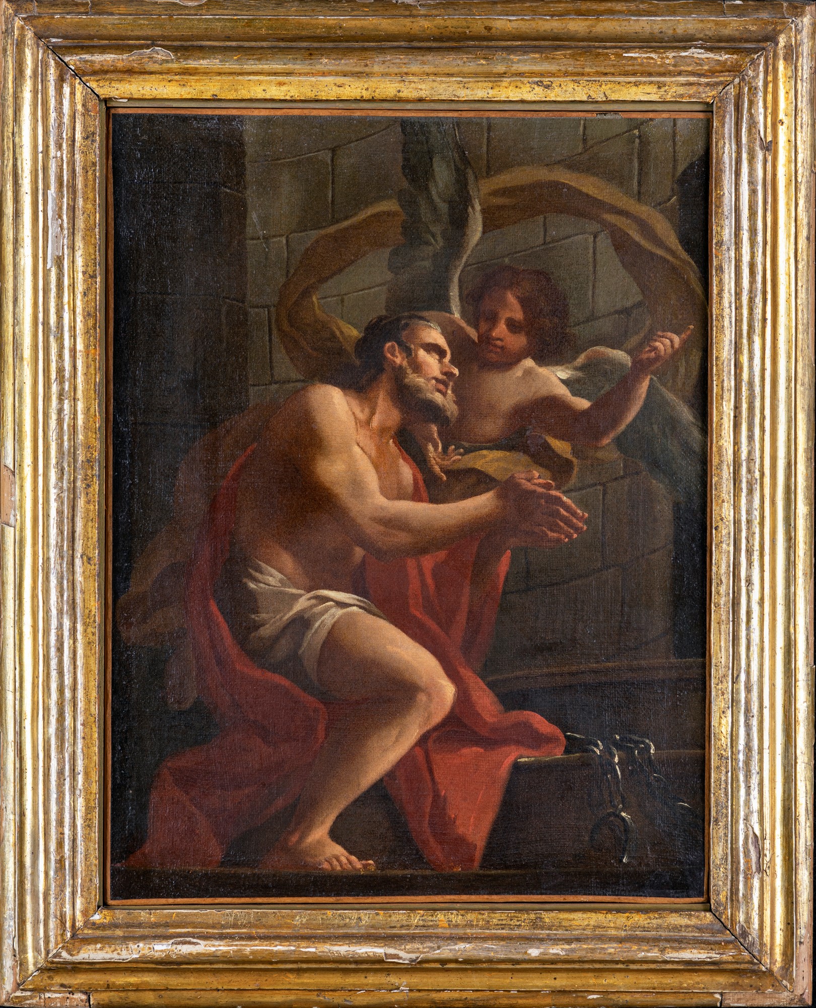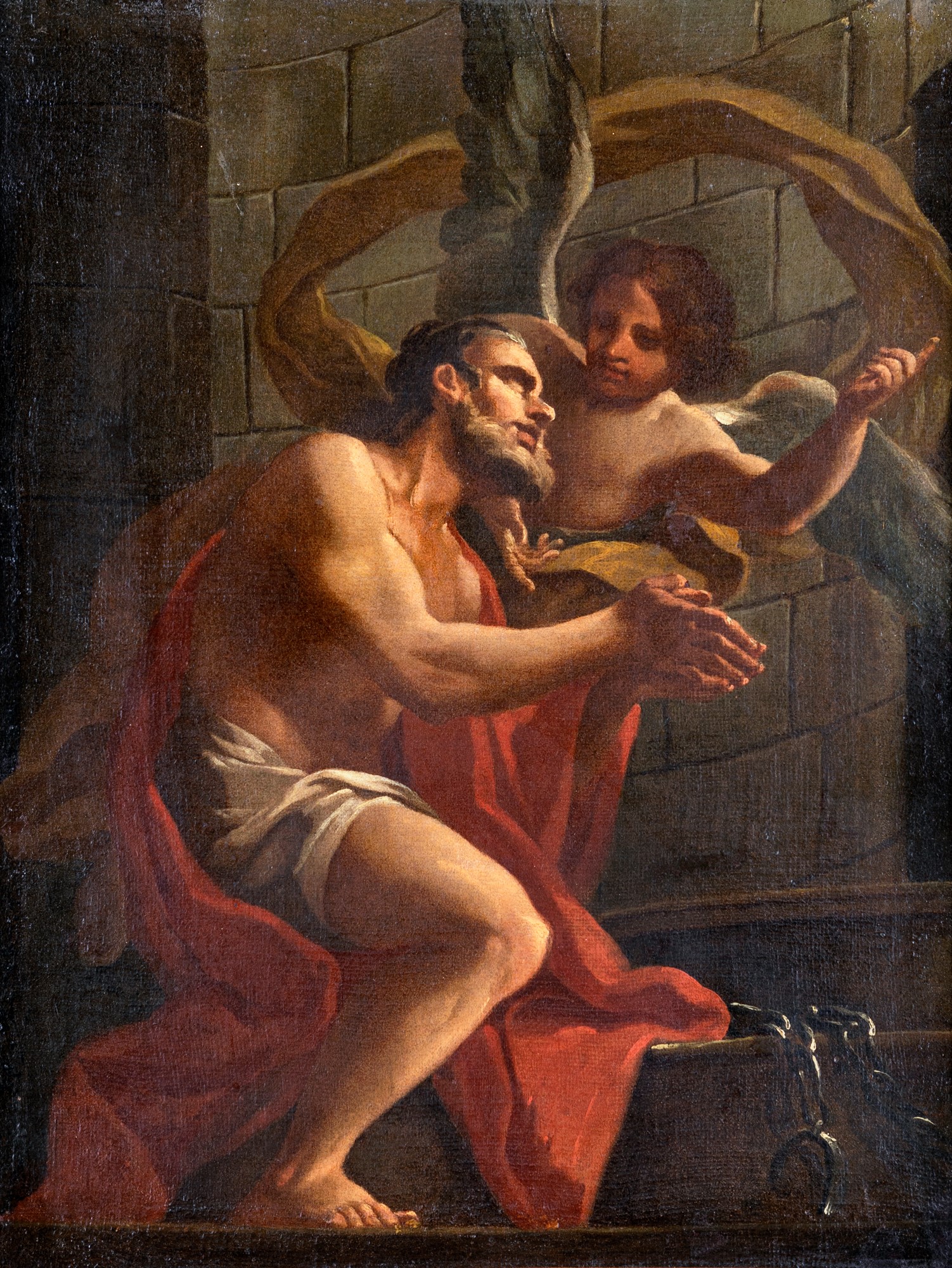 Intelligente interpretazione dell'episodio descritto negli Atti degli Apostoli (XII, 6 e ss.) in cui il Santo, rinchiuso nelle prigioni di Erode, viene liberato da un angelo. L'opera è corredata da una cornice coeva.