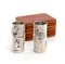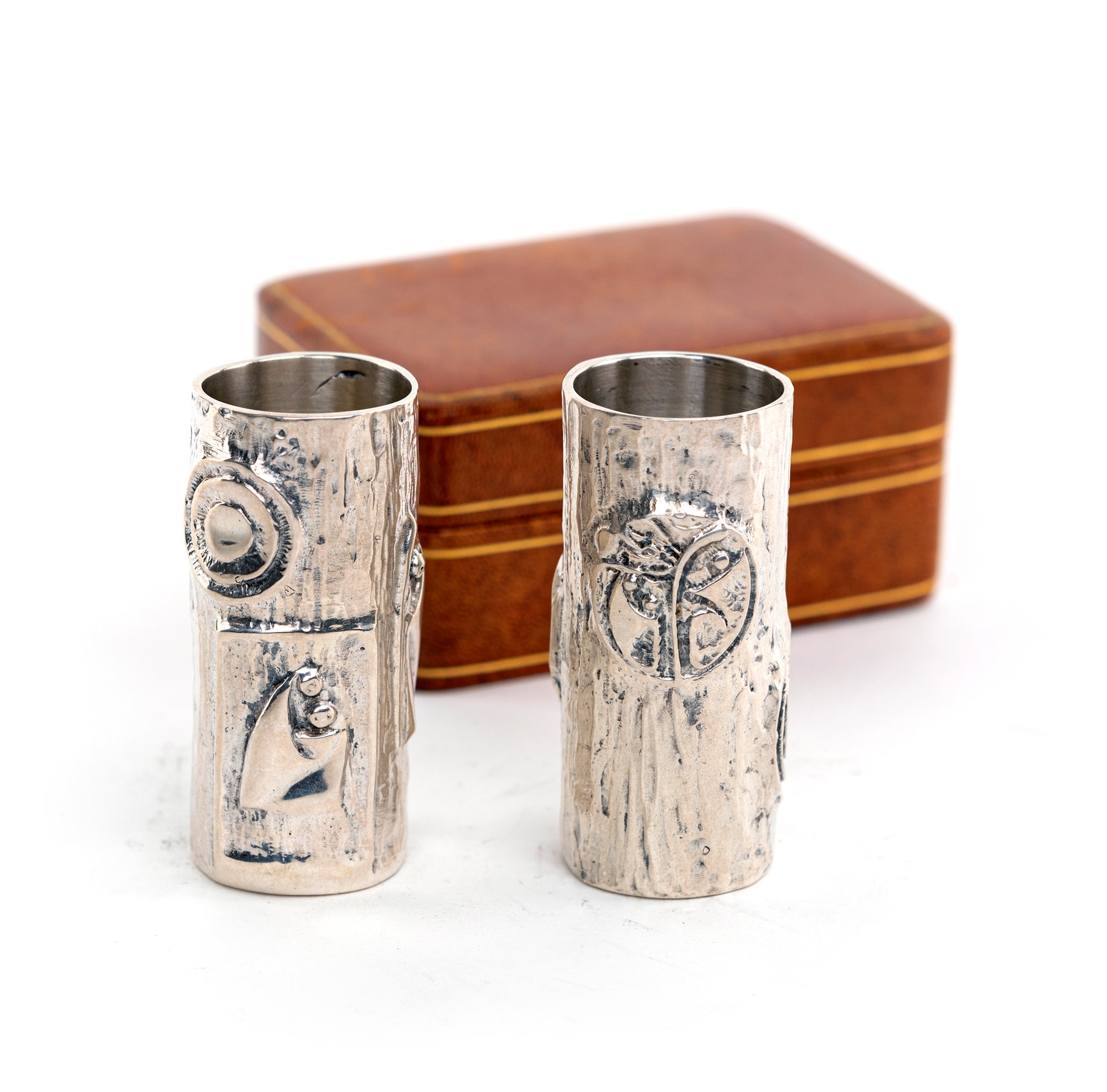 di forma cilindrica con decorazione figurata stilizzata resa in bassorilievo. Firme non decifrabili con anni 89 e 91. Entro scatola non pertinente rivestita in pelle con impressioni in oro realizzata da Augusto Casciani a Roma