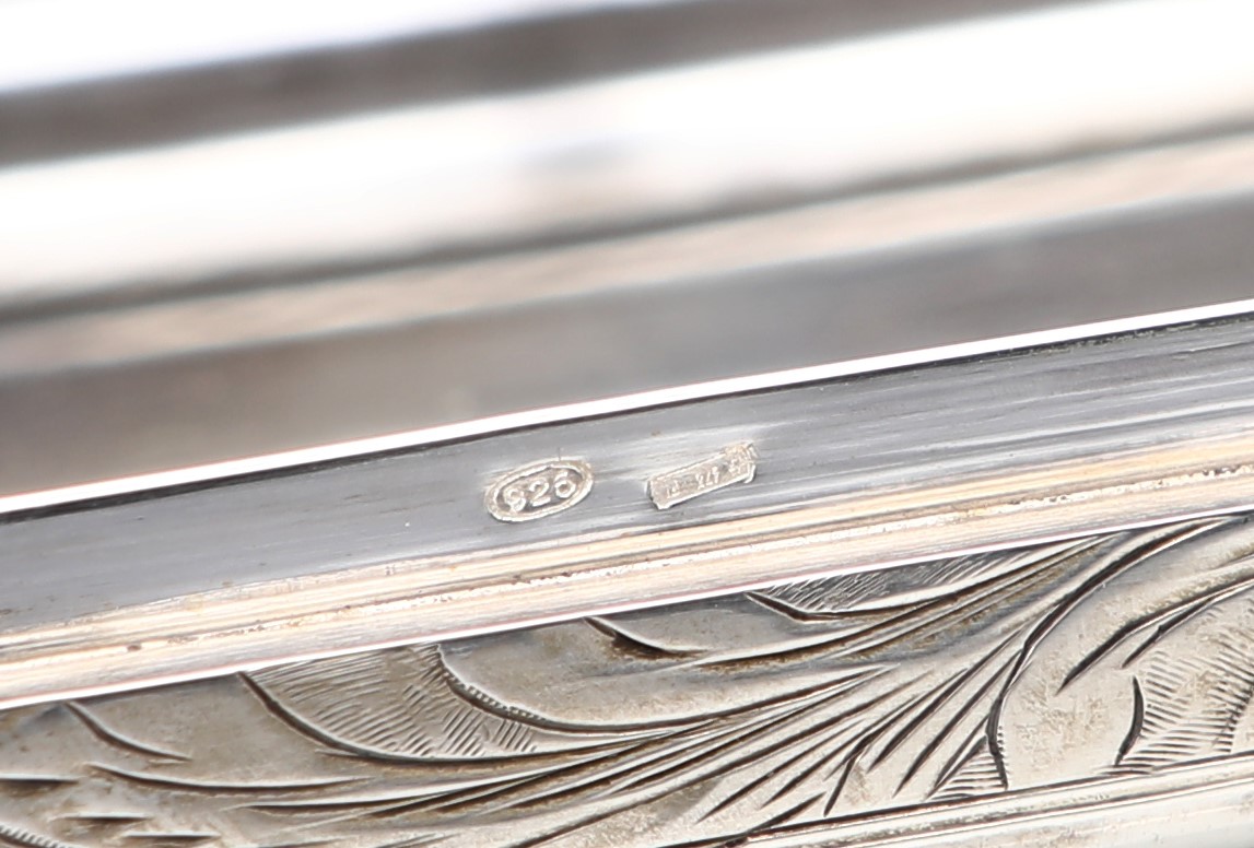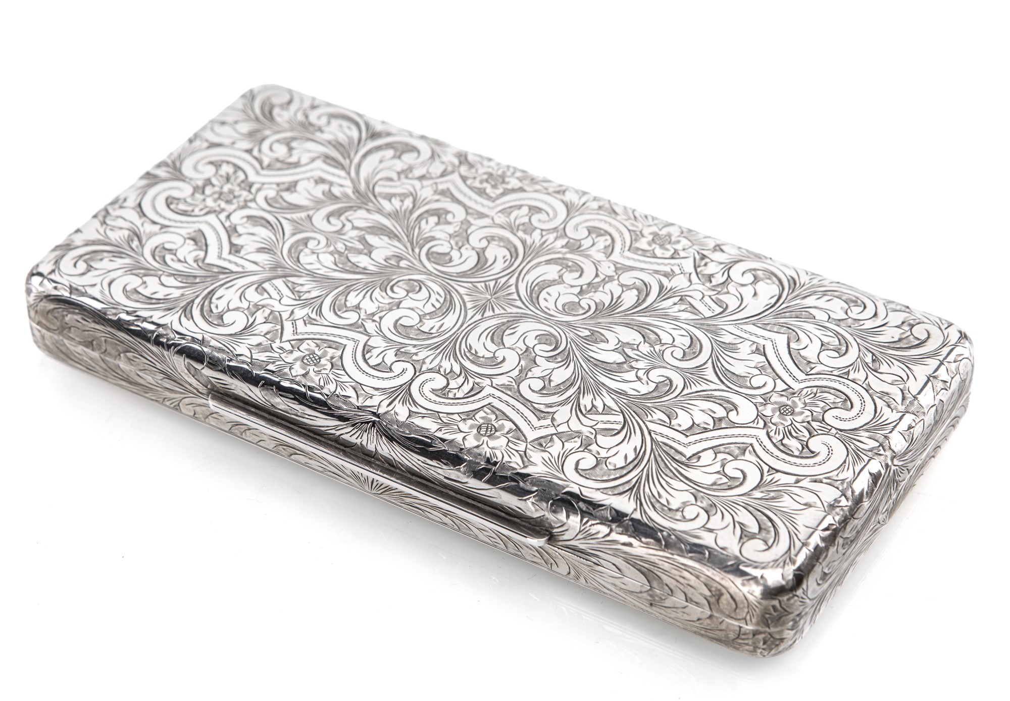 di forma rettangolare con coperchio incernierato ed angoli arrotondati, fitta decorazione a volute incise sull'intera superficie