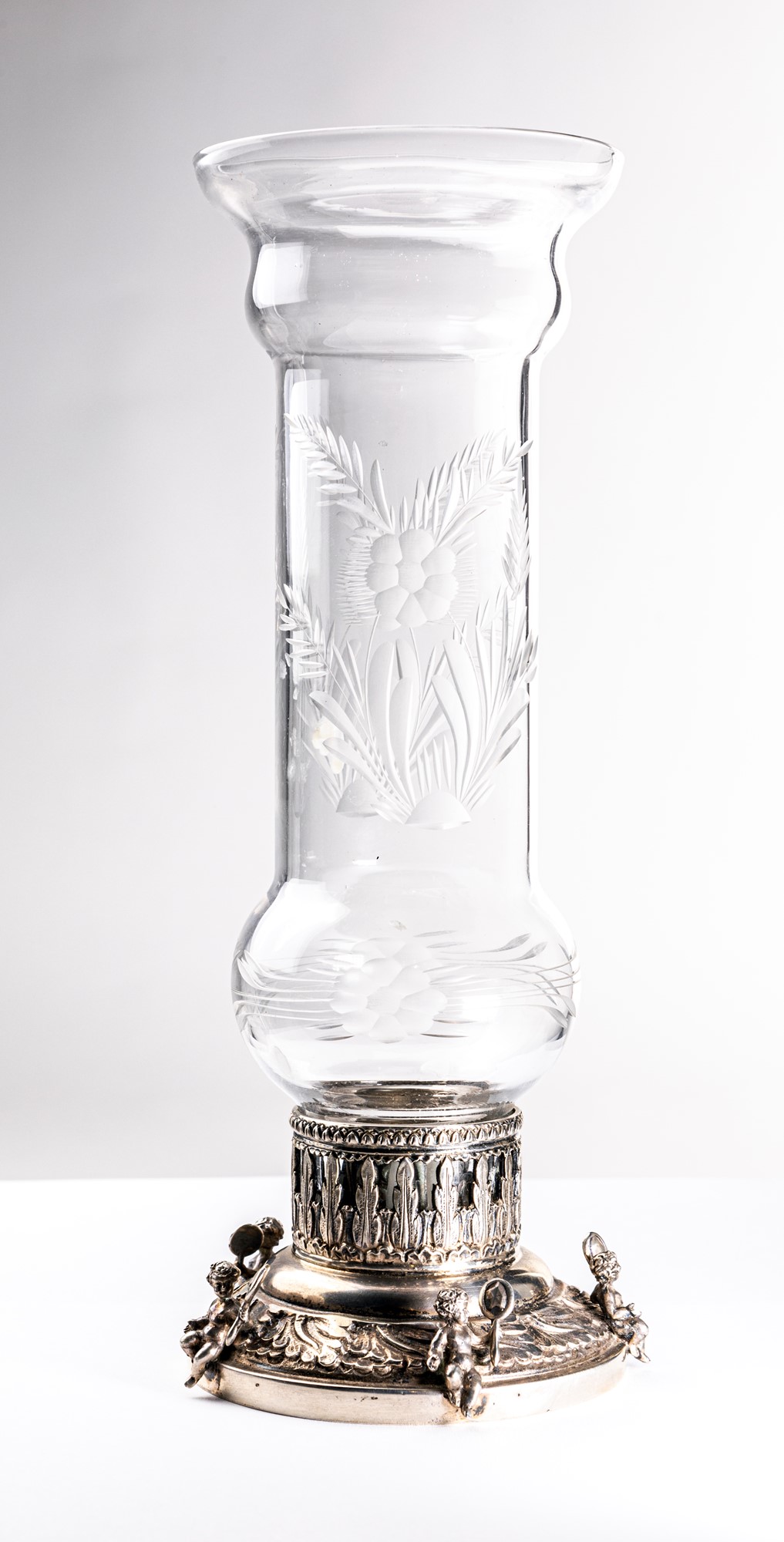 con alto parafiamma in vetro con decorazione molata a motivi naturalistici, supporto circolare cesellato a motivi vegetali, motivo decorativo ripreso lungo la circonferenza del piede, abbellito da cinque piccole figure scultoree di amorino