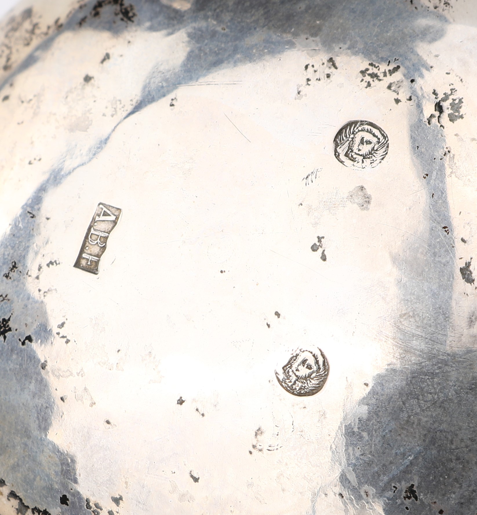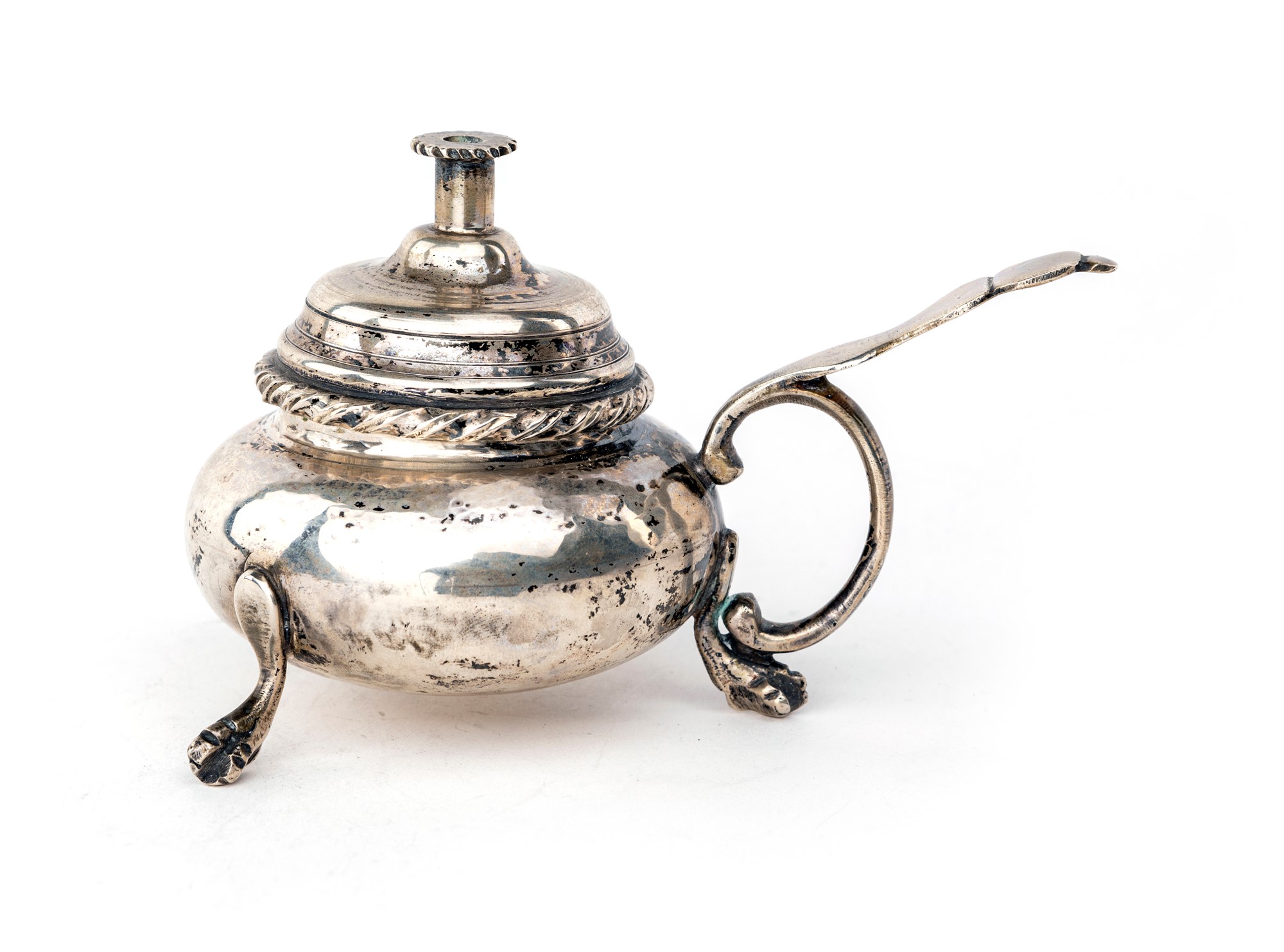 di forma sferica schiacciata su tre piedi ferini; Coperchio a cupolino con profilo cordonato; argentiere A.B.F