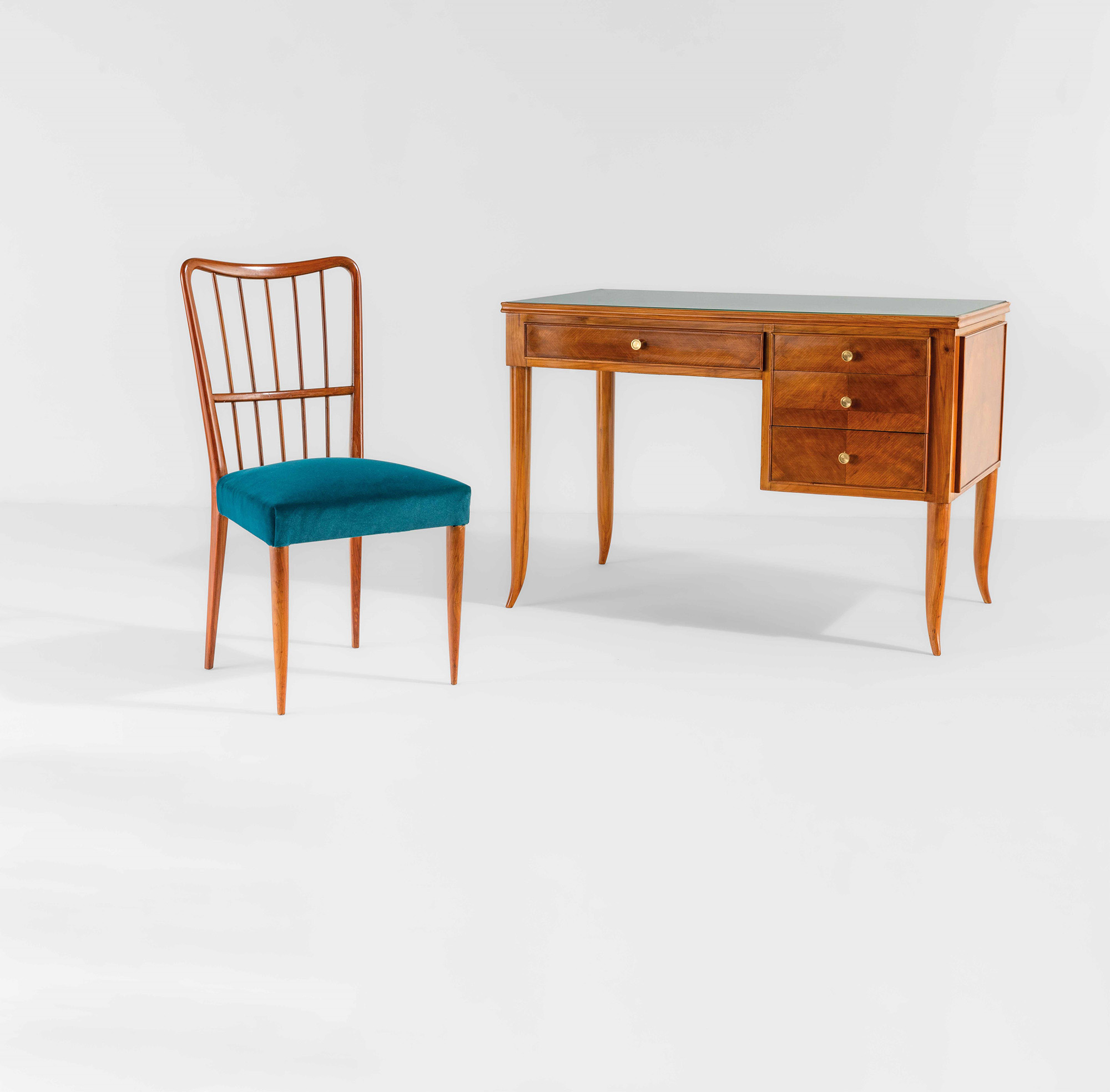 Struttura e cassetti in legno, maniglie in ottone e piano cristallo colorato,, Sedia con struttura in legno e rivestimento in tessuto., Prod. Lietti Paolo e Figli, Italia, 1950 ca., , Dimensioni cm 112x62x h 77; sedia cm 45x47x88.5, Scrittoio cm 112x62x h 77 sedia cm 45x47x88.5