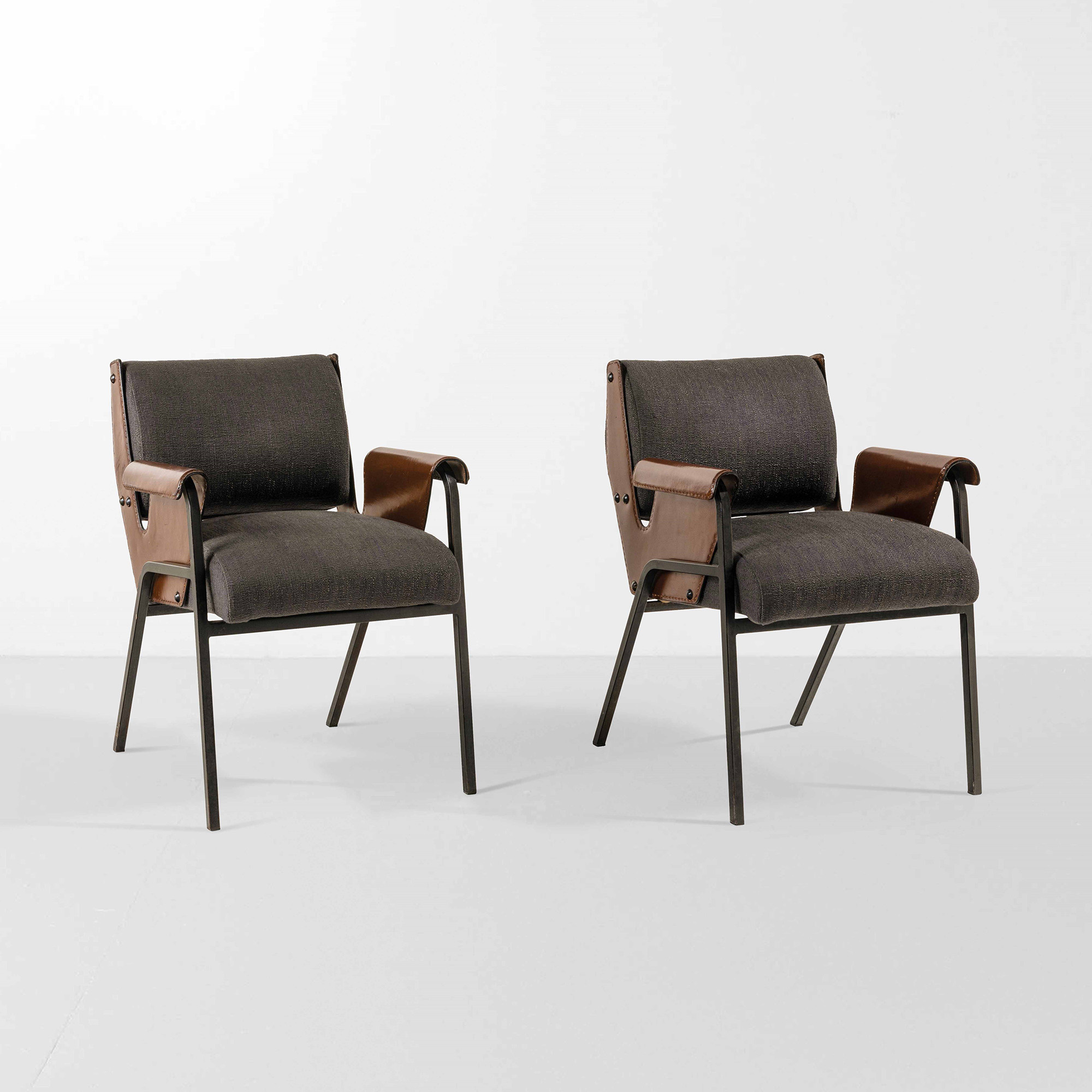 Struttura in metallo laccato, seduta e schienale rivestiti in tessuto, braccioli e fasce laterali in cuoio., Prod. Arflex, Italia, 1950 ca., W. 58 - D. 58 - H. 80 Cm, Bibliografia, Domus n. 343 - Giugno, 1958; G. Gramigna, Repertorio del design italiano 1950 - 1980, p. 90, Mondadori, 1985; I. de Guttry, M. P. Maino, Il mobile italiano degli anni ’40 e ’50, p. 85, Laterza.