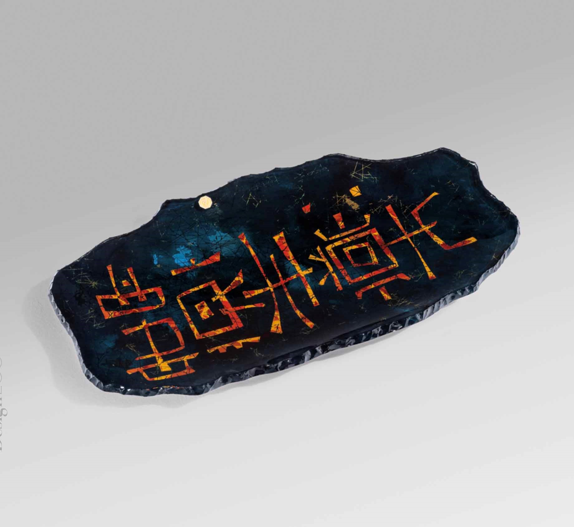 Struttura in vetro molato e scalpellato con decoro eglomizzato., Etichetta originale e firma incisa., Prod. Fontana arte, Italia, 1950 ca., W. 72 - D. 36 - H. 6 Cm