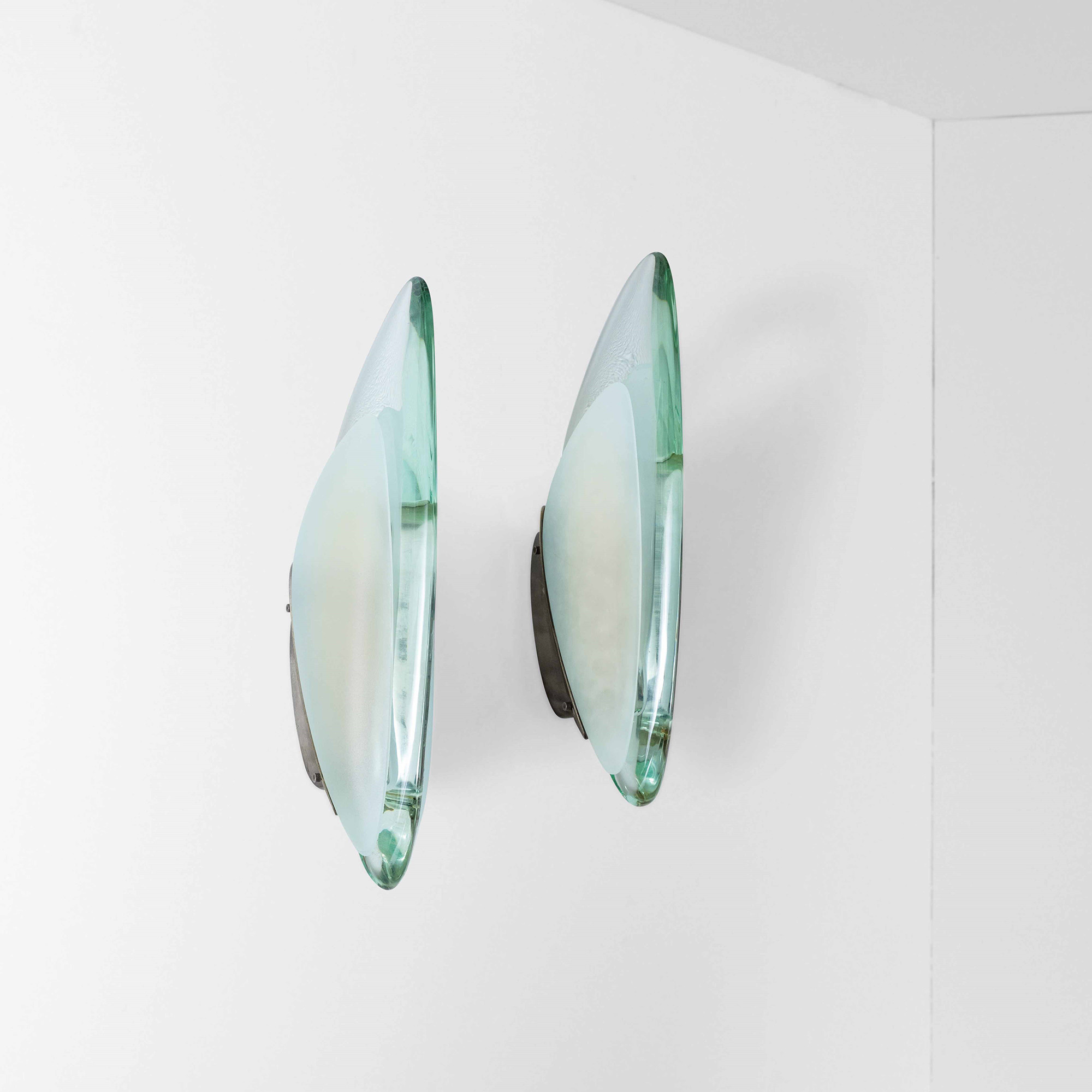 Struttura in ottone nichelato, diffusore a doppio schermo in cristallo satinato e corpo centrale in cristallo molato a lente. , Prod. Fontana Arte, Italia, 1950 ca., W. 10 - D. 20 - H. 40 Cm, Bibliografia, Quaderni Fontana Arte