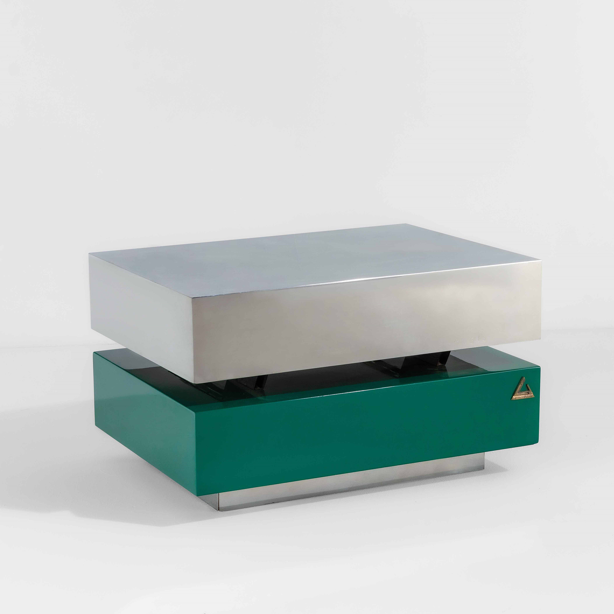 Struttura con piano scorrevole rivestito in acciaio e piano inferiore in legno laccato., Cassetto a scomparsa nel piano inferiore., Firma incisa. Numerazione incussa e marchio originale., Certificato di autenticità., Prod. Crespi, Italia, 1970 ca., tavolo chiuso 70x50x41; tavolo aperto cm 70x50x65, W. 70 - D. 50 - H. 41 Cm, Bibliografia, (a cura di) C. Cunacchia, Gabriella Crespi, Il segno e lo spirito, p. 66, Mondadori Electa, 2011