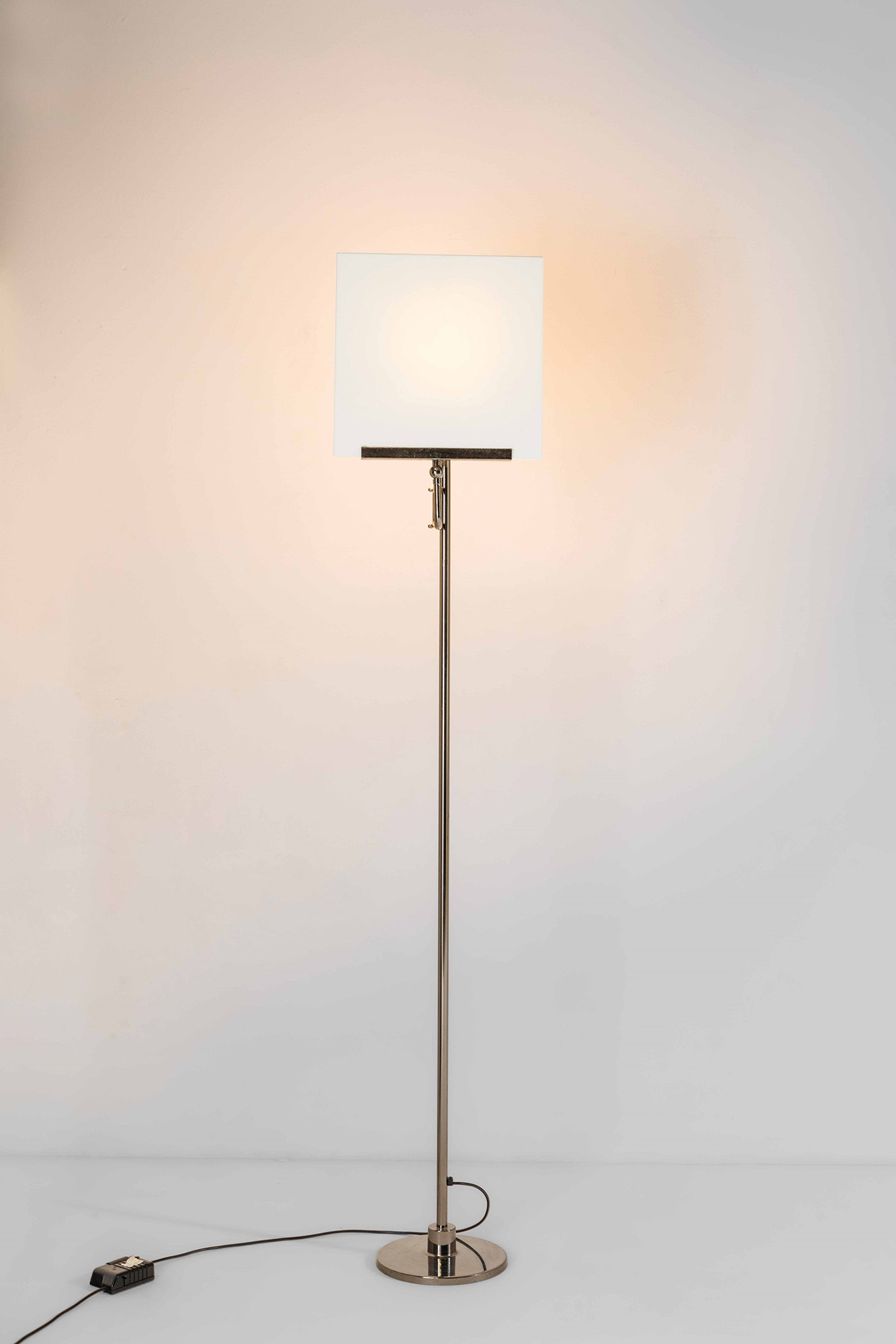 Struttura in metallo cromato e riflettore orientabile in vetro opalino. , Prod. Fontana Arte, Italia, 1980 ca., W. 21 - D. 36 - H. 180 Cm