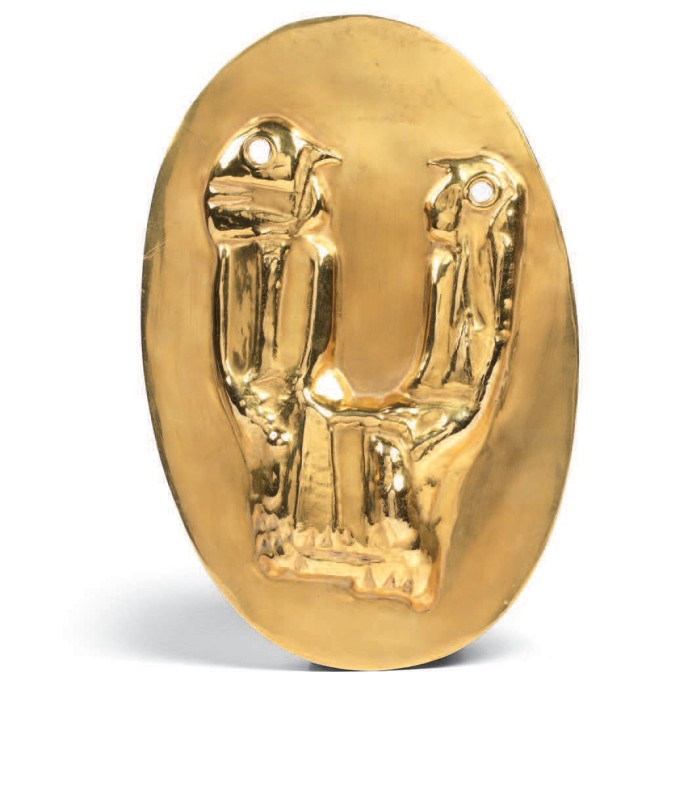 Max Ernst Brühl 1891 - Parigi 1976 Les oiseaux Gioiello in oro, es. 7/8, cm. 14,6x10, ovale Tiratura 7/8 e punzoni al verso. Esposizioni: Da Rodin al cielo di Yoko, Scultura in piccolo del XX secolo, Orosei, Centro culturale L'Ormeggio, 25 maggio - 25 settembre 2002, cat. pp. 74, 75, n. 30, illustrato a colori; Una collezione internazionale di piccole sculture del secondo Novecento, Malcesine, Castello scaligero, 11 giugno - 15 settembre 2005, cat. p. 35, illustrato a colori. In custodia originale in legno, cm. 19x20,5x3, con firma dell'artista e tiratura incise.