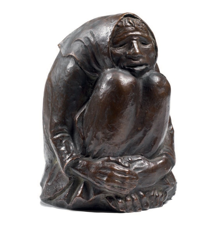 Ernst Barlach Wedel 1870 - Rostock 1938 Frierende Alte, 1939 Scultura in bronzo a patina scura, cm. 23,5 h. Firma su un lato: E. Barlach. L'autenticità dell'opera è stata confermata dal Fondo Barlach. Opera pubblicata sul sito www.ernst-barlach.com (illustrato esemplare in legno). Esposizioni: Grandi maestri, piccole sculture, da Depero a Beverly Pepper, a cura di Lara Vinca Masini, Pistoia, Palazzo Sozzifanti, 6 aprile - 30 giugno 2013, cat. p. 24, illustrata a colori. Da un gesso del 1937, realizzata in massimo 15 esemplari. Bibliografia: P. Schult, Ernst Barlach. Das Plastische Werk, Dr. Ernst Hauswedell & Co., Amburgo, 1960, n. 480.