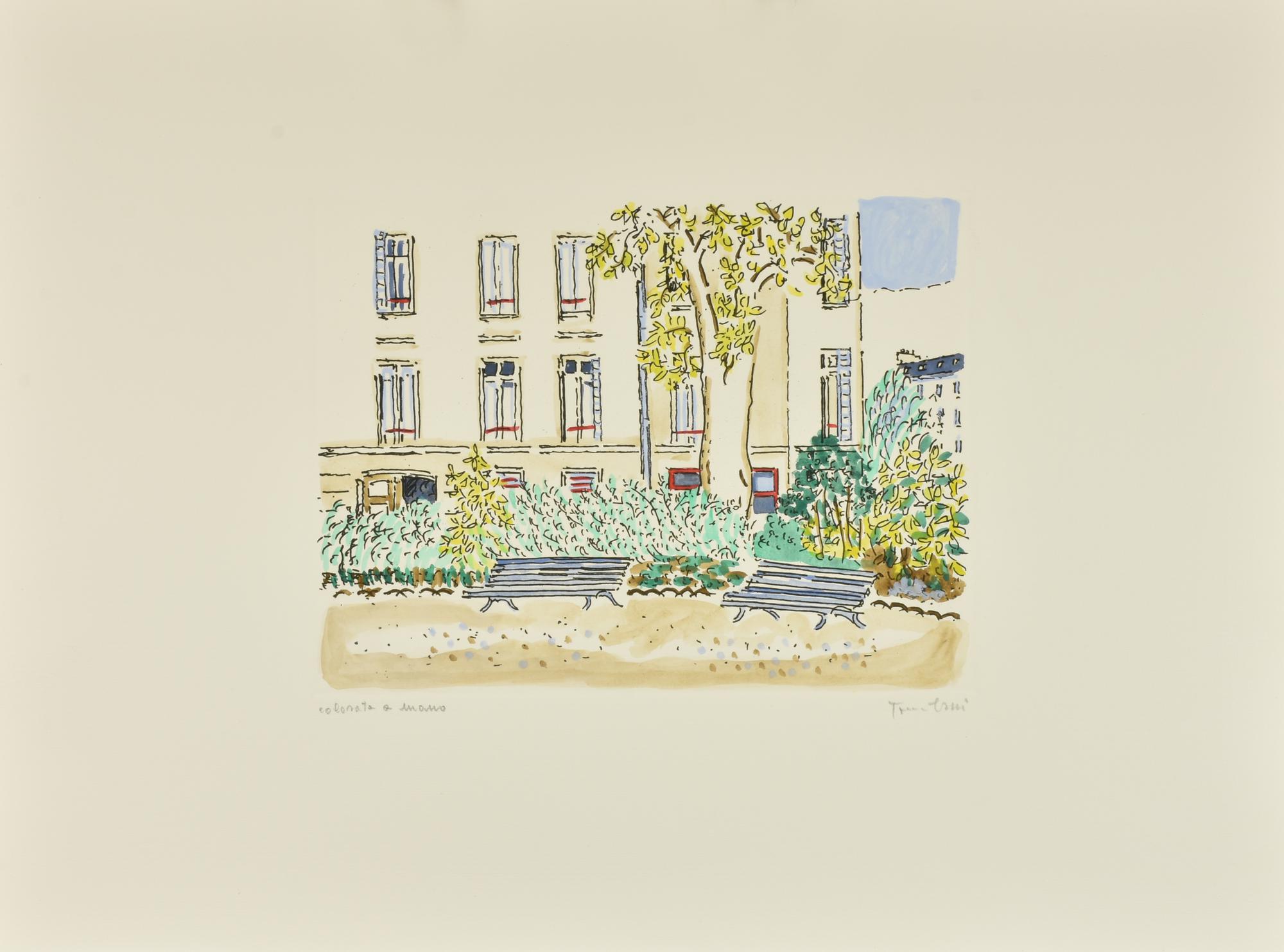 Orfeo Tamburi GIARDINO PARIGINO incisione su carta colorata a mano, battuta...