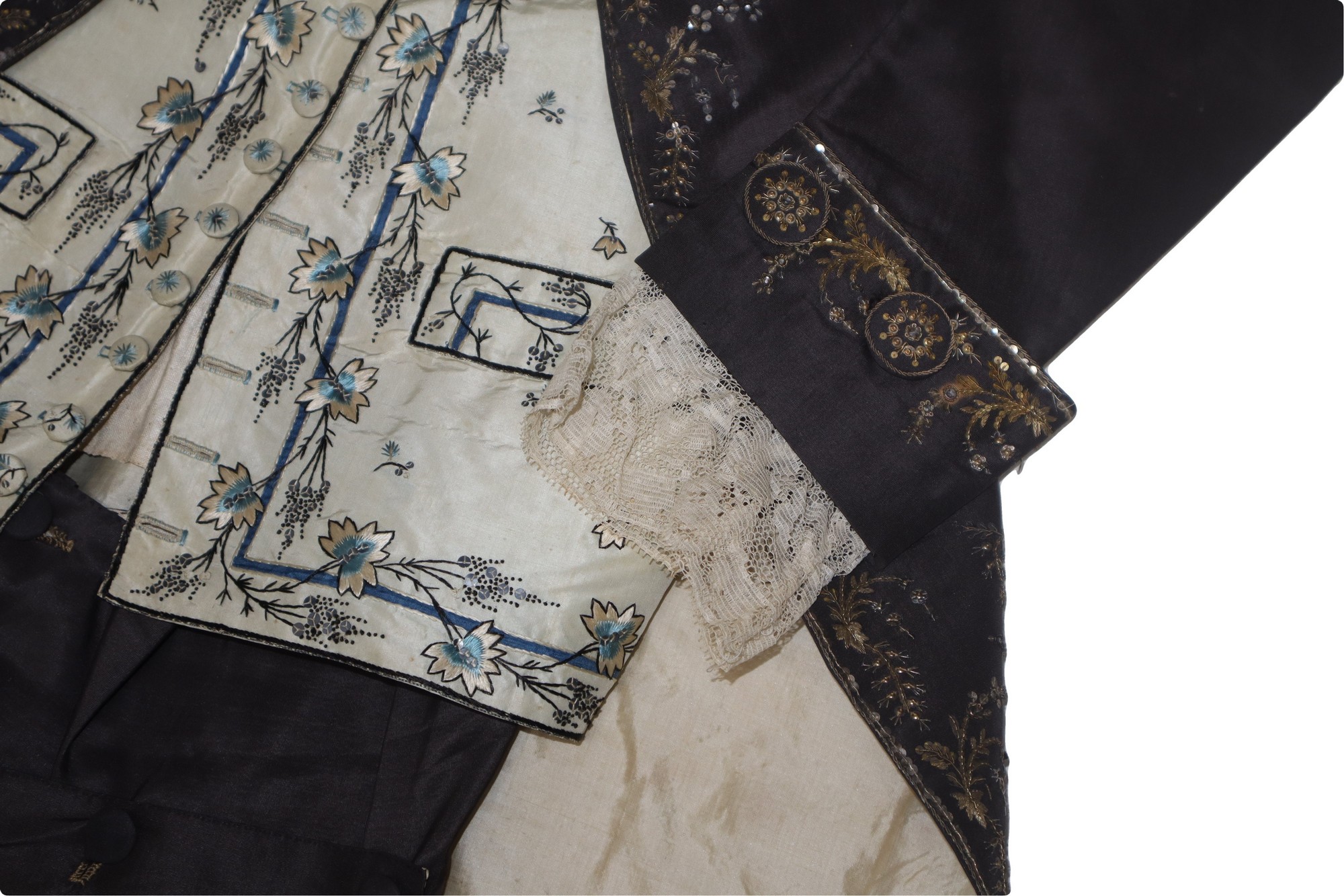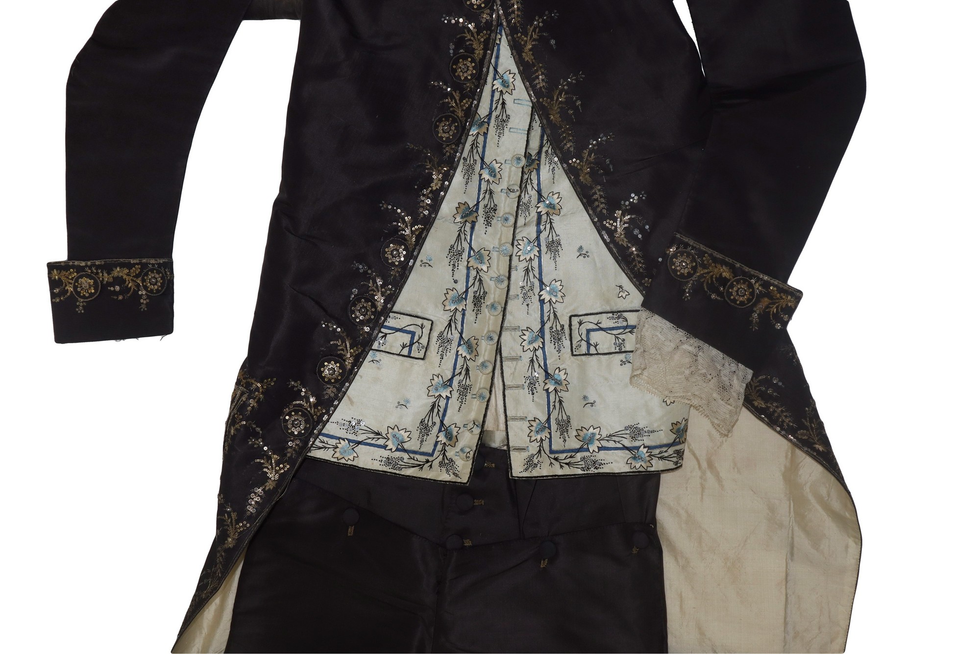 Abito intero composto da marsina, sottomarsina e pantaloni, XVIII Secolo In seta, ricamati a mano con pailettes