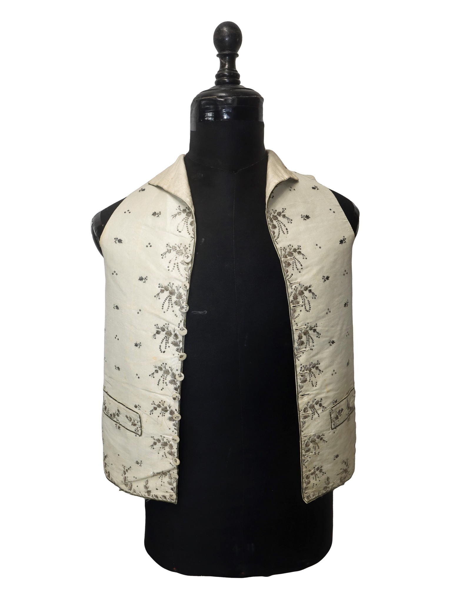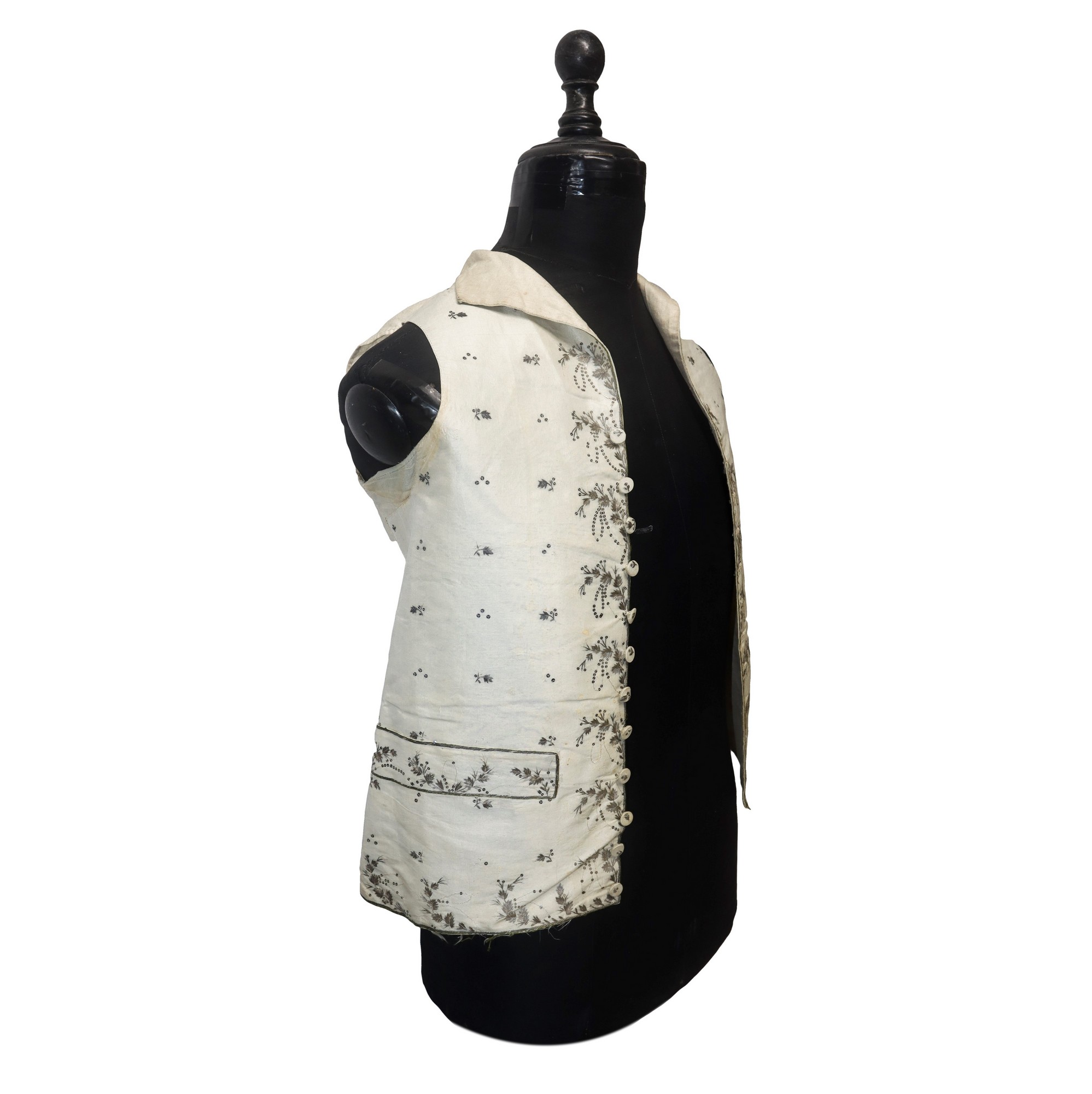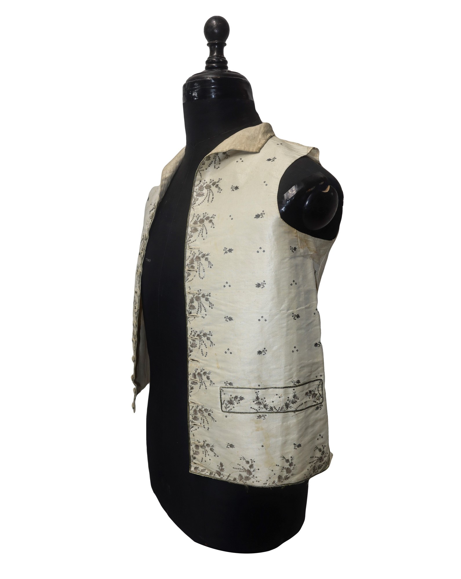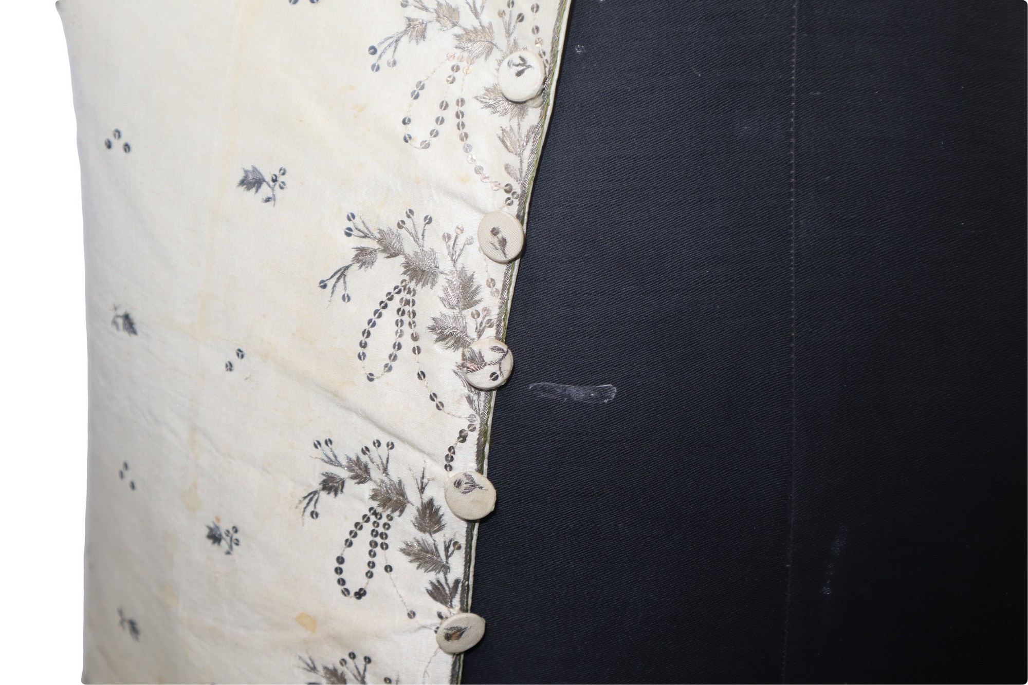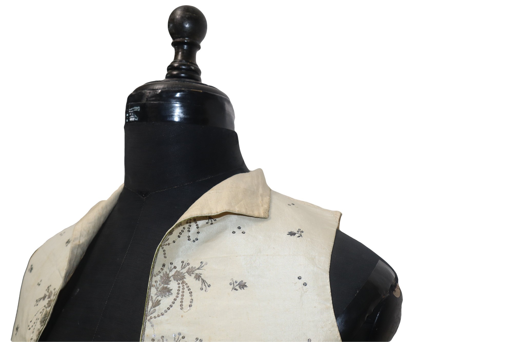 Gilet da donna con taschino, fine 18° Secolo In seta ecru, con ricami in argento e paillette a motivi floreali