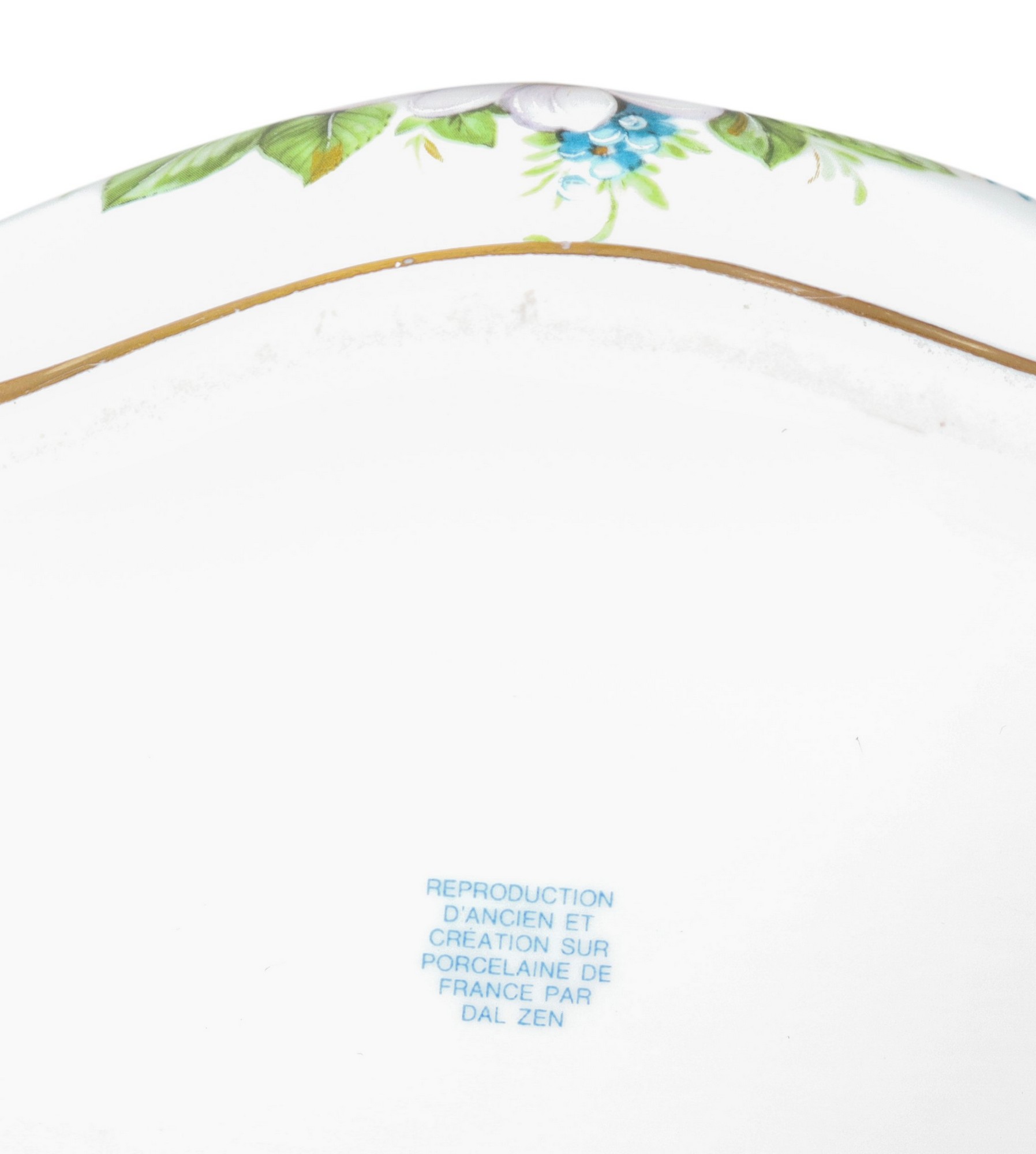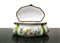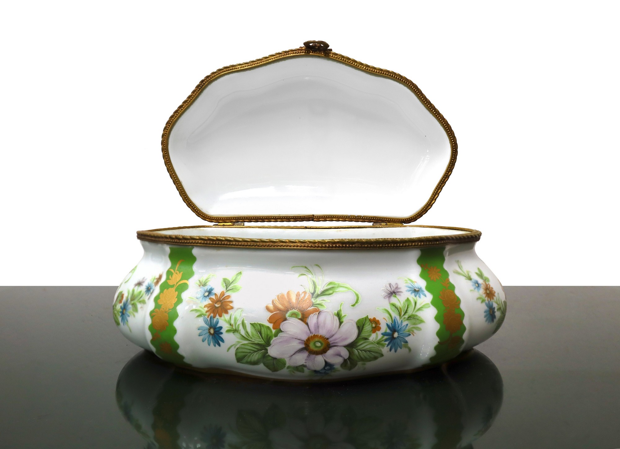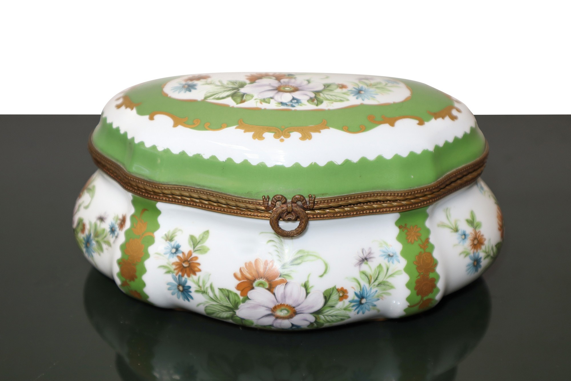 Scatola con coperchio in porcellana, inizi 20° Secolo h cm 10 x cm 20 x cm 13 Dal Zen (9), decorata con decori floreali e bordi in ottone dorato