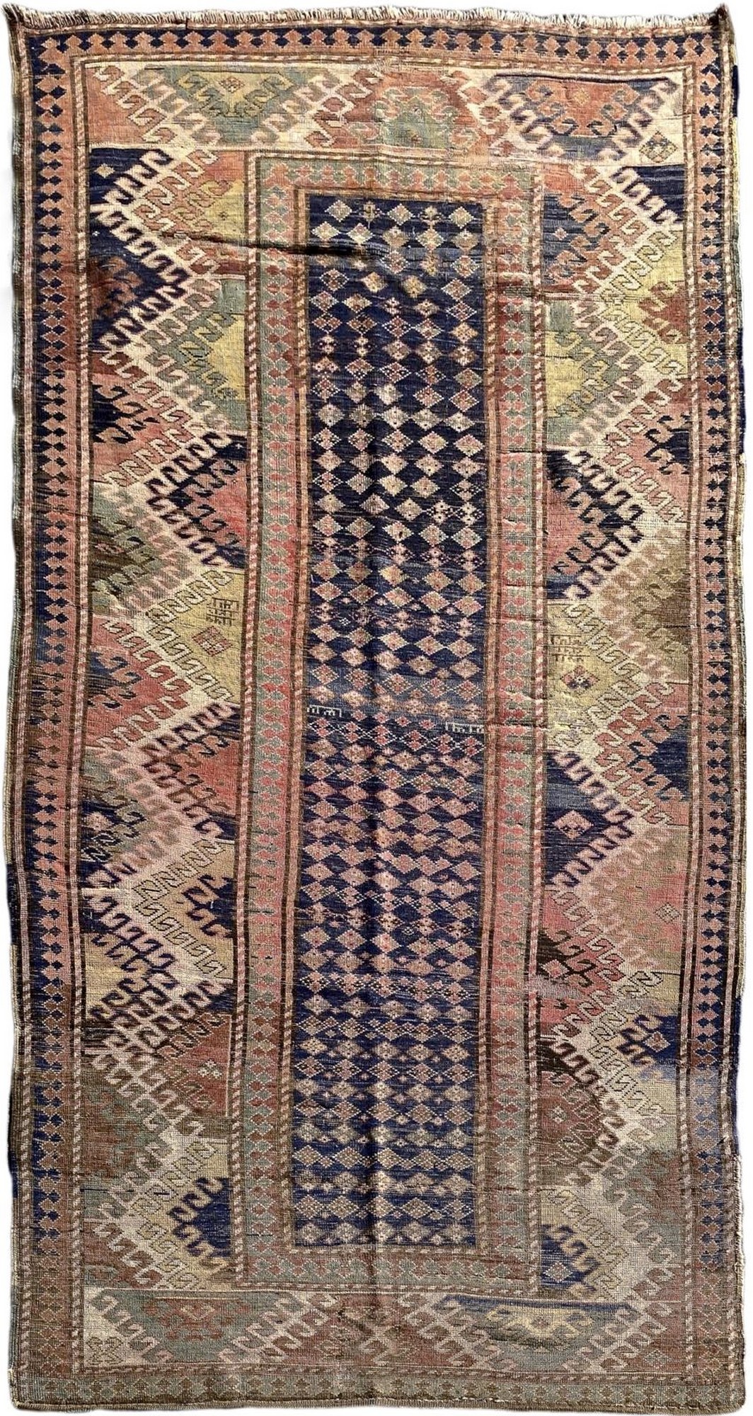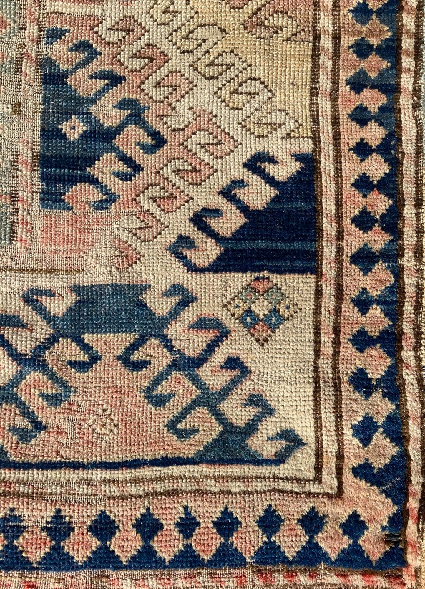 Tappeto Kazak Bordjalou, inizi 1900 cm 280x128 Caucaso sud occidentale. Ordito, trama e vello in lana, coloranti naturali e anilinici, zone consunte.
