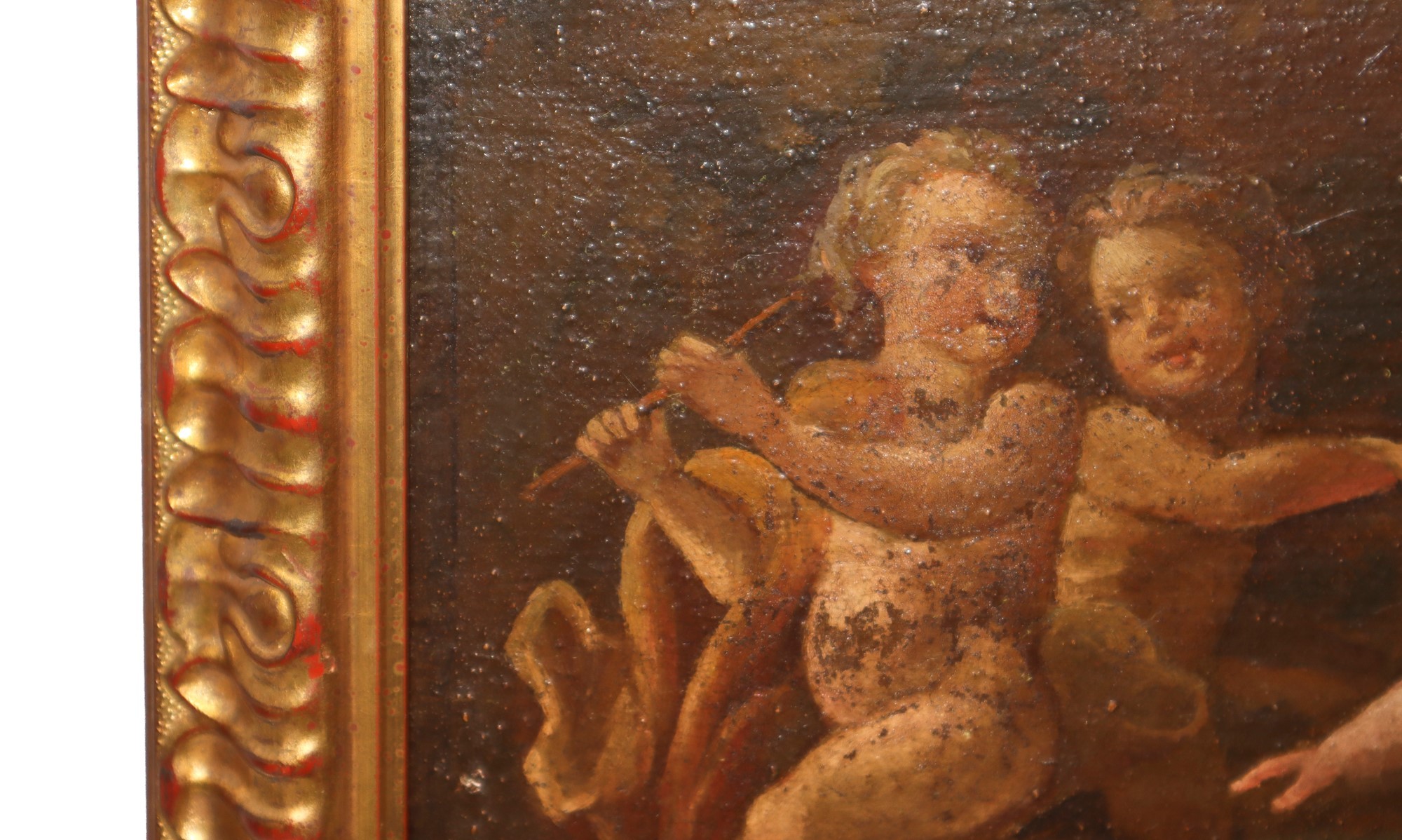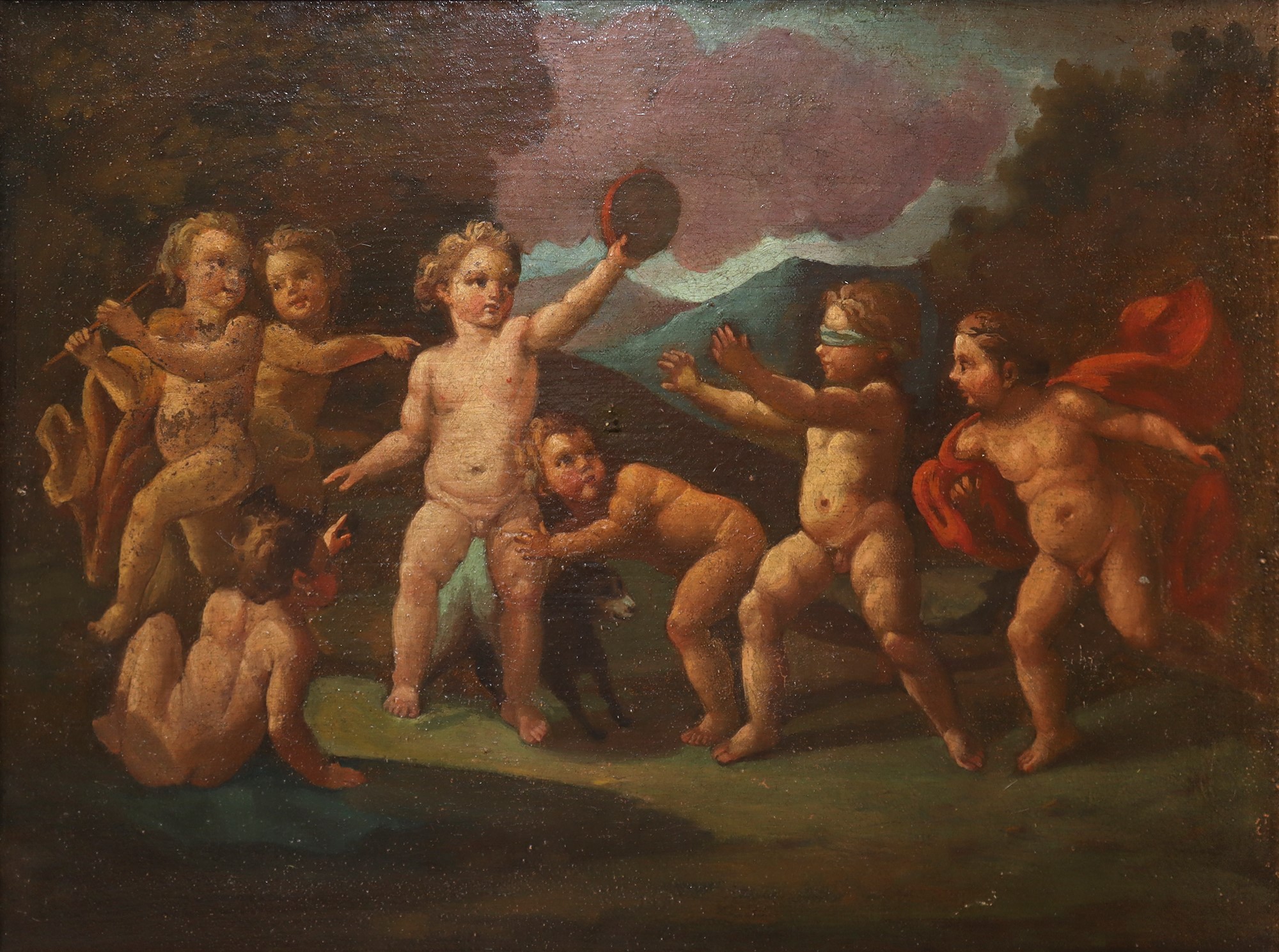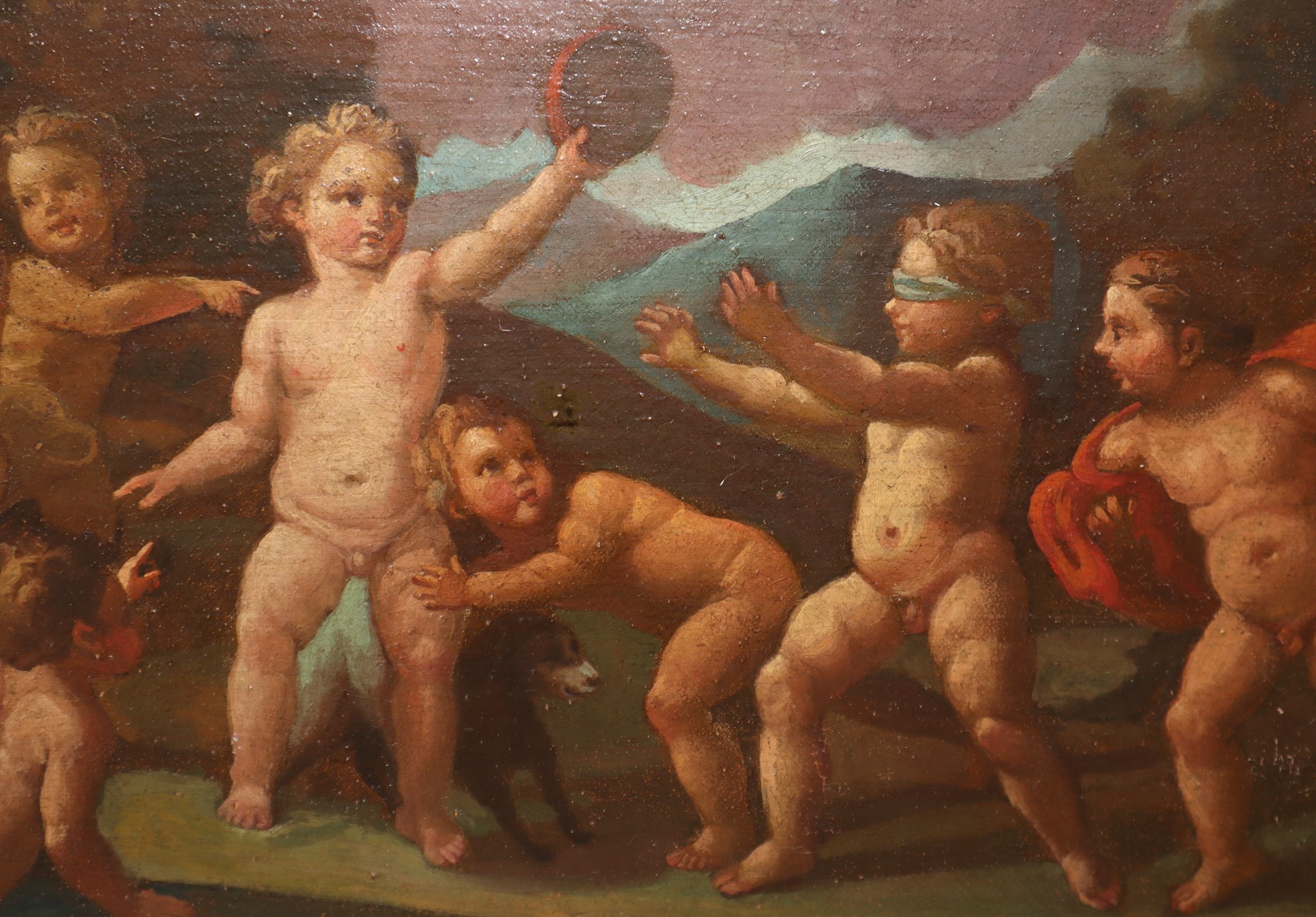 Gioco di putti, XVIII Secolo cm 37 x cm 49; in cornice cm 45 x cm 57 Dipinto ad olio su tela