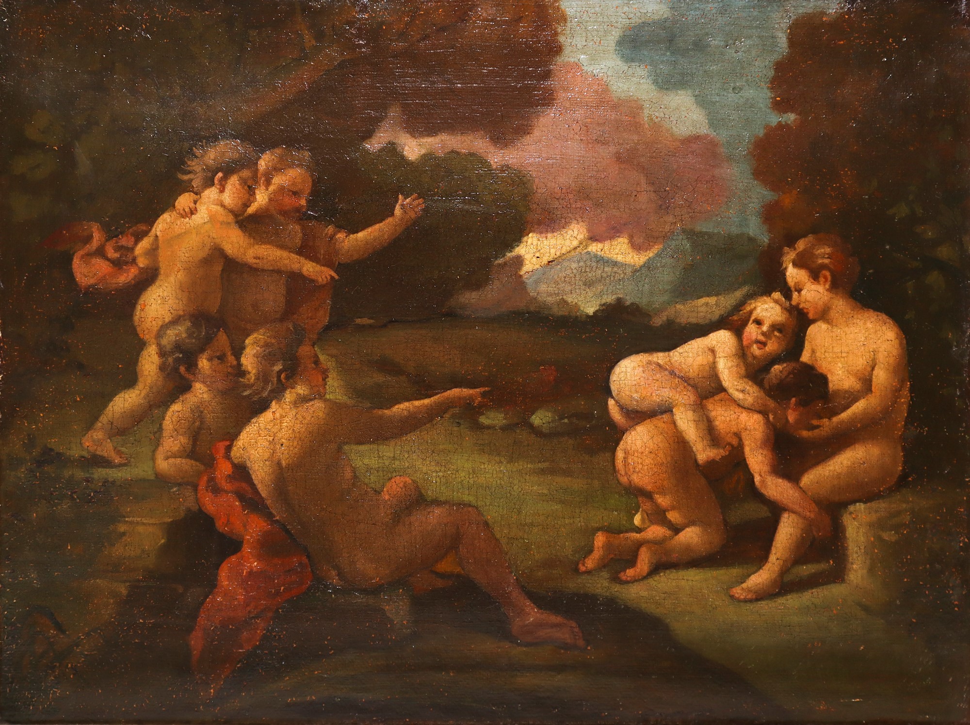 Gioco di putti, XVIII Secolo cm 37 x cm 49; in cornice cm 45 x cm 57 Dipinto ad olio su tela