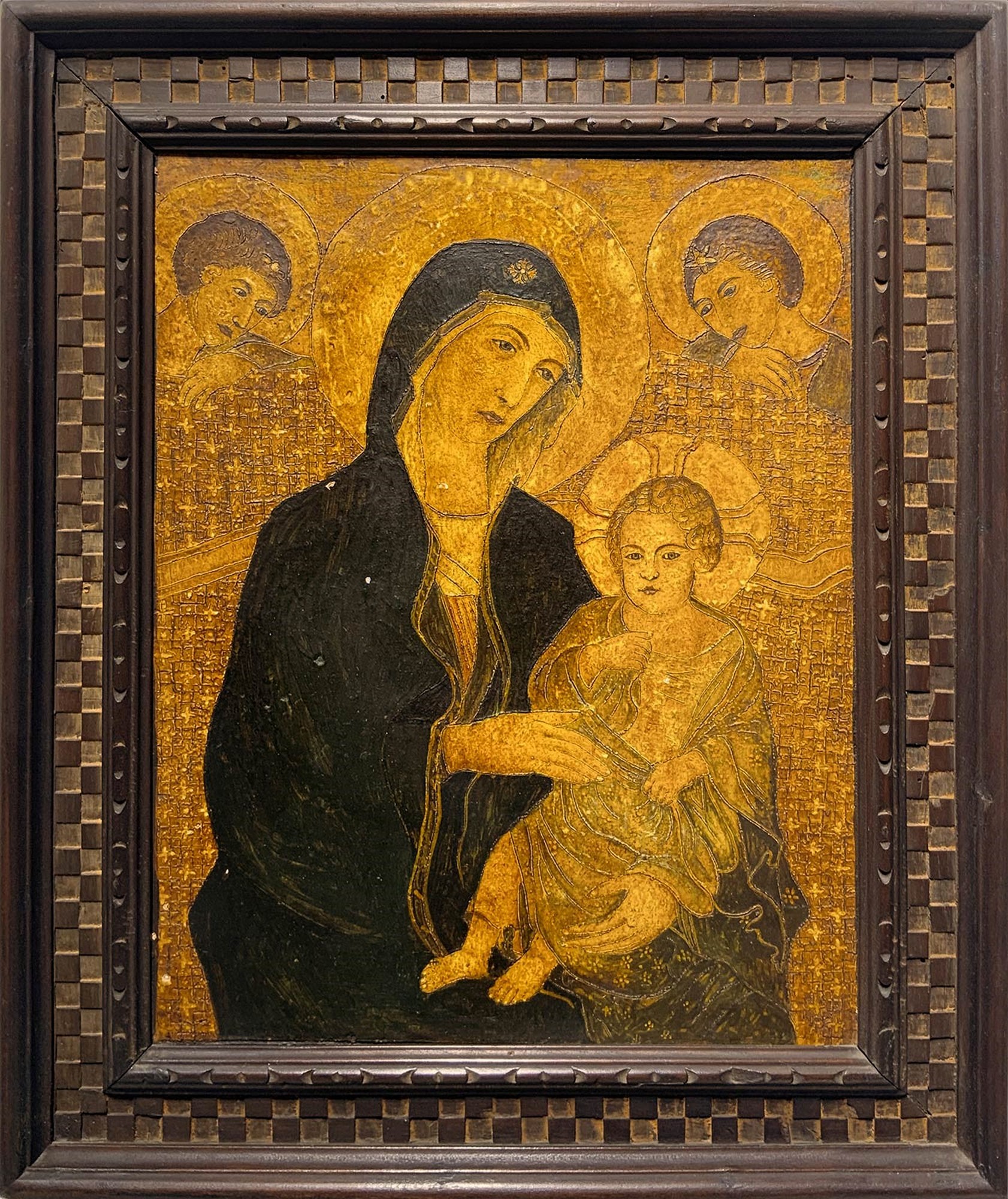 Madonna con Gesù Bambino e Angeli, inizi 20° Secolo cm 37,5 x cm 29 tempera su terracotta Tratta da Duccio da Buoninsegna Manifattura Milani, Montopoli in Val D'Arlo, Decoratore Campani P.
