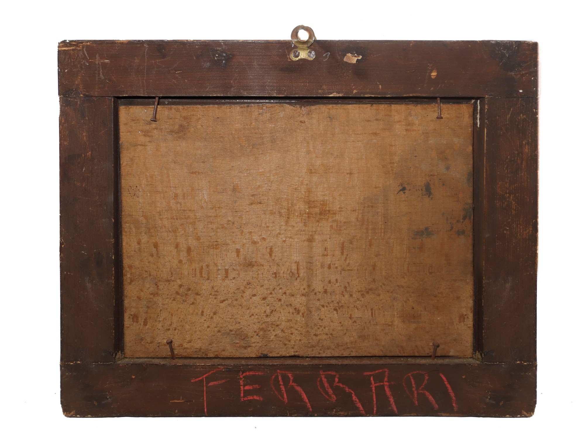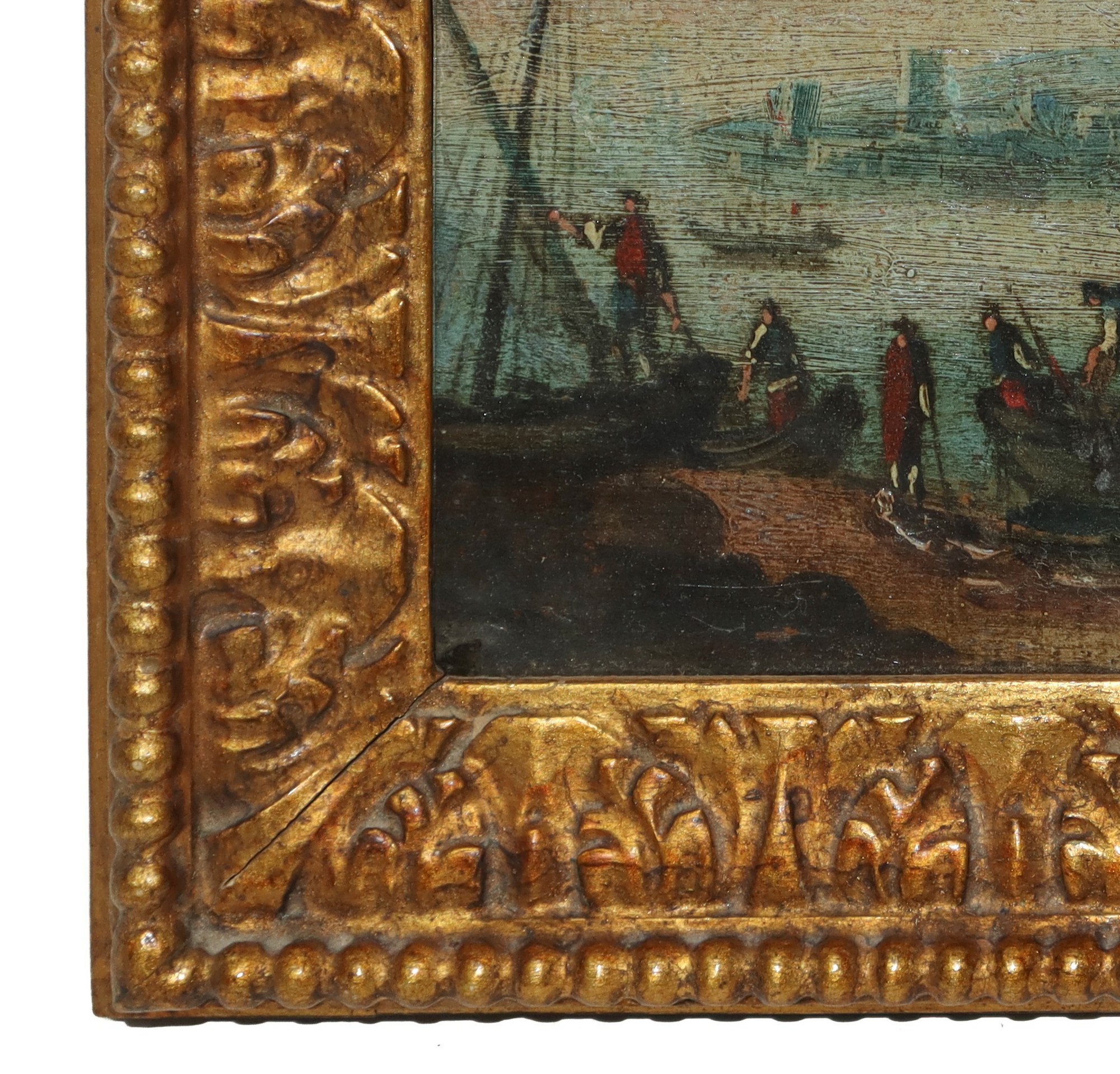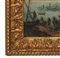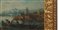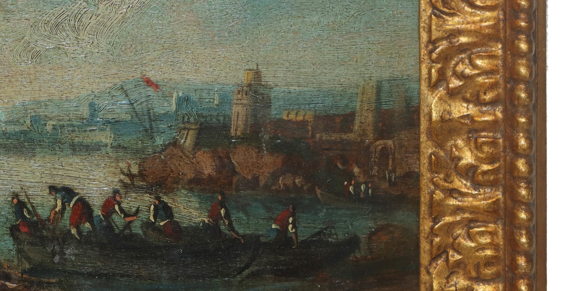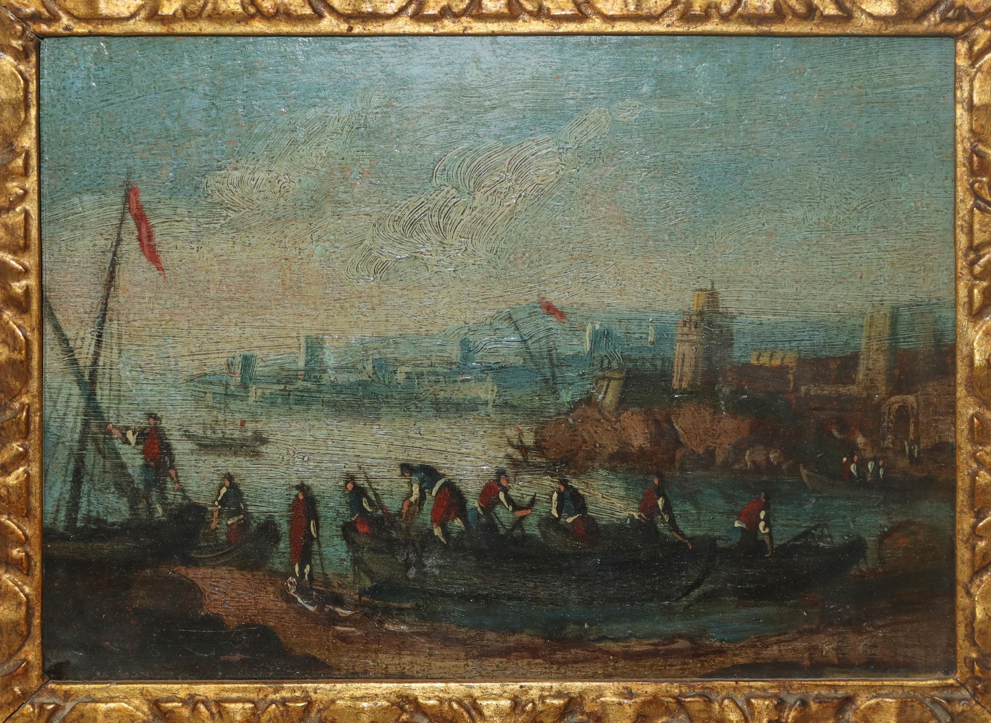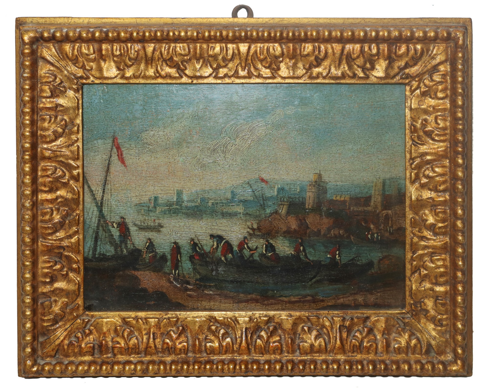 Barche in porto con fortificazioni e torri, fine 19° Secolo cm 15 x cm 21, in cornice cm 22 x cm 28 olio su tavoletta