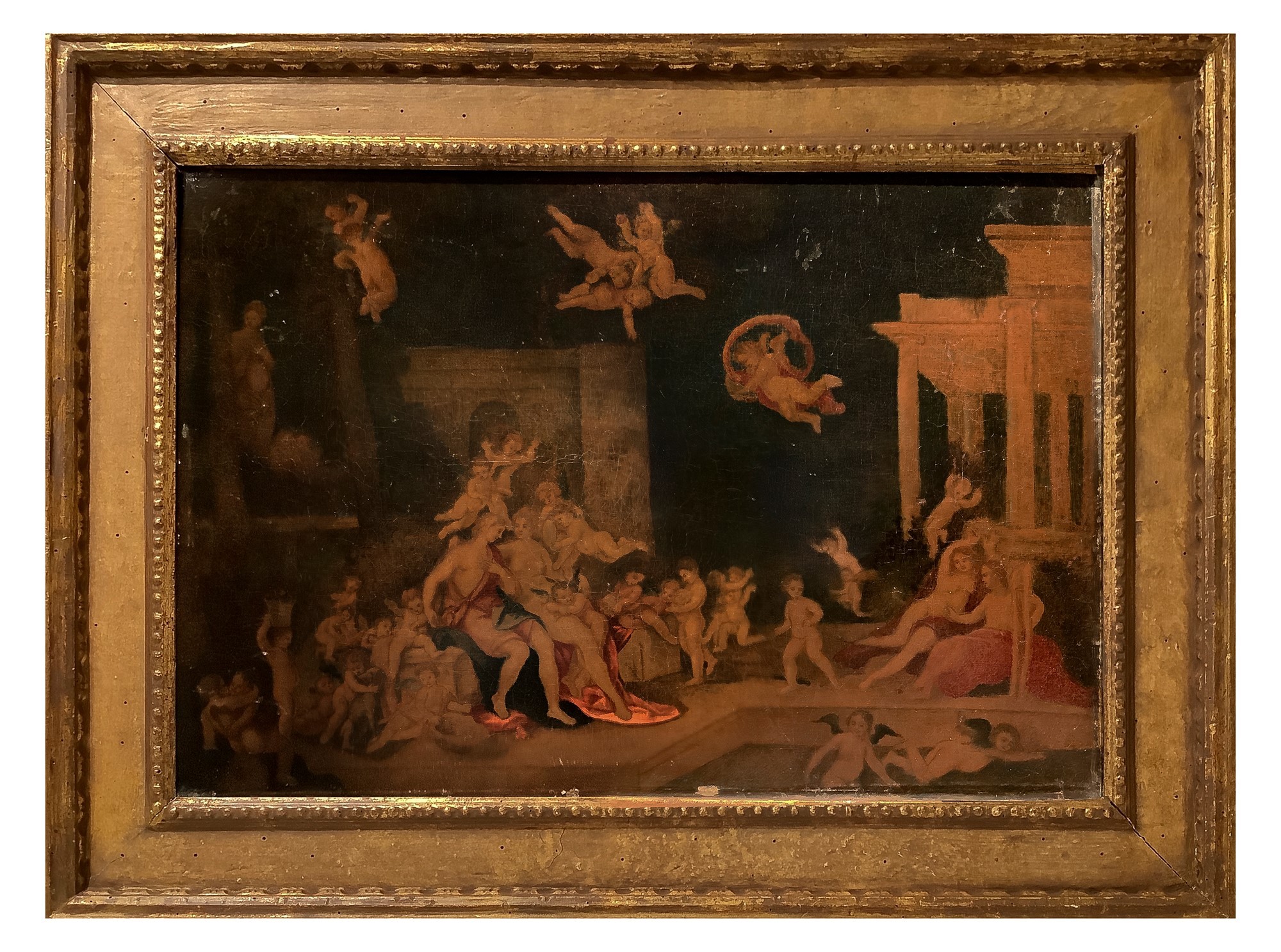Dipinto raffigurante scena di corteggiamento con Diana, ninfe e putti, inizi 20° Secolo