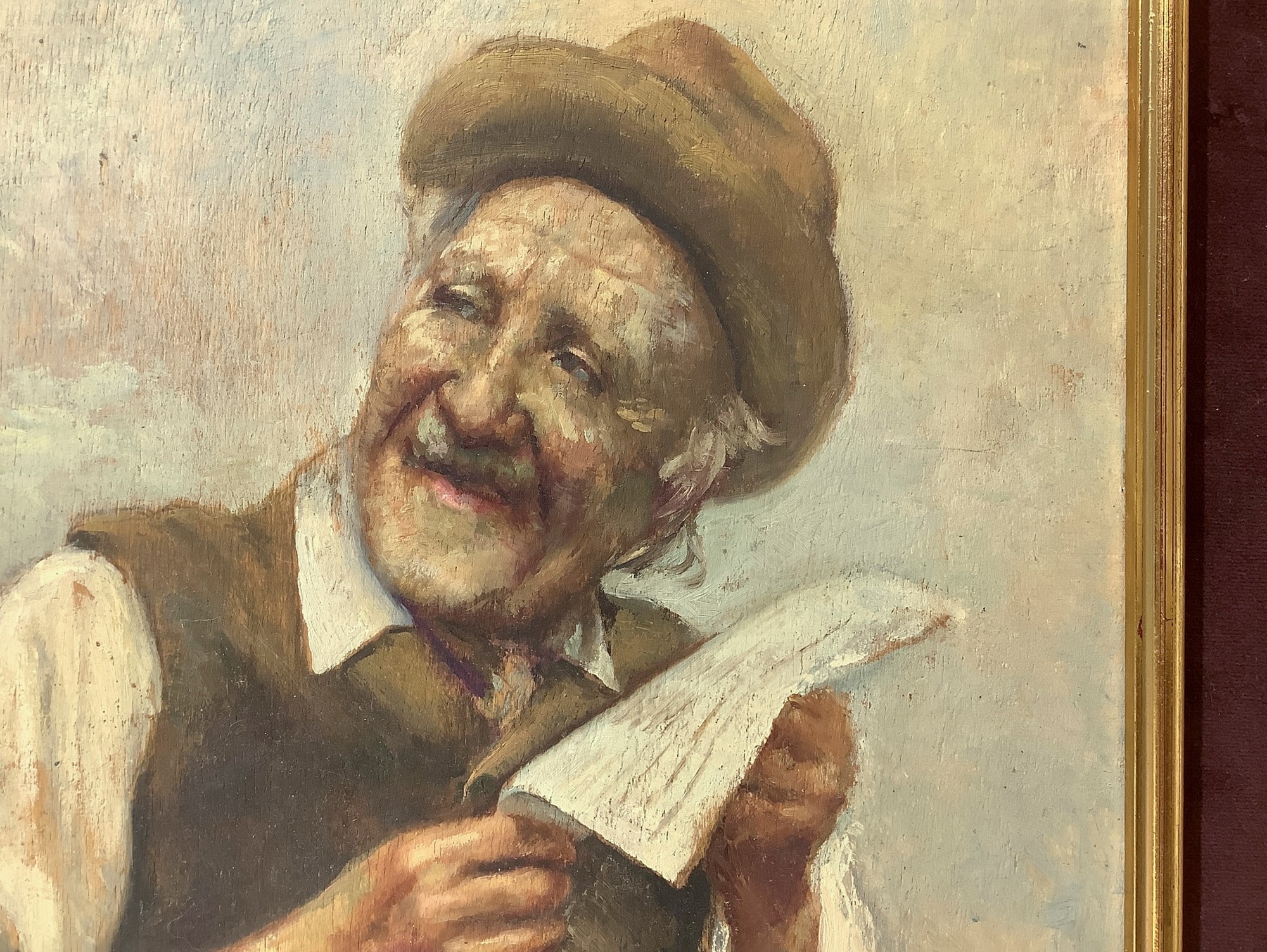 Vecchio con lettera, nineteen° Secolo H 30 cm x Base 24 cm. In cornice: H 45 cm x Base 39 cm Dipinto ad olio su tavoletta Pittore napoletano del XIX secolo