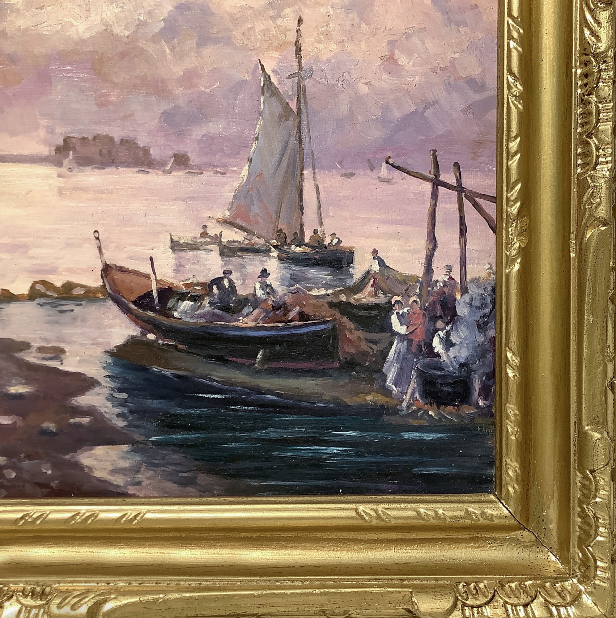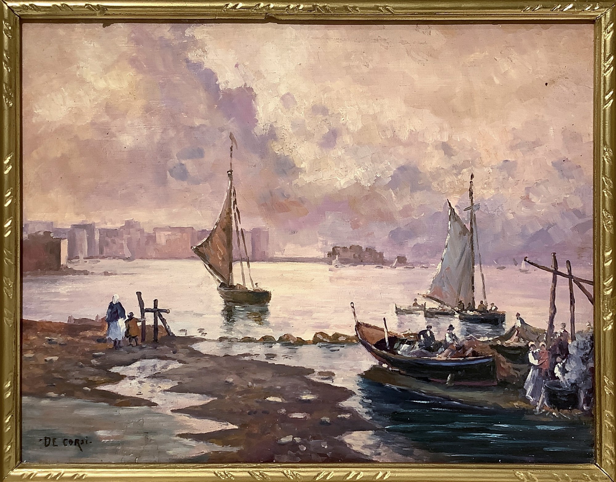 Nicolas De Corsi (Odessa 1882-Torre del Greco 1956) - Marina con barche, 20° Secolo H 36 cm x 45 cm. In cornice: H 47 cm x 57 cm Dipinto ad olio su tavoletta Firmato in basso a sinistra "DE CORSI".
