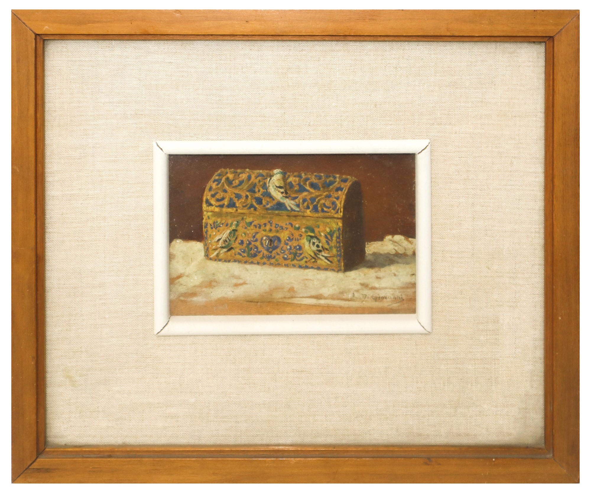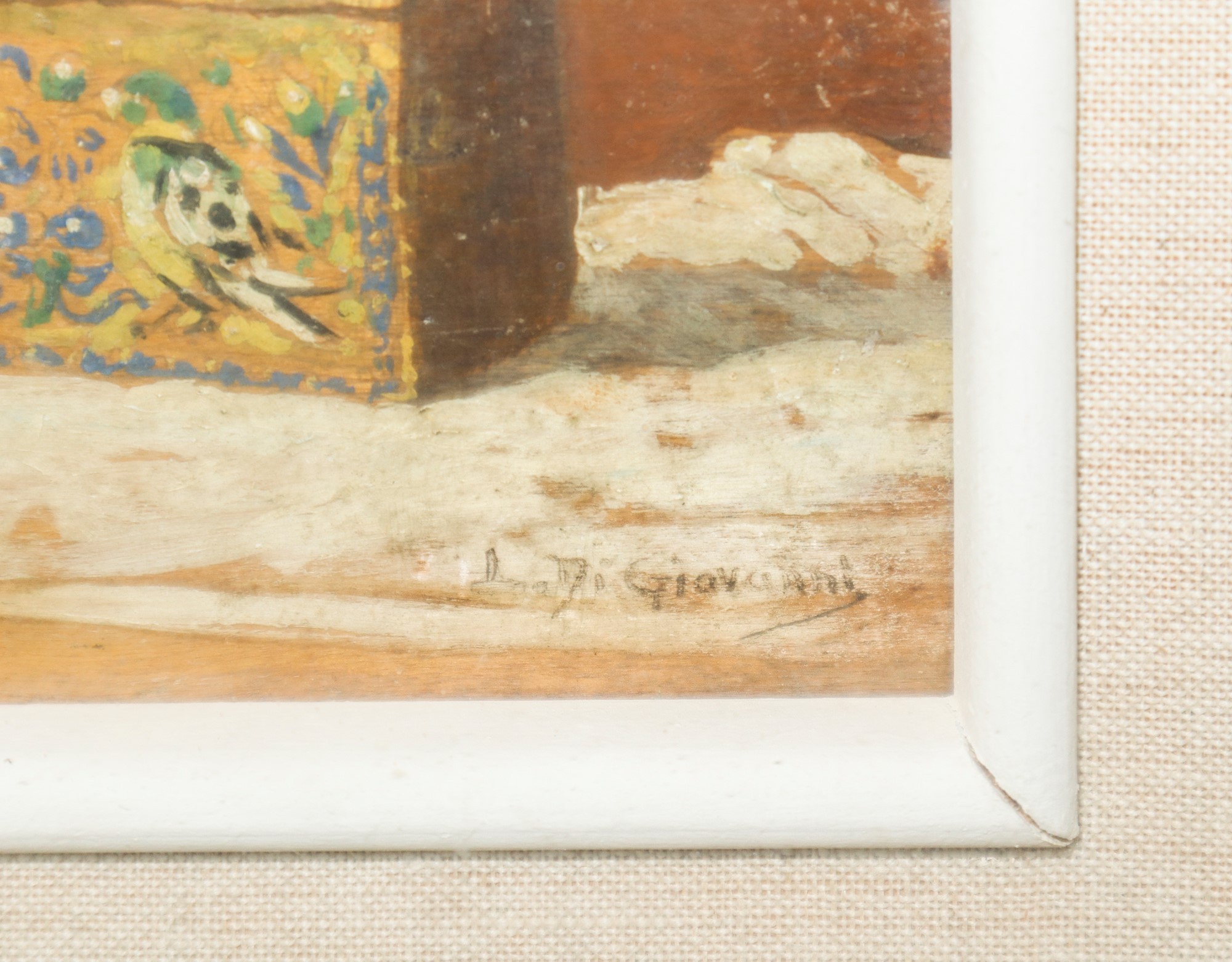 Luigi Di Giovanni (Palermo 1856-Palermo 1938) - Scrigno Cm 10x13, in cornice 24x28 Dipinto ad olio su tavoletta Firmato in basso a destra e sul retro