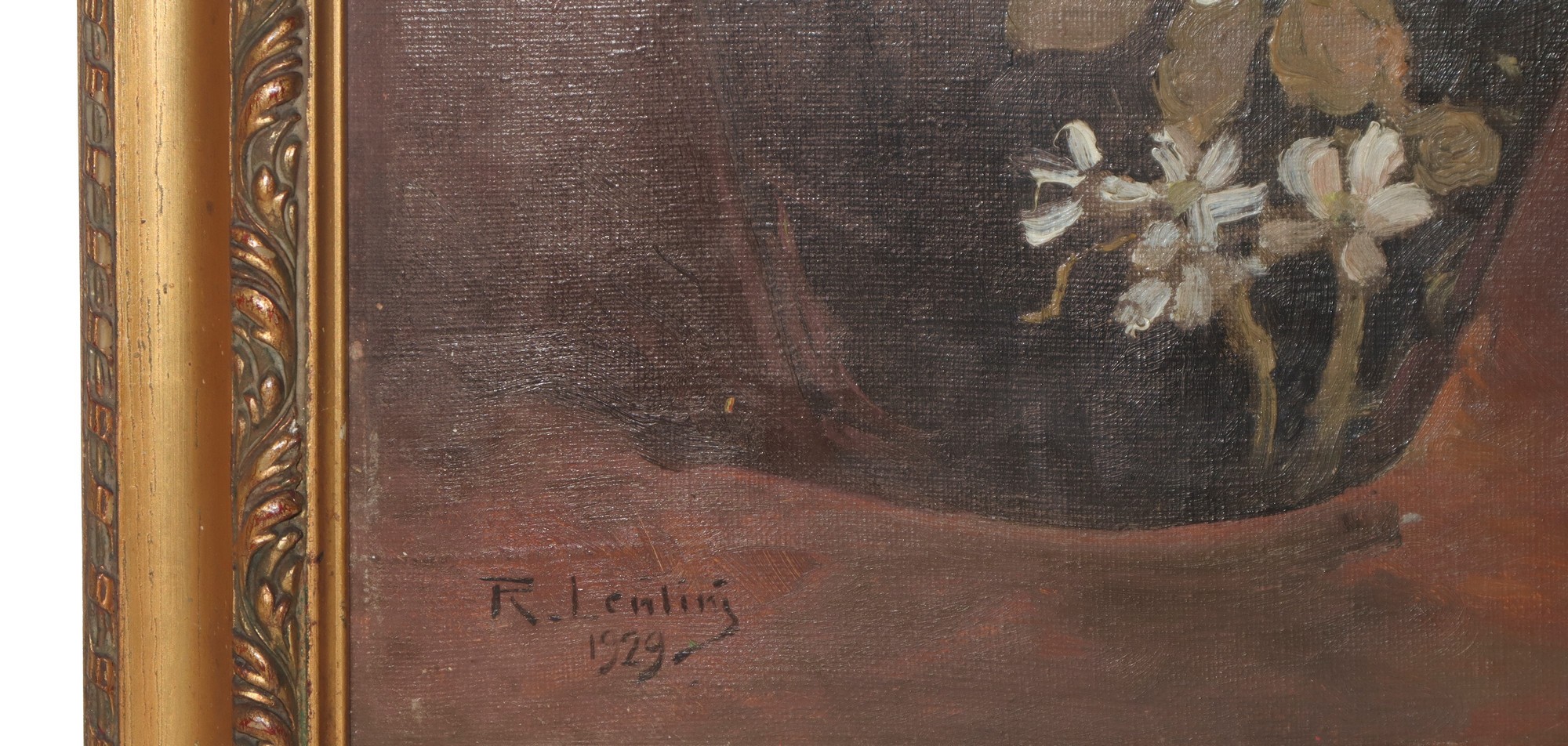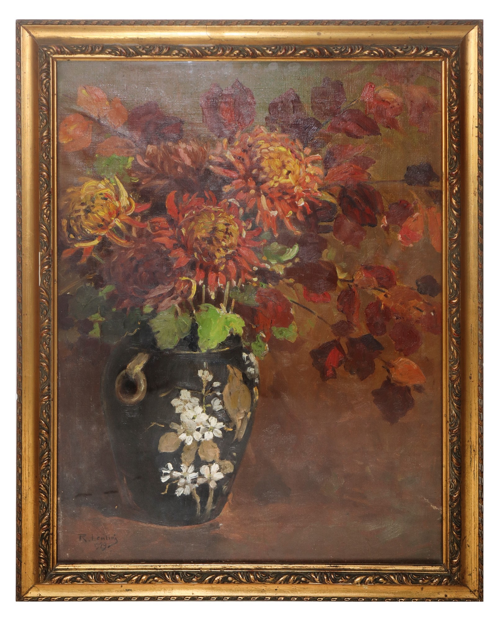 Rocco Lentini (Palermo 17/10/1858-Venezia 20/10/1943) - Crisantemi rossi, 1929 cm 59.5 H x 45 L Rocco Lentini nasce a Palermo il 17 febbraio 1858. Da giovane frequenta le scuole serali per aiutare il padre, decoratore apprezzatissimo, nell'attività che svolge nei palazzi Nobiliari di Palermo e nel teatro Carolino. A 15 anni entra nello studio di Francesco Lojacono, l'influenza generata dal paesaggista, sfocia nella creazione delle sue prime opere ''Il portale'', ''Piazza Pretoria'' ed ''Il palazzo degli Eremiti''. Nel corso della sua vita partecipa attivamente alla vita culturale siciliana, realizzando alcune delle imprese più importanti nella propria città natale, tra le quali le decorazioni e gli affreschi per i teatri Massimo, Politeama, Bellini, per la Stazione centrale e per gli interni di palazzo delle Aquile. Organizza anche la "I mostra siciliana di pittura, scultura bianco e nero", tenutasi a villa Gallidoro, oltre che essere il fondatore e uno dei direttori del mensile ''La Sicilia artistica e archeologica''. Insieme alle numerose esposizioni nazionali e internazionali, come a Roma nel 1929 presso la Casa d'Arte Baldi, prende parte alle Biennali di Venezia del 1905 e del 1922. Artista che spazia fra pittura, incisioni, scenografie, illustrazioni e decorazioni, muore a Venezia il 20 novembre 1943 nella sua casa di Dorsoduro.