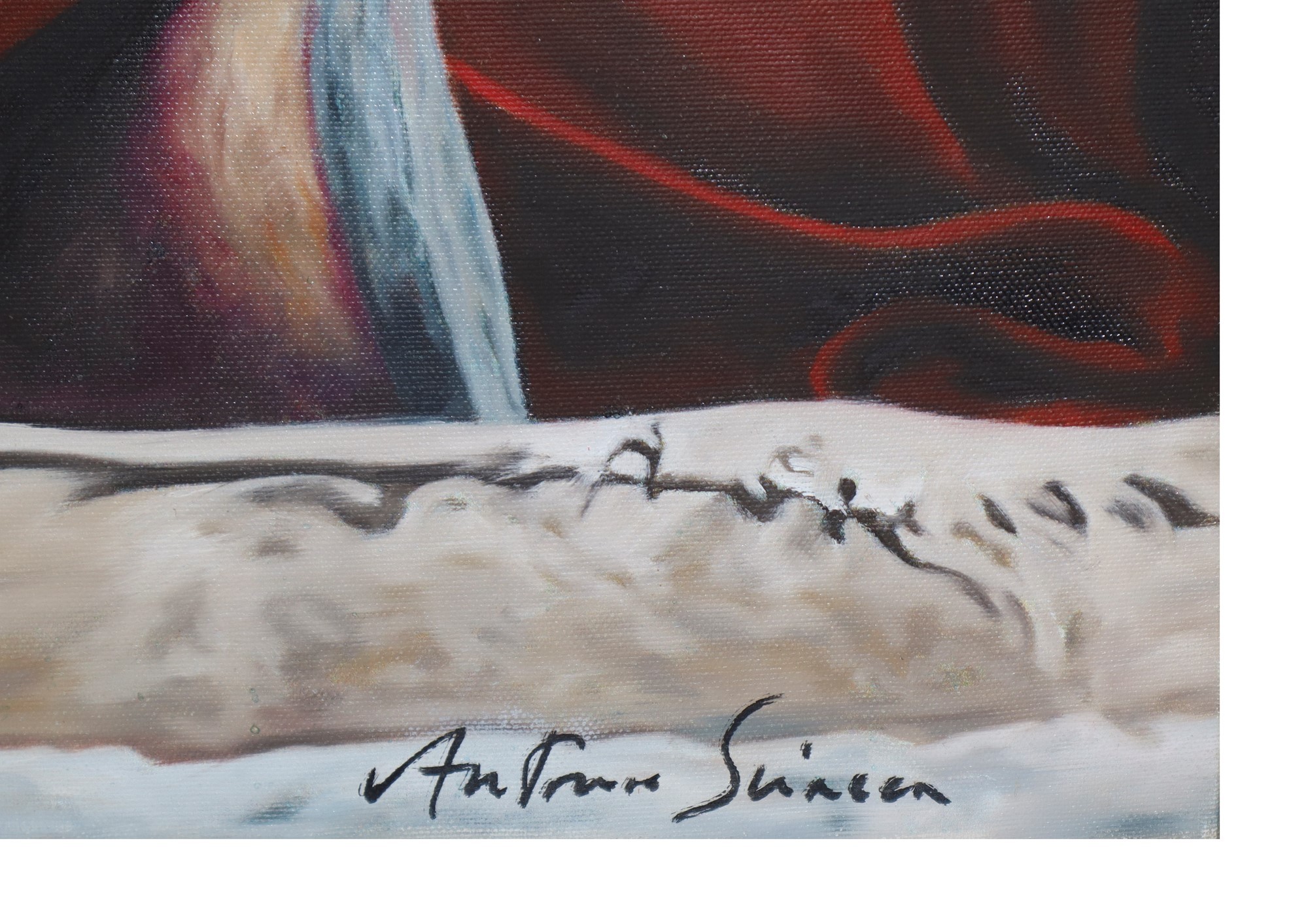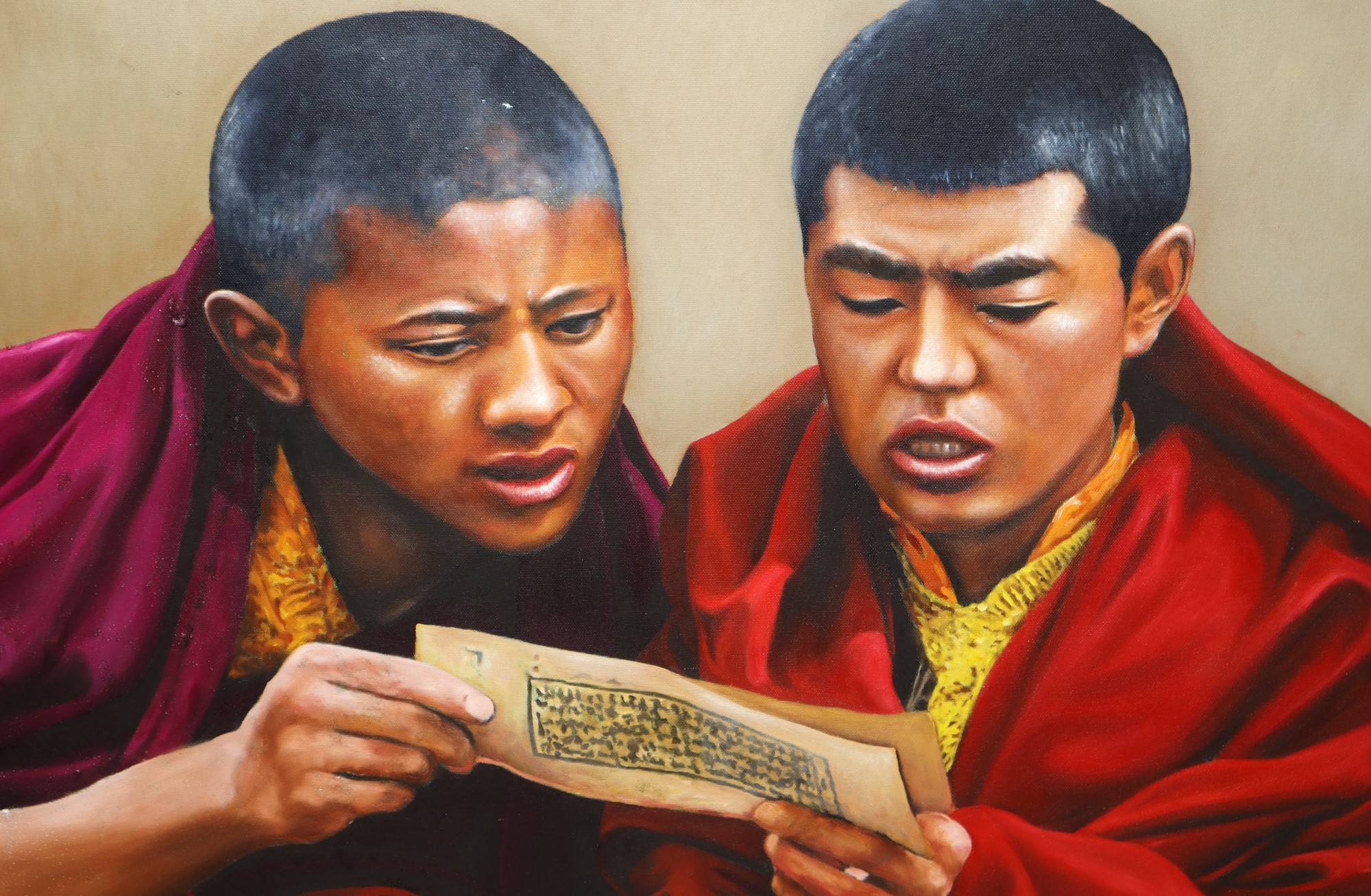 Antonio Sciacca (Catania 1957) - Monaci tibetiani cm 100 x cm 100 Olio su tela Firmato in basso a destra e sul retro, opera sprovvista di cornice.