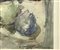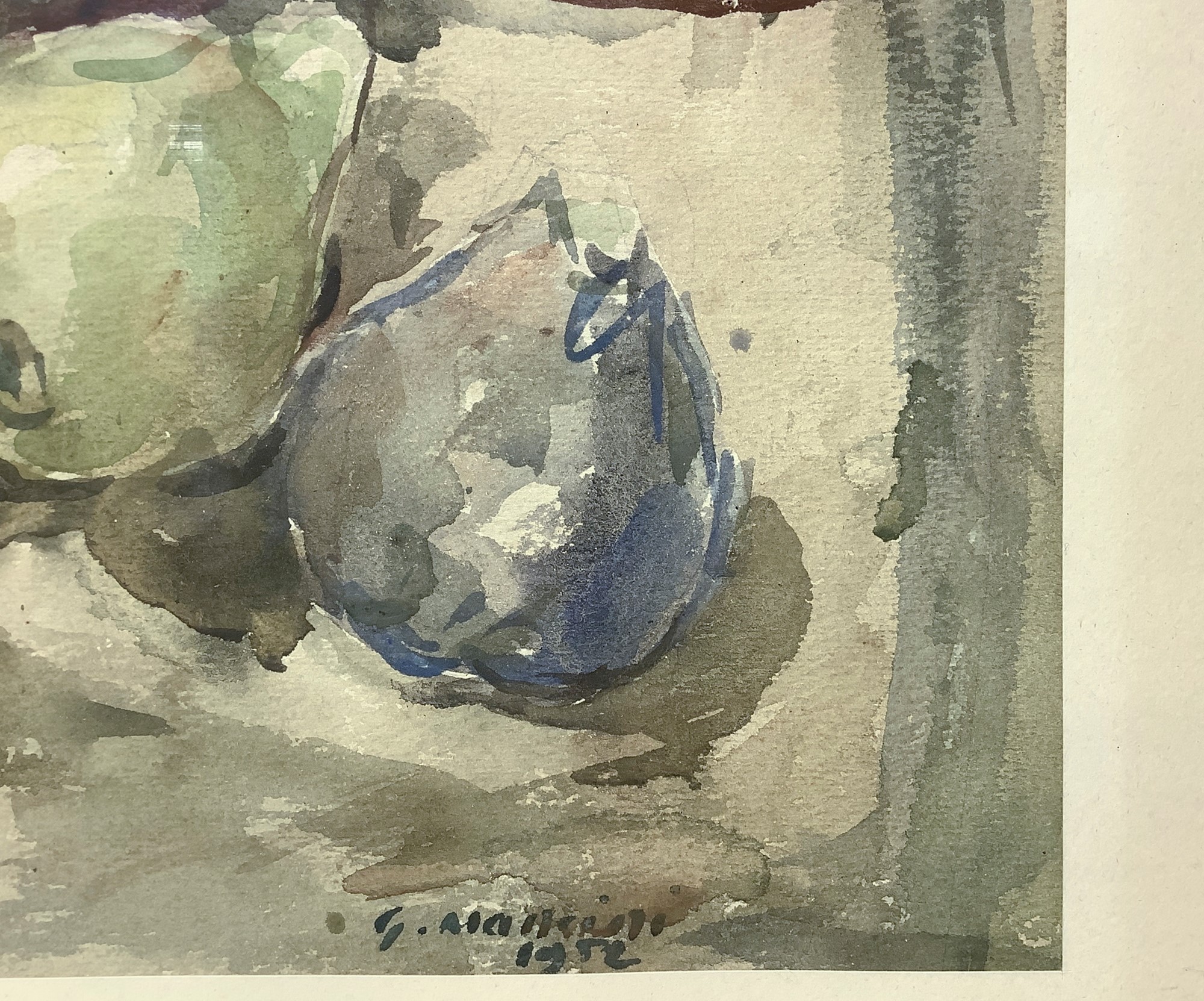 Giovanni Mancini (Foggia 1902-Manfredonia 1984) - Natura morta con pere e stoviglie, 1952 H 51cm x Base 61 cm. In cornice: H 58 cm x Base 68 cm Acquerello su cartoncino Firmato e datato in basso a destra "G. Mancini 1952".