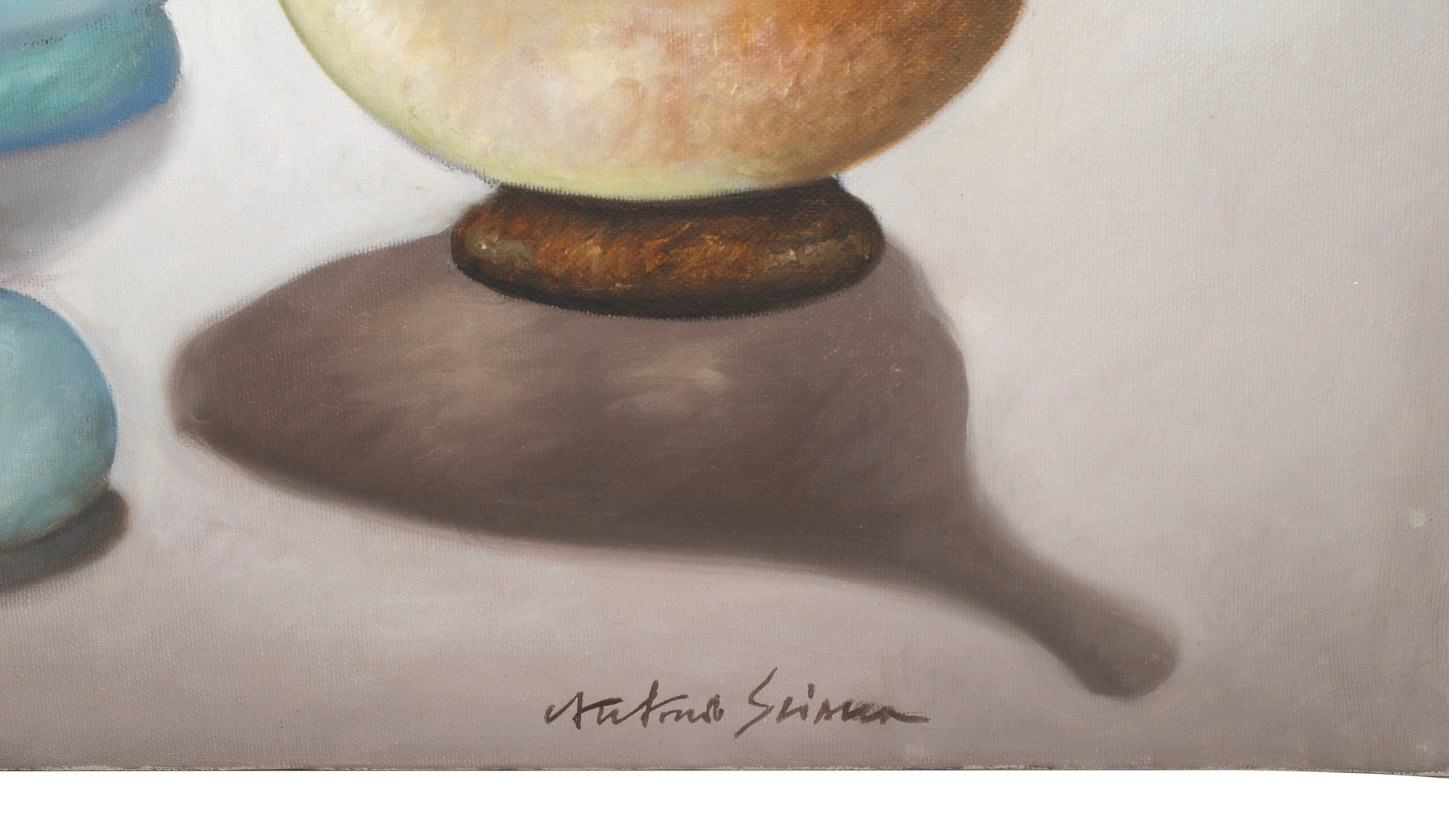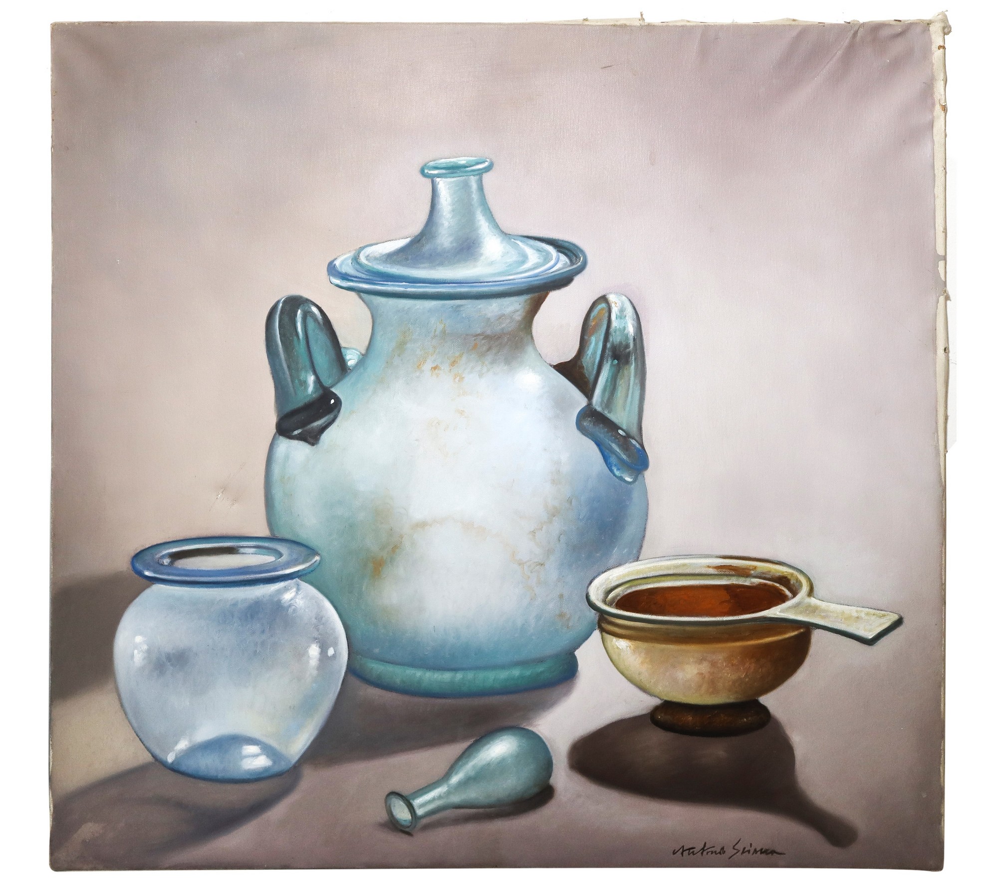 Antonio Sciacca (Catania 1957) - Natura morta di vetri, 1997 Cm 70x70 Dipinto a olio su tela Firmata in basso a destra e sul retro. Recante dicitura "Appartenente al movimento del Metropolismo". Opera sprovvista di cornice.