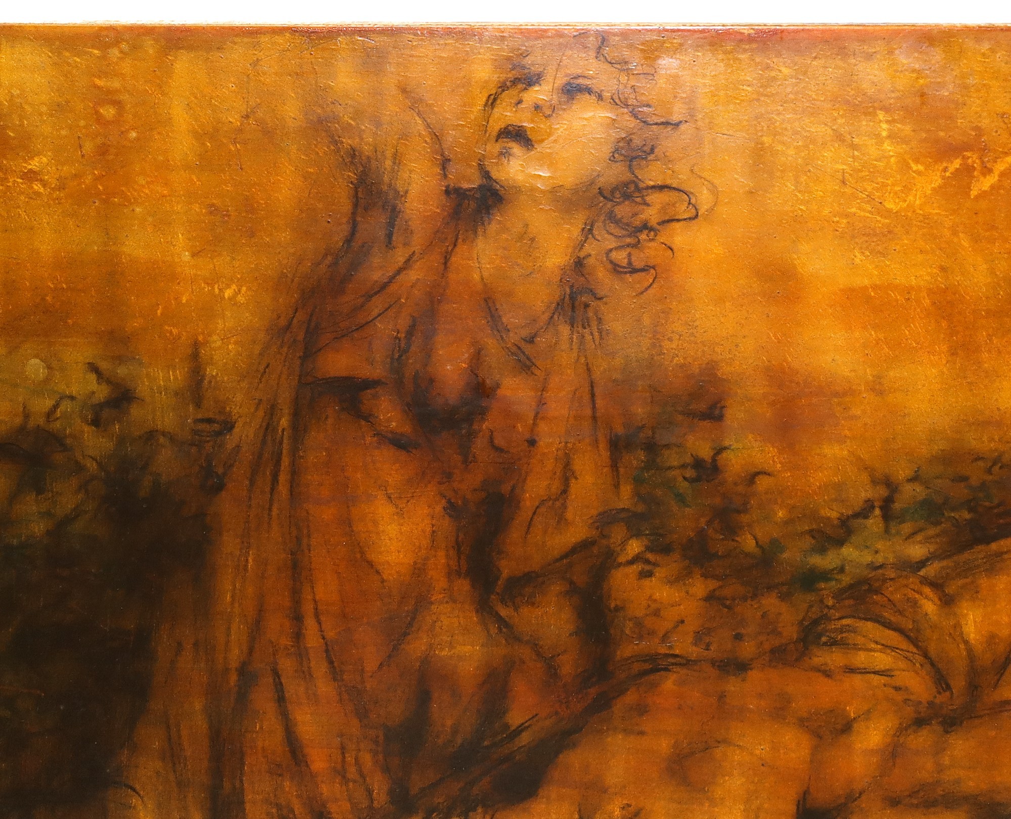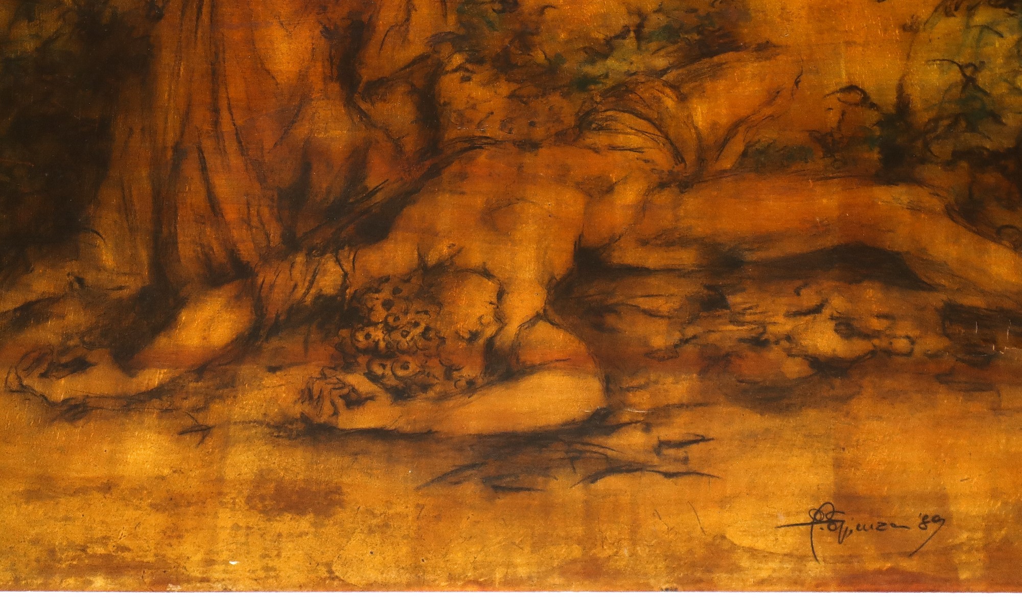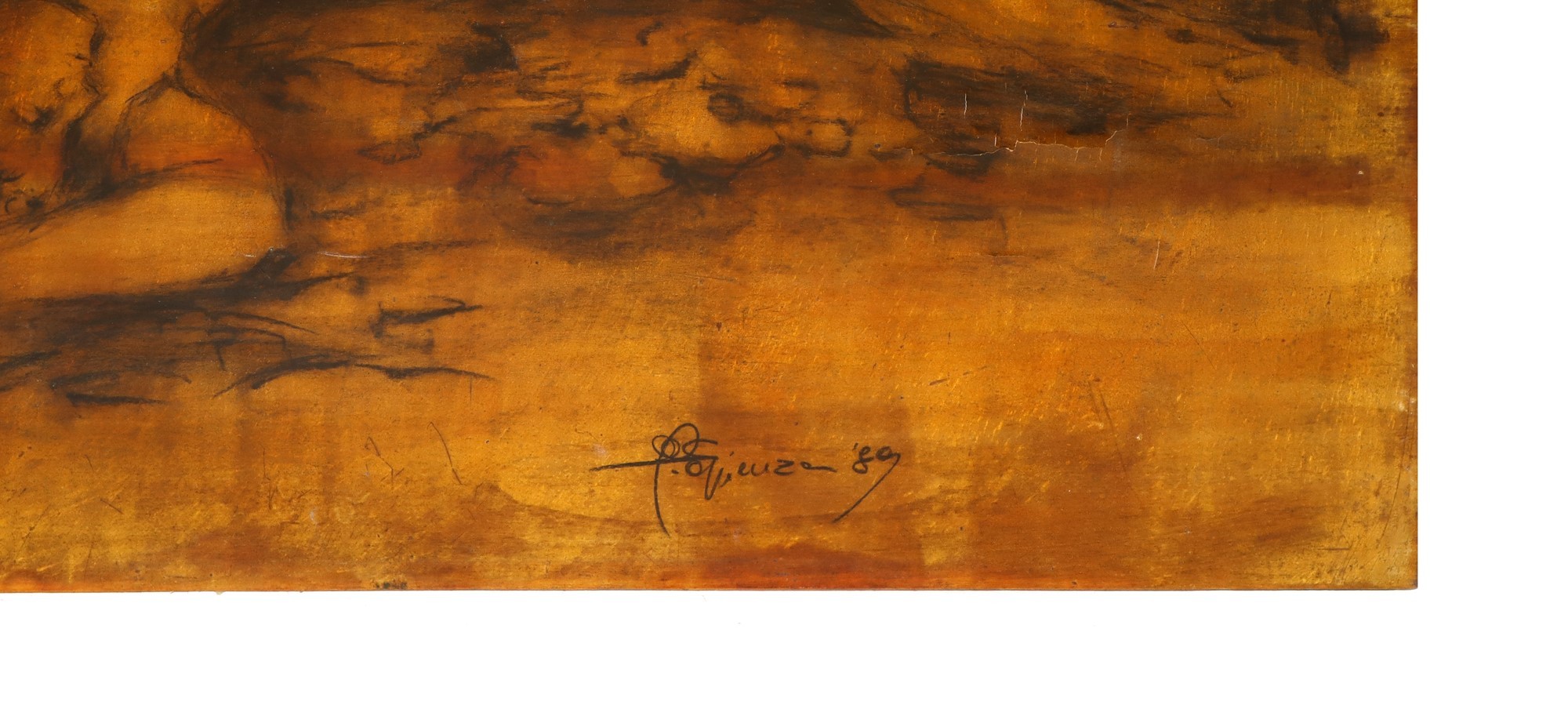 Mariella Sapienza (Catania 1949) - Aci e Gafinea cm 70 x cm 100 Tecnica mista su compensato Firmato e datato 89 in basso a destra, opera sprovvista di cornice