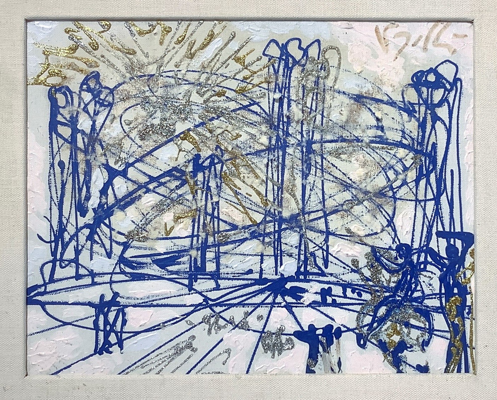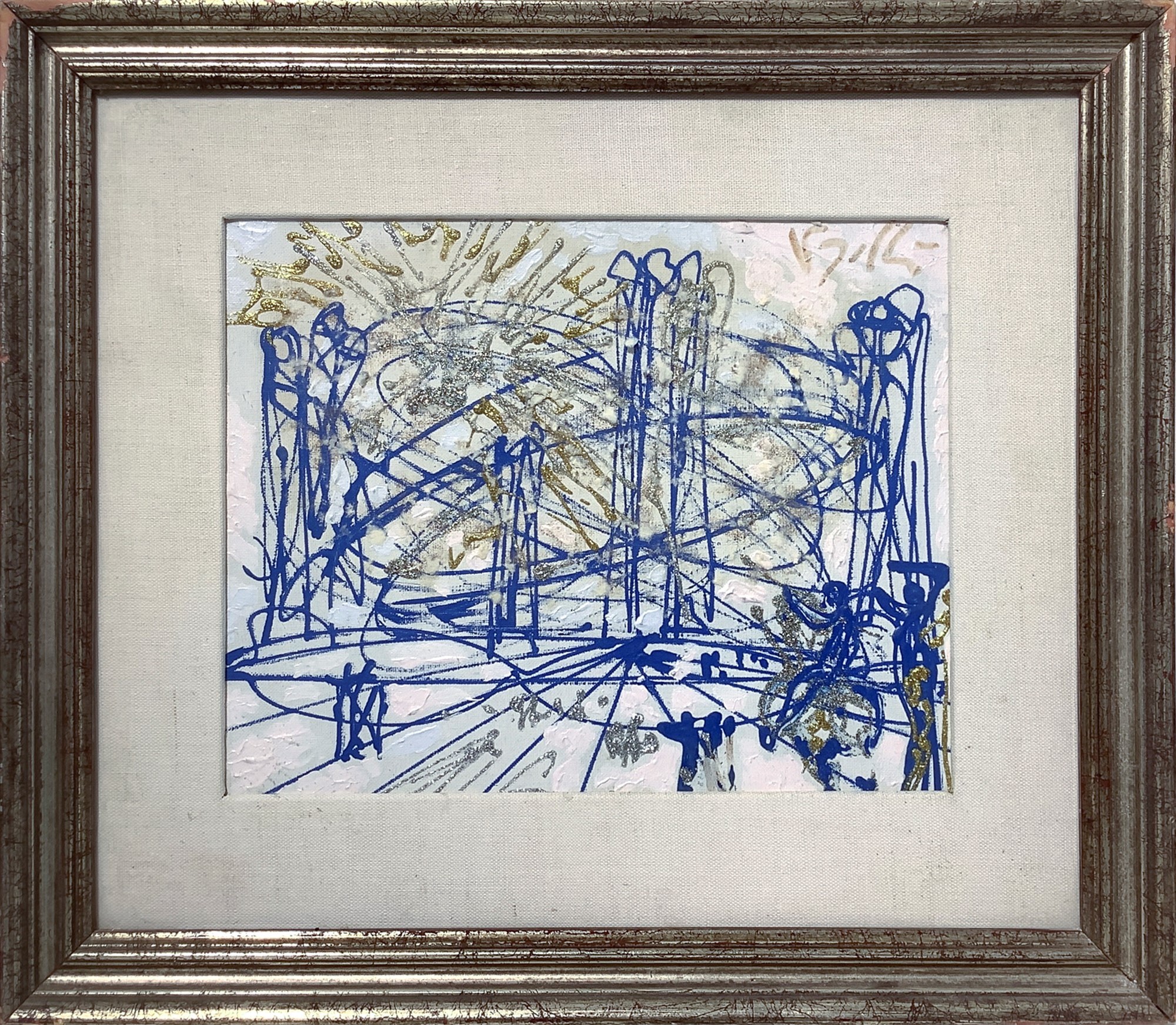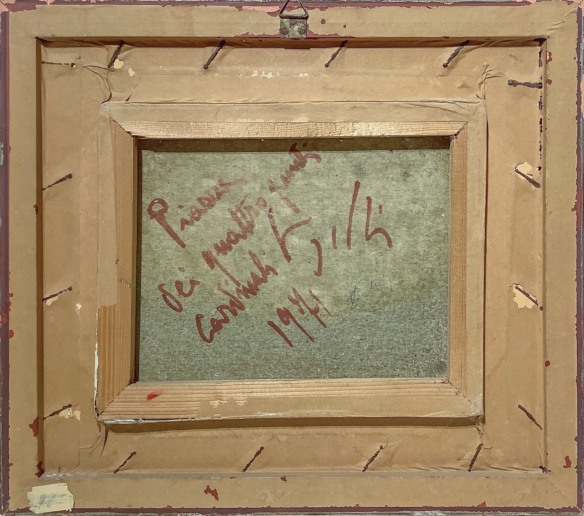 Piazza dei quattro punti cardinali, 20° Secolo cm 25 x cm 30, in cornice cm 40 x cm 46 Composizione astratta, tecnica mista su tela Titolato, firmato e datato sul retro 1971