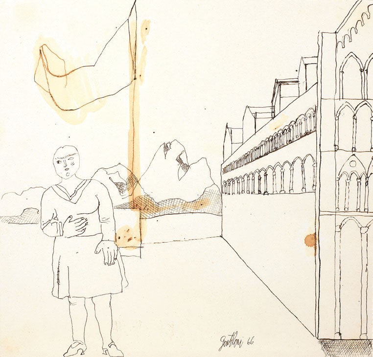 Franco Gentilini Faenza (Ra) 1909 - Roma 1981 Cattedrale con ragazza, 1966 China su carta, cm. 27x28 Firma e data in basso al centro: Gentilini 66. Al verso, su un cartone di supporto: etichetta e due timbri Biasutti & Biasutti, Torino: timbro "L'Immagine", Torino. Certificato su foto di Luciana Gentilini, Roma, 15 ottobre 2001, con timbro Galleria Accademia, Torino.