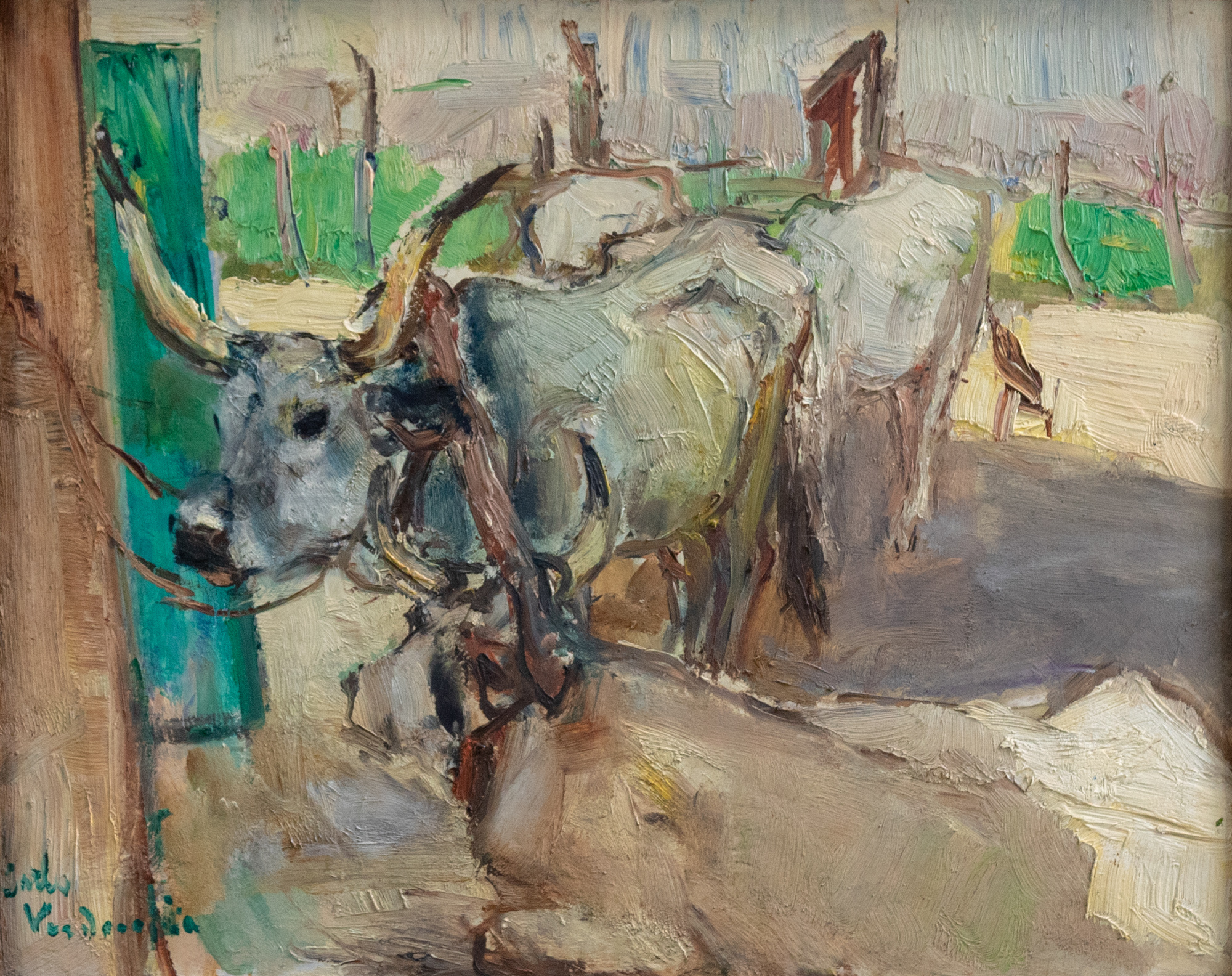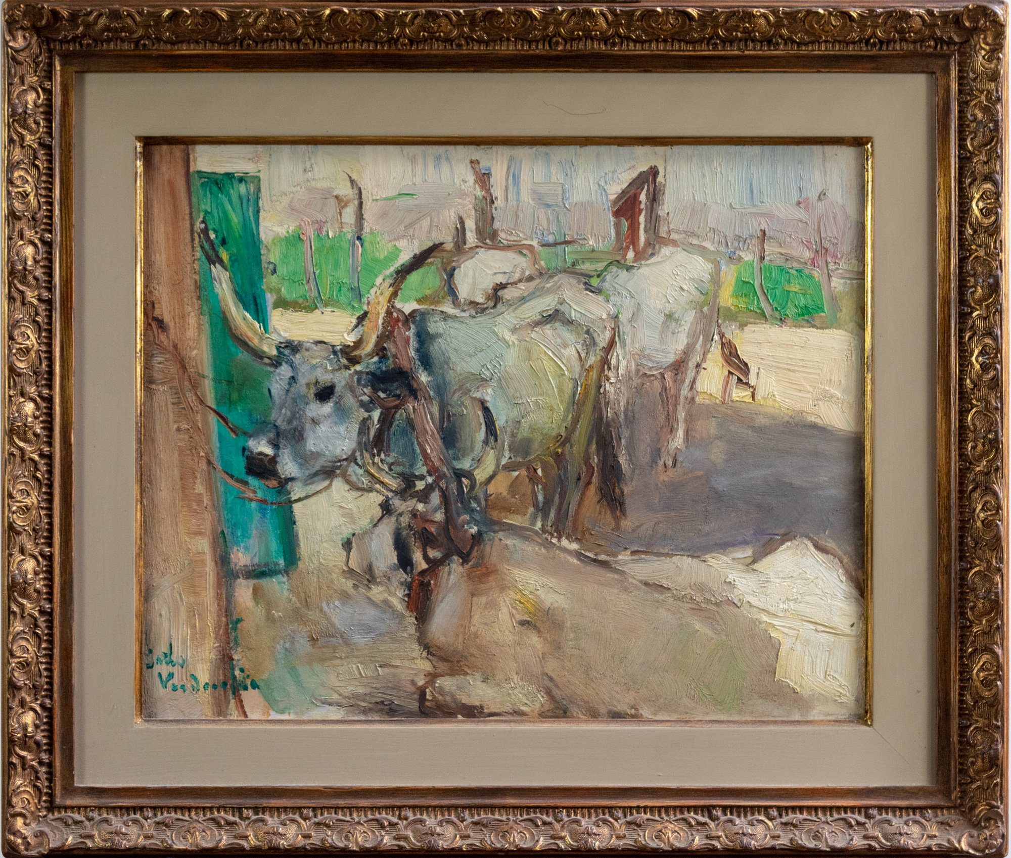 Carlo Verdecchia (Atri, TE 1905 - 1984), Mucche a riposo, olio su masonite, 40x50 cm