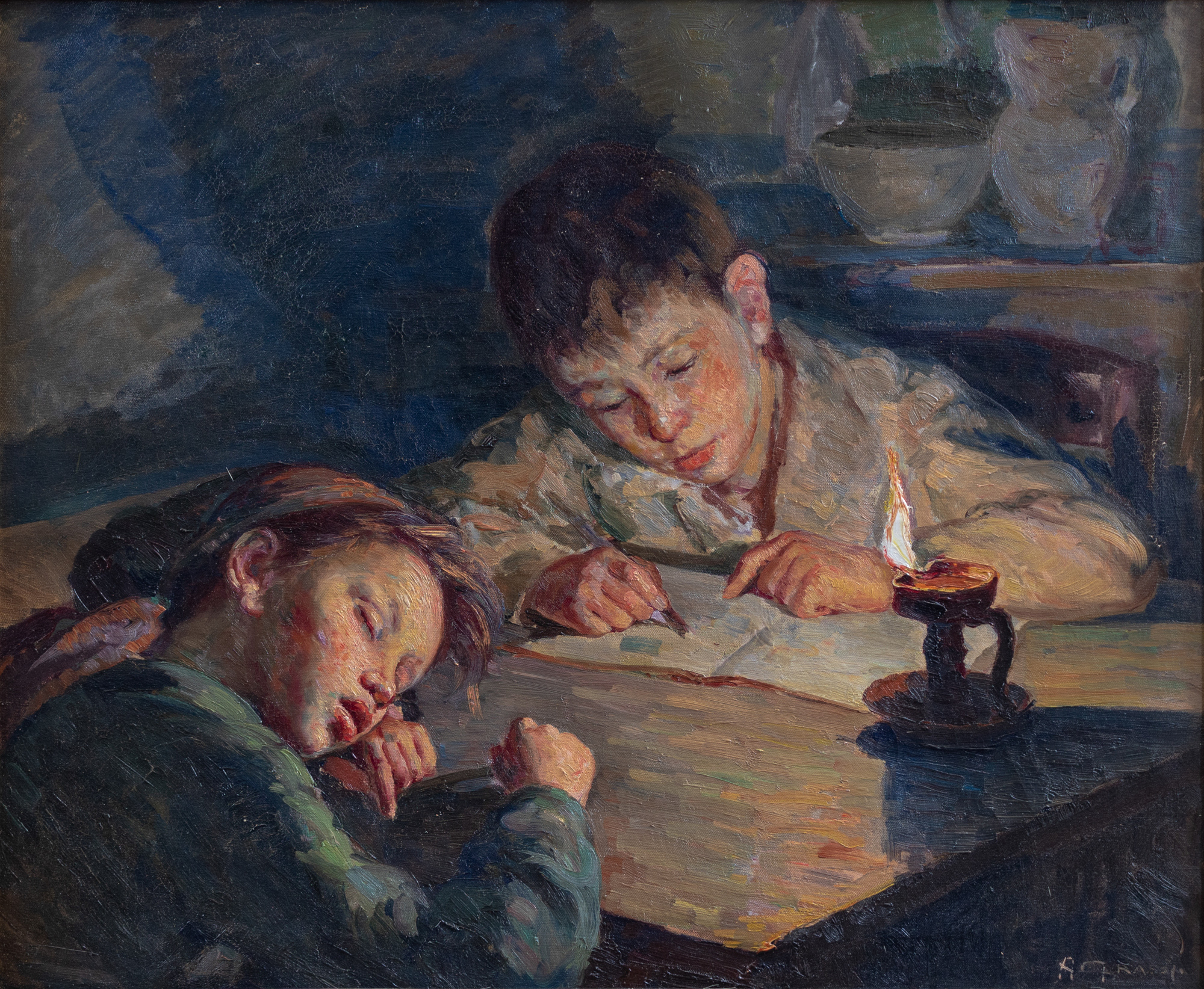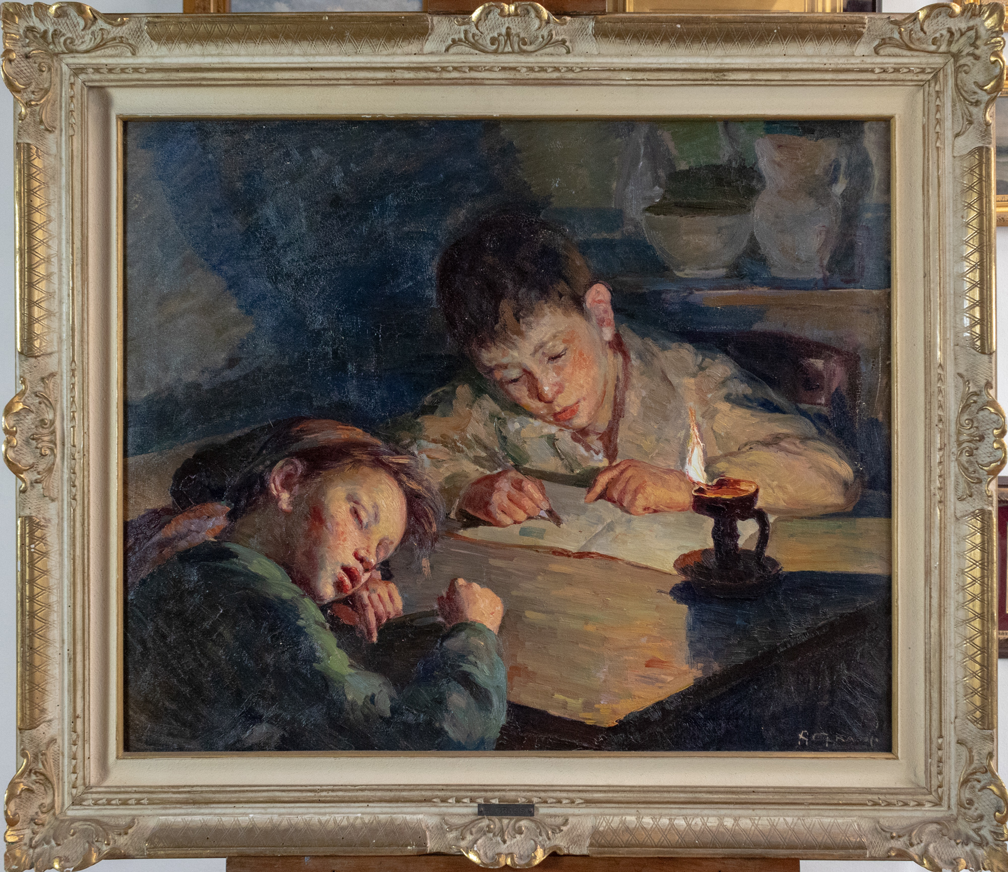 Alfonso Grassi (Solofra, AV 1918 - Salerno 2002), A lume di lucerna, olio su tela, 70x85,5 cm