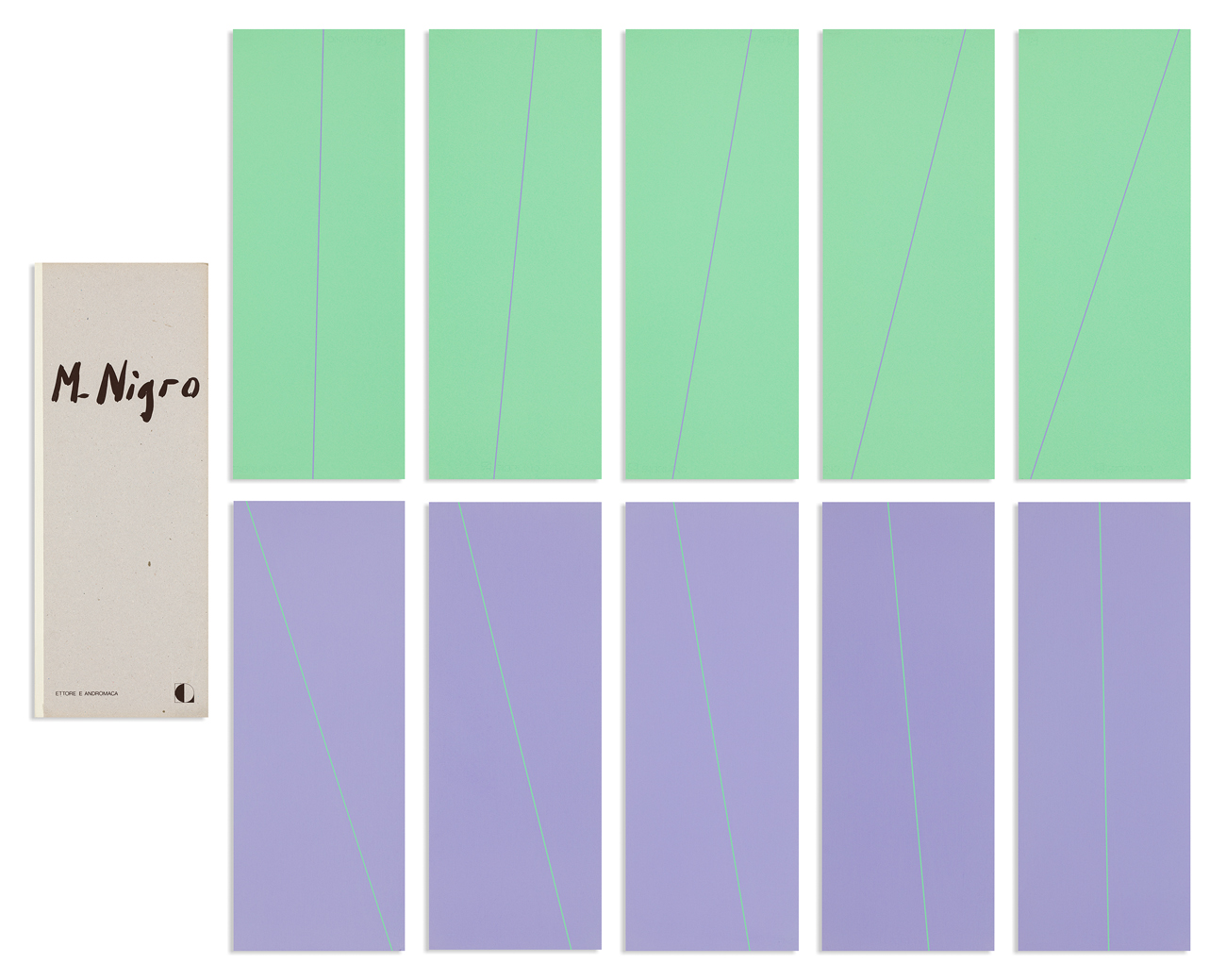 Cartella contenente colophon di presentazione recante testo di Luciano Caramel e 10 serigrafie su cartoncino, ciascuna recante firma e numerazione (Esemplari 56/100) a matita al retro