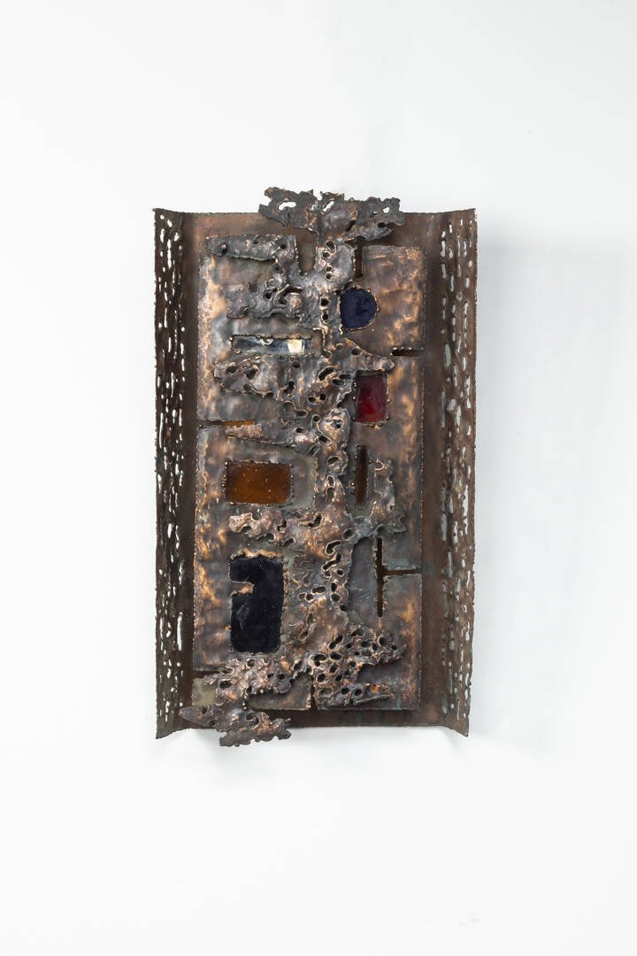 Plafoniera / applique in rame lavorato con inserti in vetro colorato.