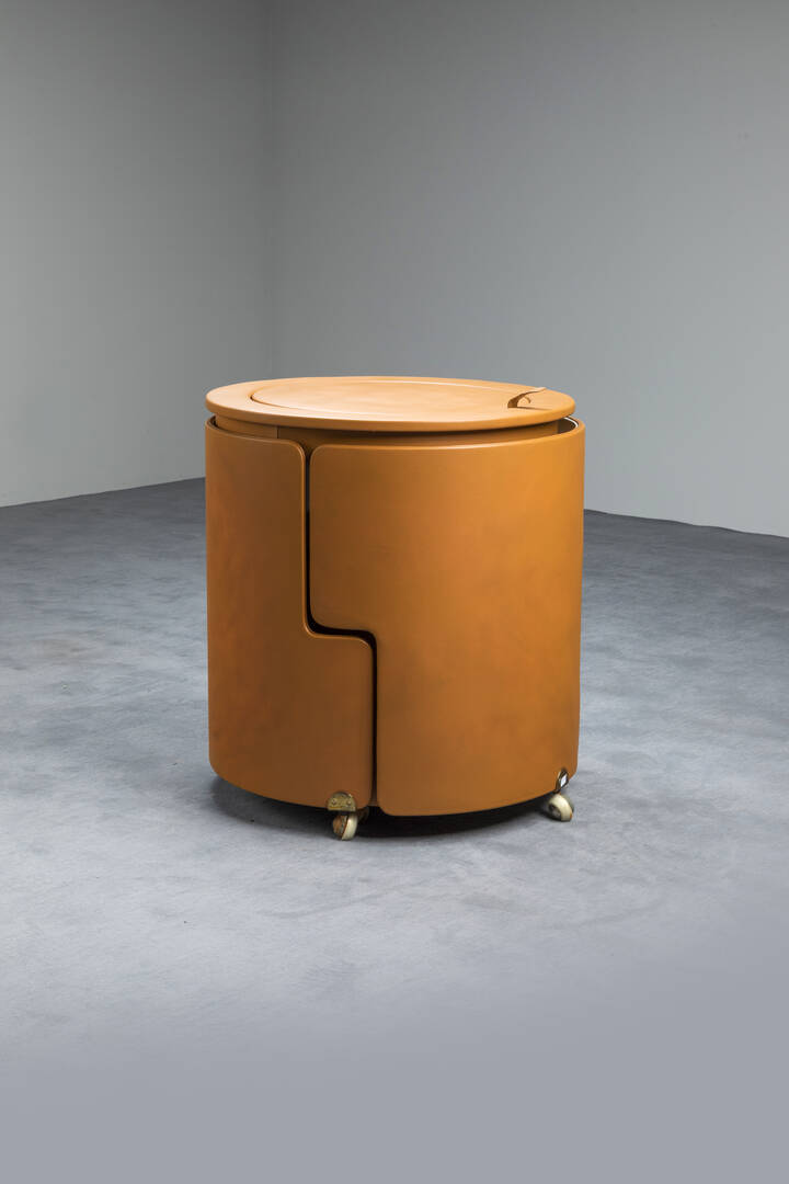 Poltroncina-toeletta in compensato curvato rivestito in similpelle.