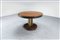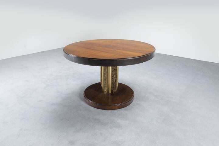Tavolo in legno con sostegno centrale decorato a placche in fusione di bronzo.