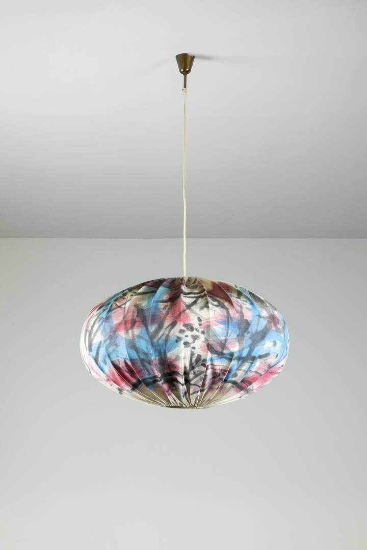 Lampada a sospensione di ambito torinese in tessuto dipinto a mano. Struttura in metallo verniciato.