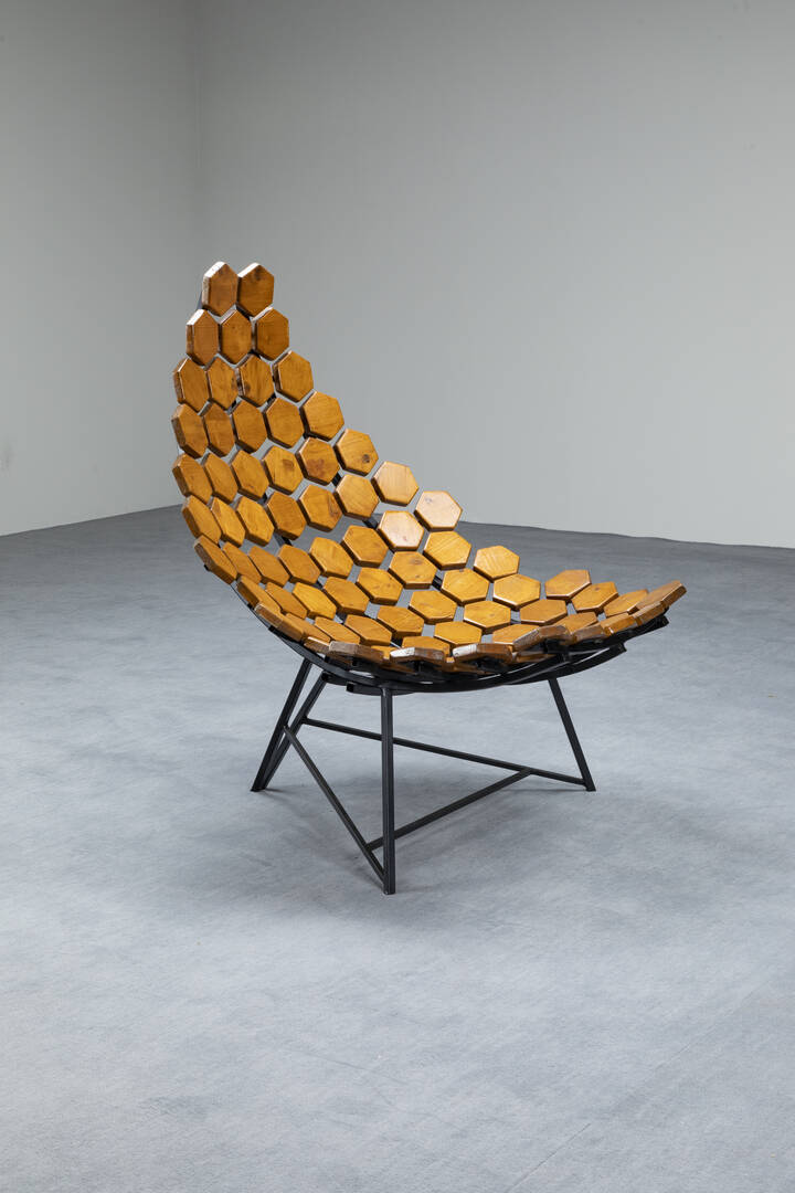 Poltrona con struttura in tubolare di metallo verniciato, scocca costituita da elementi esagonali in legno massello.