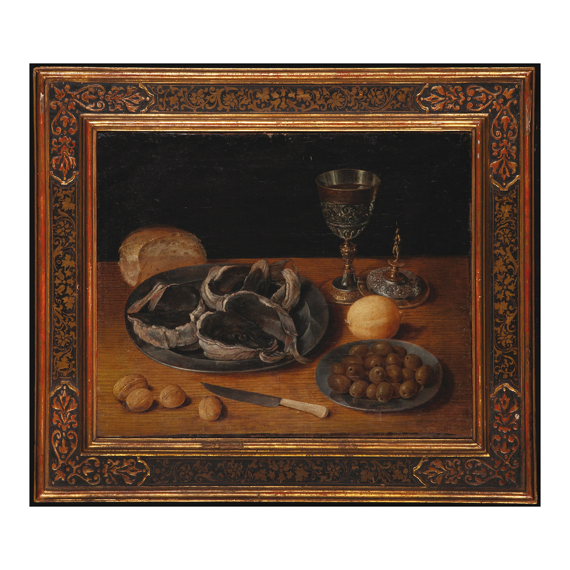 Pittore fiammingo del XVII secolo Natura morta con ostriche Questo piccolo olio su tela di un ignoto pittore fiammingo è una gradevole rappresentazione della grande tradizione seicentesca olandese della natura morta.Il gusto della committenza borghese che commissionava e acquistava questo genere di dipinti era tutto rivolto a soggetti che si adattavano bene al loro sobrio stile di vita, ma che non volevano al contempo essere puramente decorativi. Le ostriche, le olive, la frutta secca e il raffinato calice sono tutti indici di una ricercata raffinatezza, i prodotti sono prelibati; talvolta locali, talvolta esotici, sono utilizzati per autocelebrare la committenza e il loro status, nonché il loro gusto artistico. La scelta di tali temi è decisamente consona ad una classe mercantile agiata che faceva della limpidezza della propria vita – sia pubblica che privata – una vera e propria missione. Il pittore realizza un quadro di dimensioni non eccessive di modo da renderla perfetta per una vasta cerchia di committenti; la nitidezza della rappresentazione e il dettaglio del tavolo in legno reso con incredibile maestria, la rendono un’opera semplice ma al contempo molto preziosa. Olio su tela, cm est. 57x65, int. 40.5x49