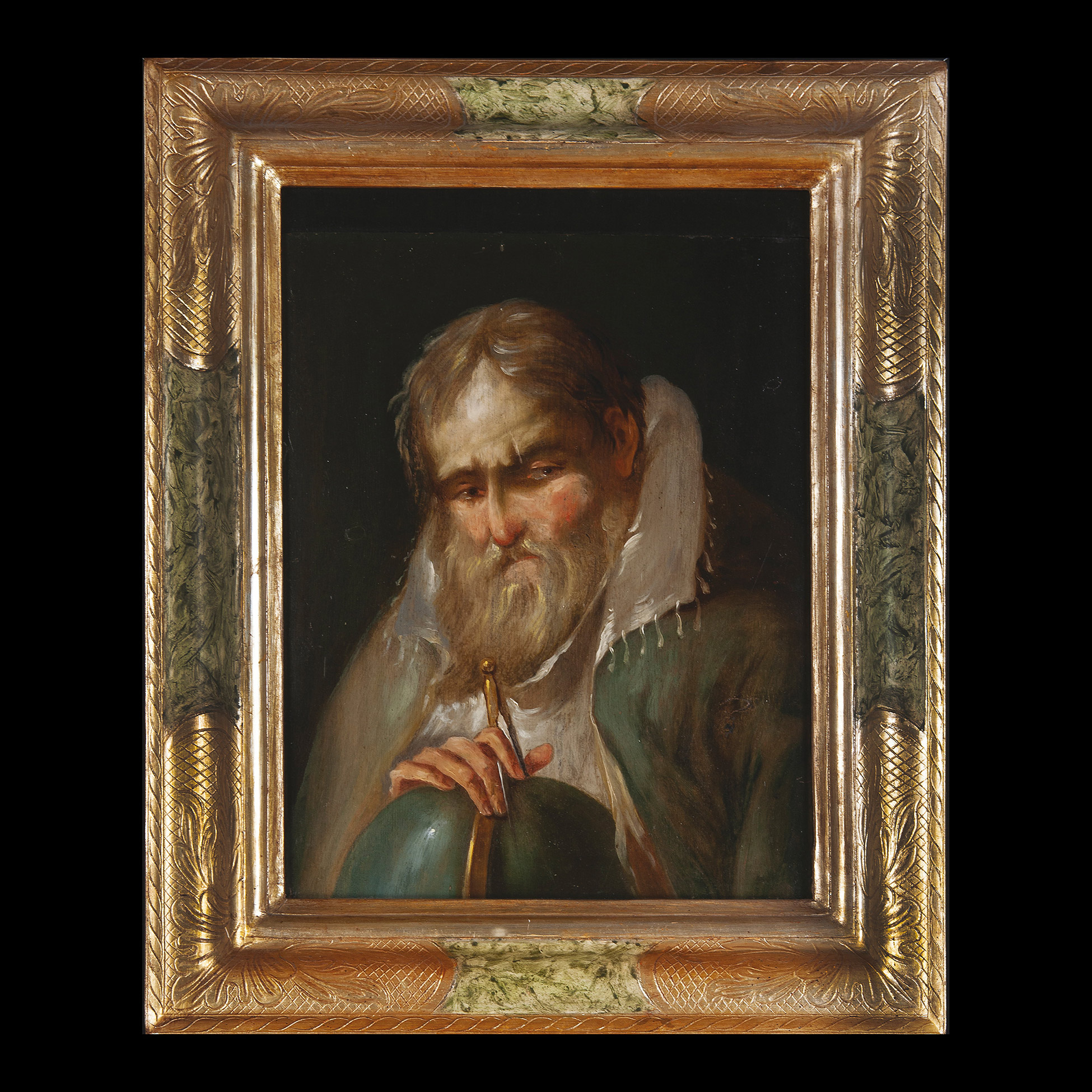 Giovanni Antonio Guardi (Vienna, 1699 - Venezia, 1760), Geografo È al Fogolari che dobbiamo molto di ciò che sappiamo su Giovanni Antonio Guardi. I registri del patrizio Giovanni Benedetto Giovannelli, benefattore e mecenate di Guardi per diversi anni, sono una fonte preziosa per noi. Grazie ai suoi documenti, apprendiamo che il pittore era spesso impiegato come assistente di altri artisti o riceveva commissioni modeste. Una svolta nella carriera di Guardi si ebbe intorno al 1738, quando fu al servizio di Johann Matthias von der Schulenburg, generale dell'esercito veneziano, che aveva da poco ottenuto un'importante vittoria contro i turchi a Corfù. Il pittore si distingueva per la rappresentazione di storie tratte dalla mitologia o dalle Scritture; in questo caso, la piccola tela che vediamo è un'allegoria raffigurante un Astronomo, che potrebbe essere interpretata anche come un Geografo, dato che gli attributi dei due soggetti sono molto simili. Il formato a camera, il taglio ravvicinato della composizione e la mancanza di intento narrativo indicano la probabile destinazione privata e decorativa della tela. Olio su tavola, cm est. 54x45.5, int. 40x28.5
