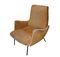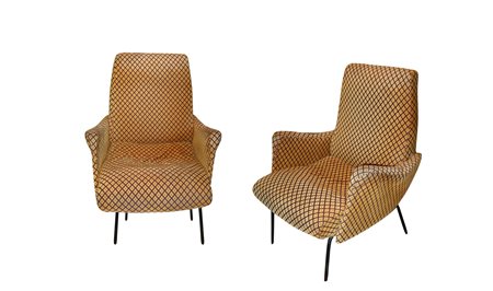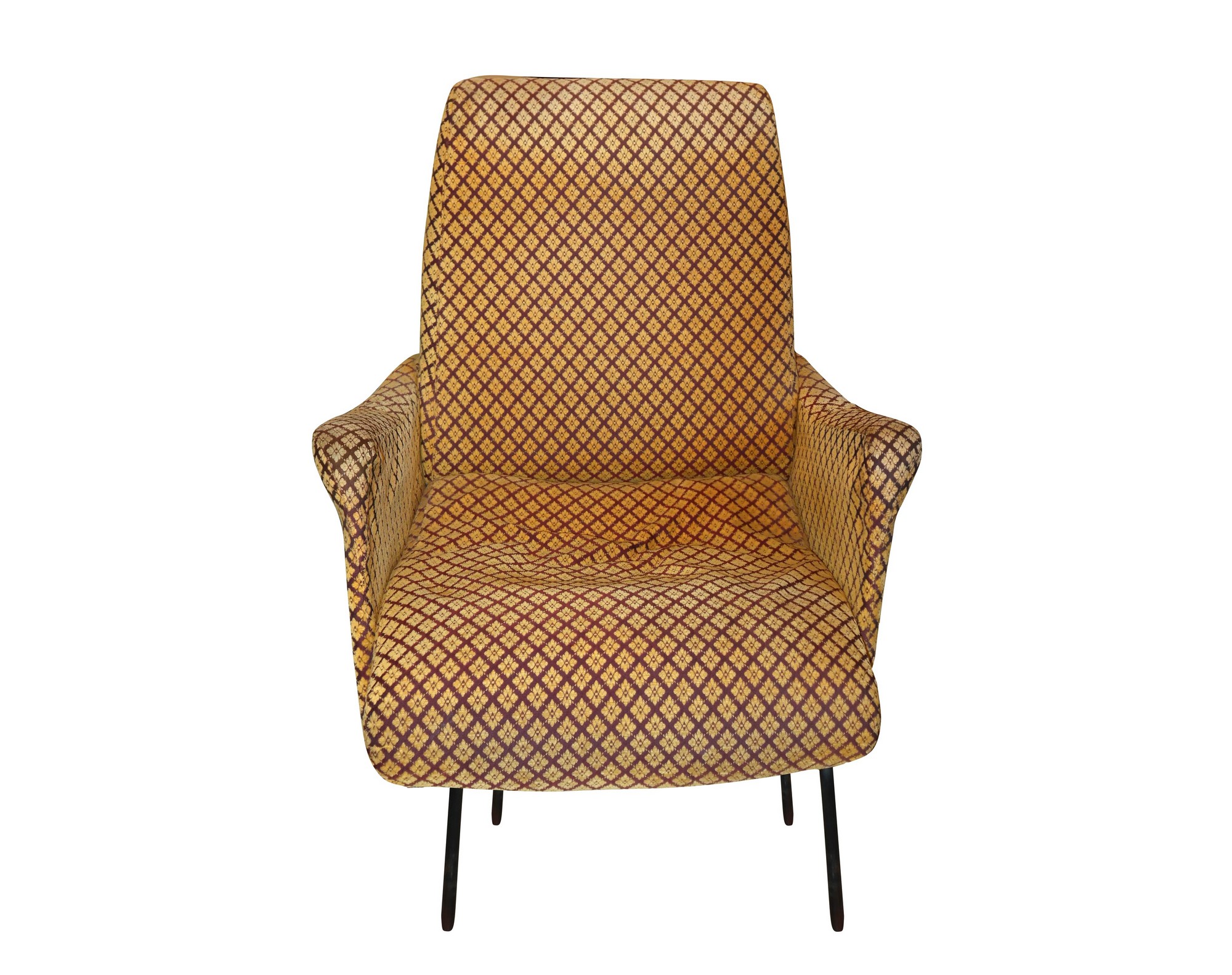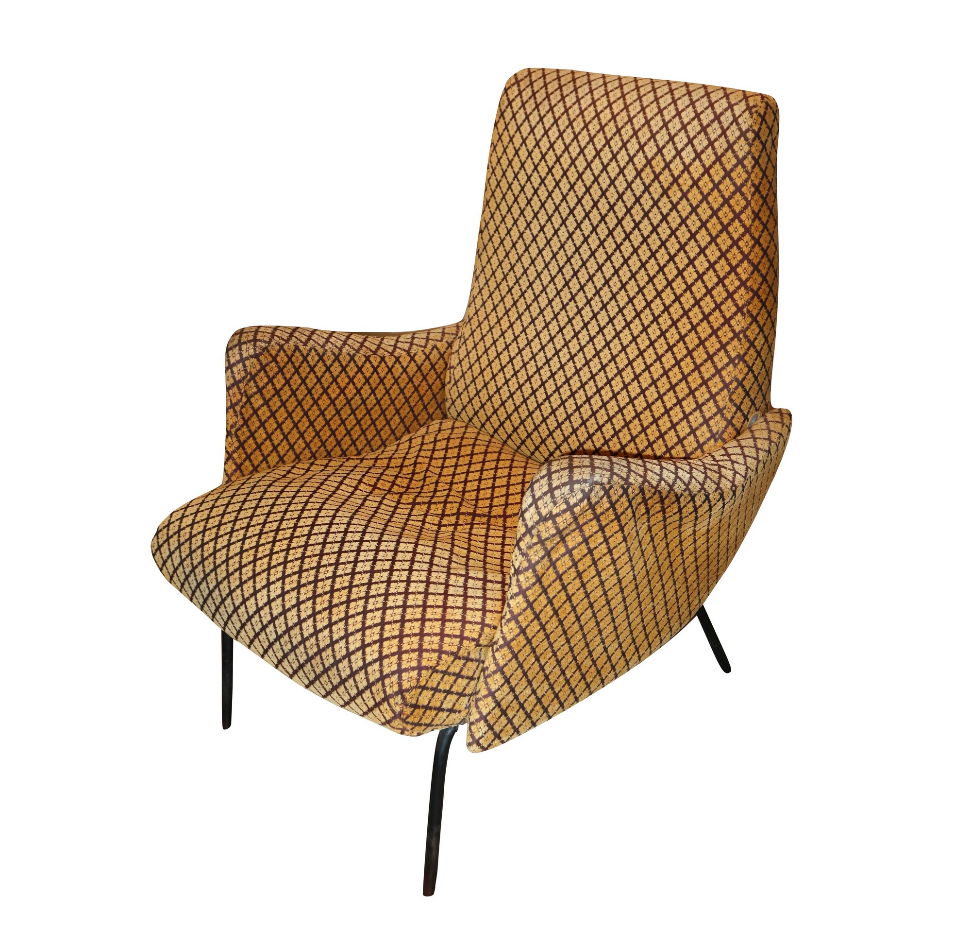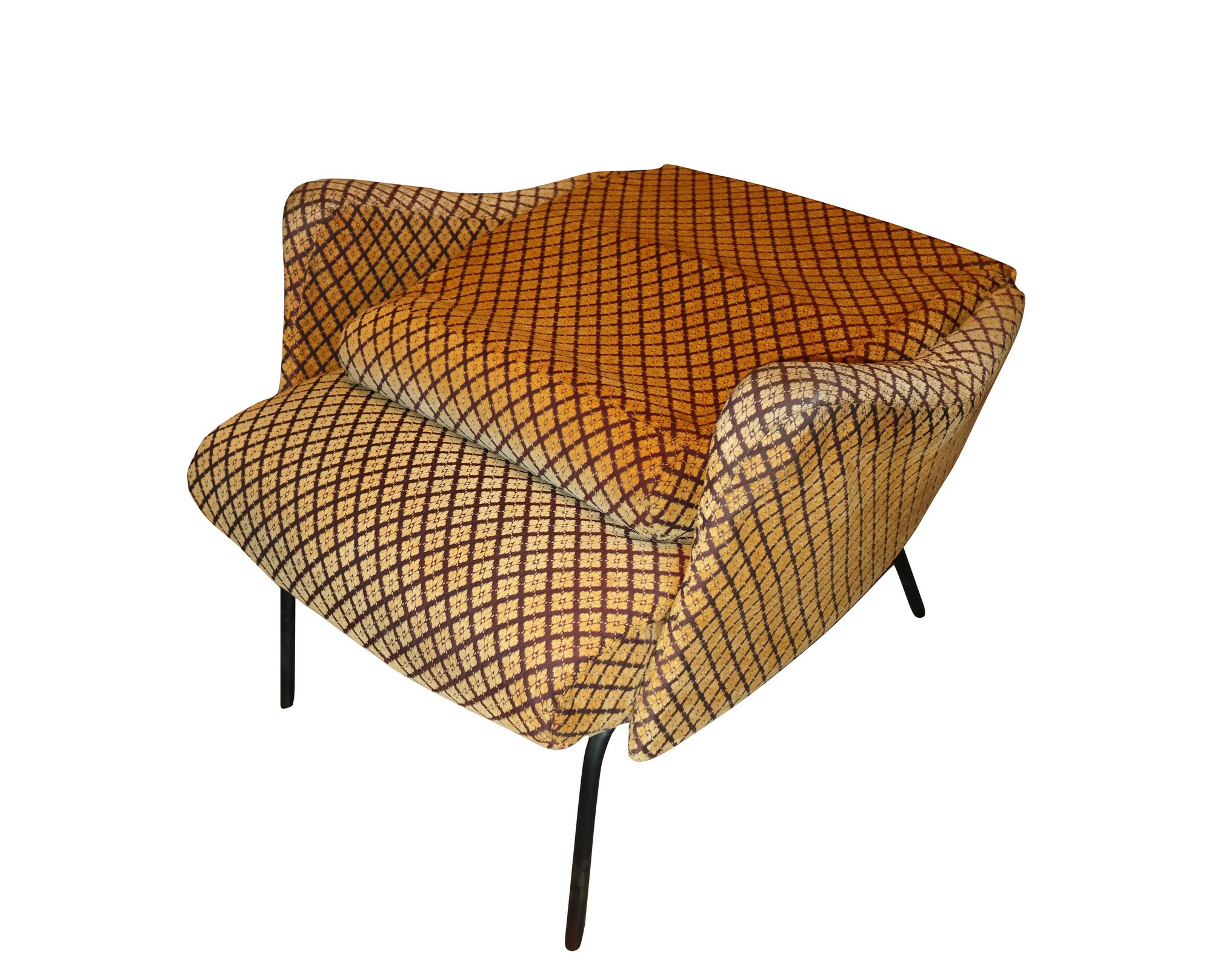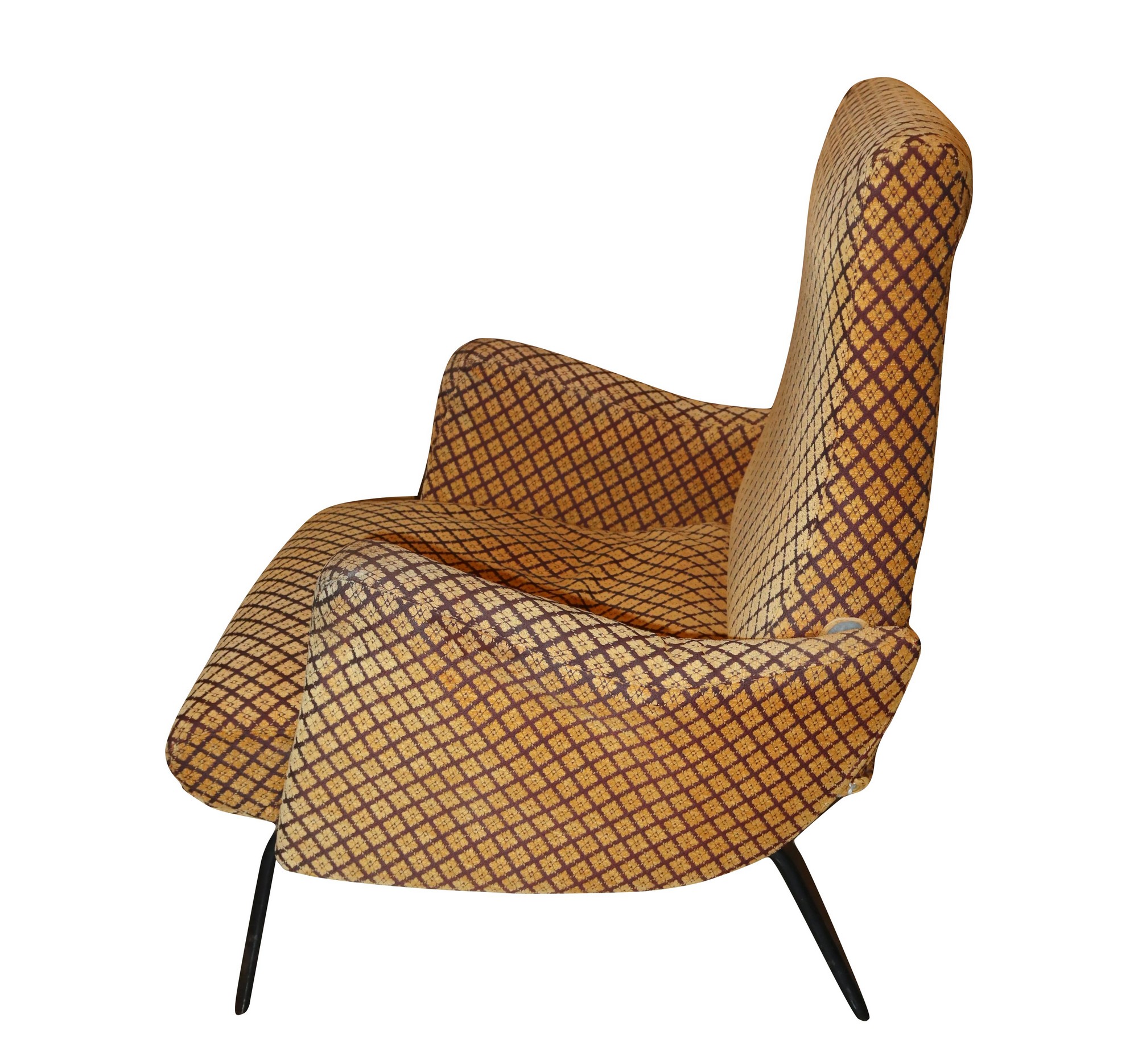 Mario Franchioni per FraMar - Coppia di poltrone con struttura in legno e metallo laccato nero, 1950s Spalliera reclinabile e piedi a scomparsa. Tessuto originale del periodo nei toni dell senape riportante motivo a losanghe. Segni di uso.