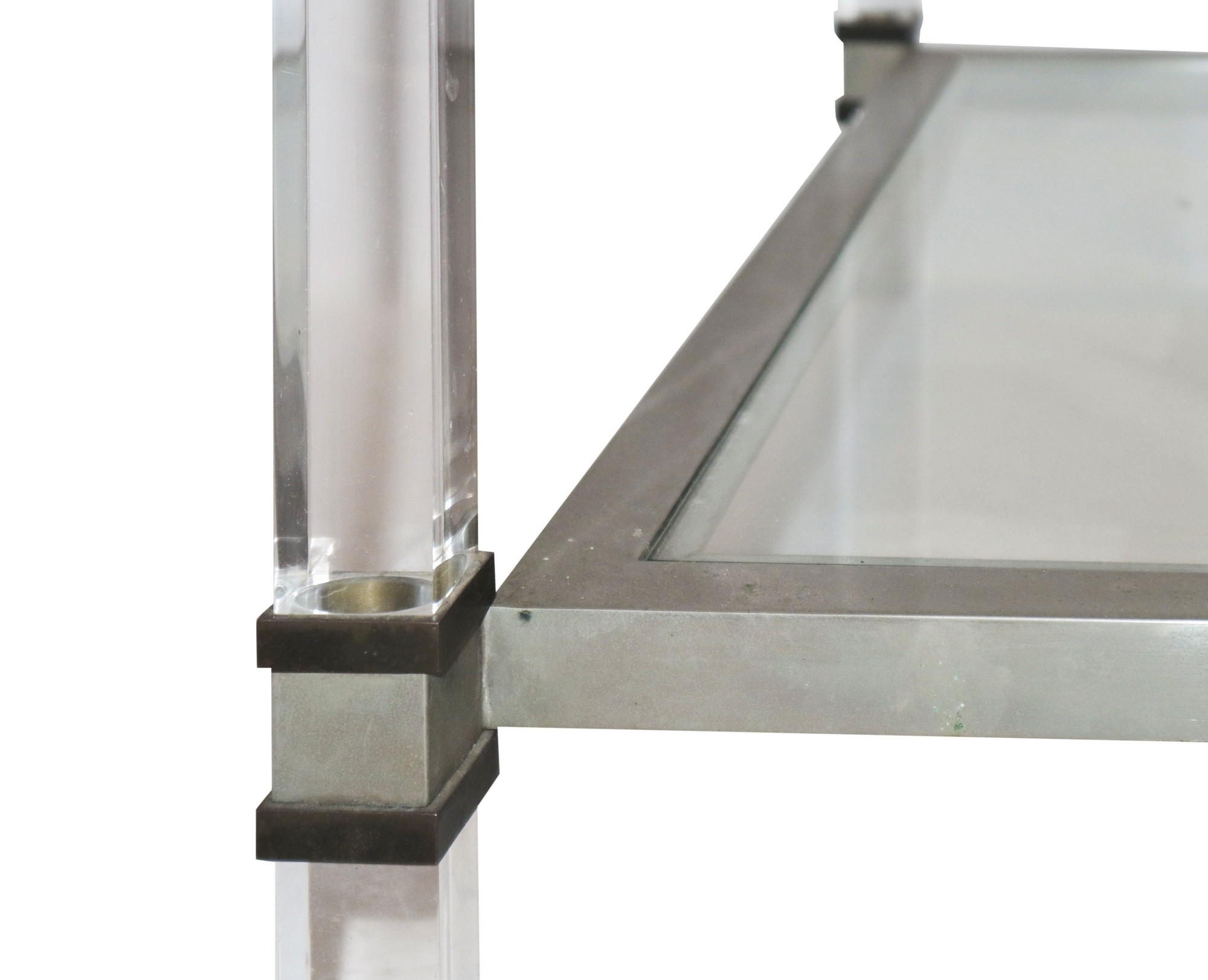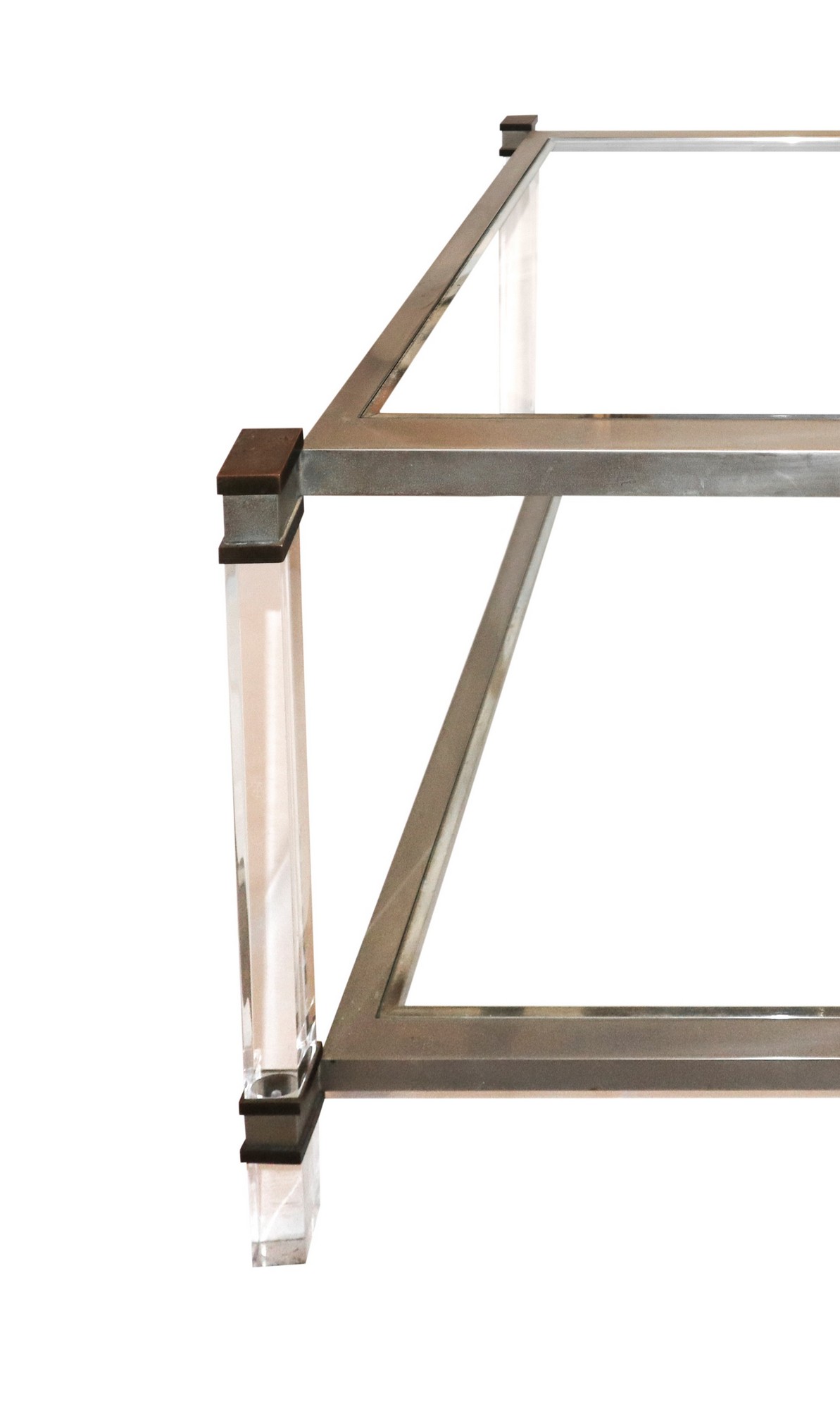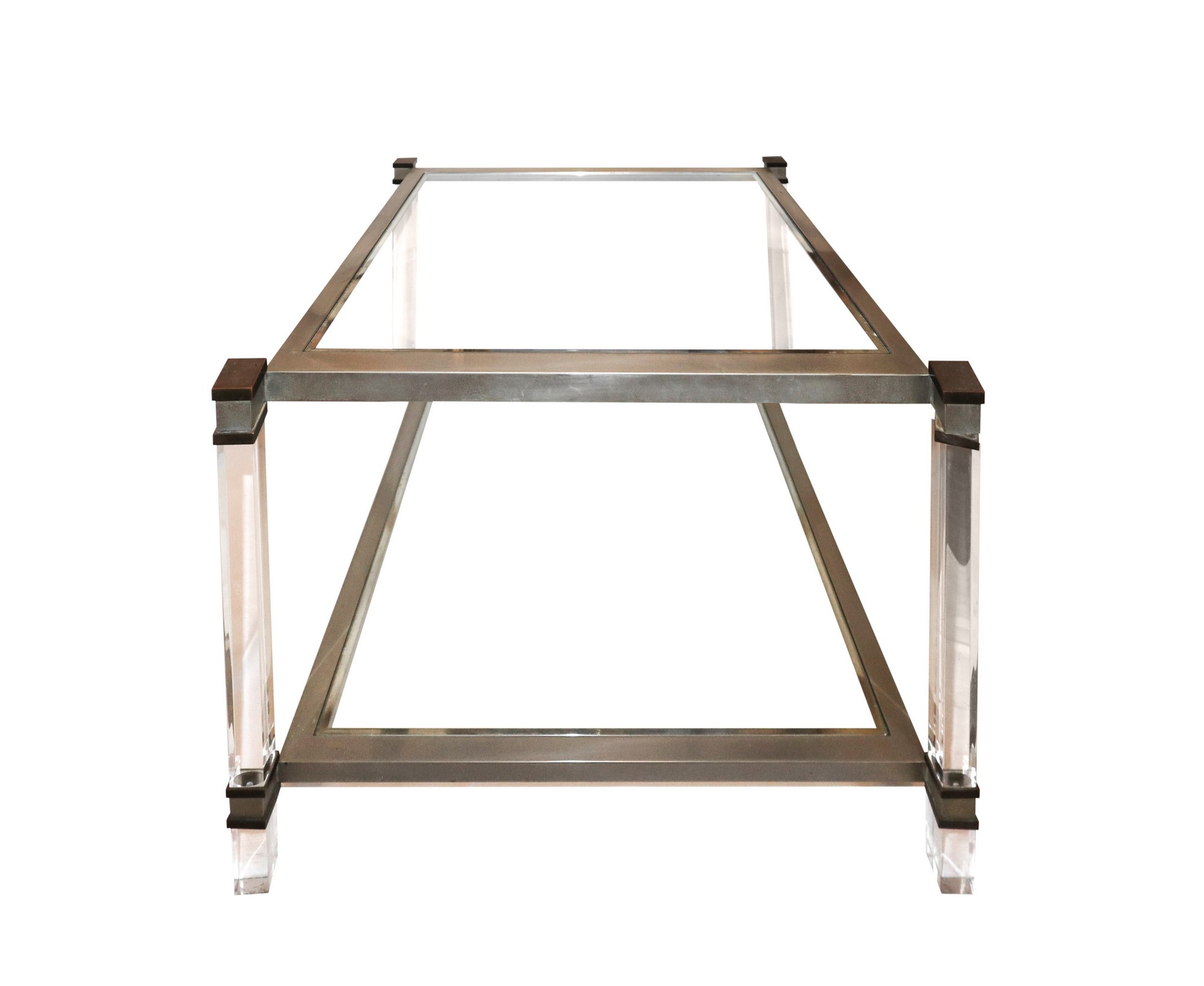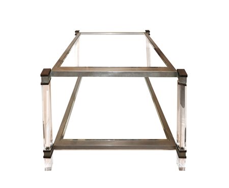Tavolo da caffè con struttura in metallo nichelato plexiglas trasparente, 60's cm 55 x cm 66 x cm 66 Produzione nello stile di Romeo Rega. Dettagli in ottone. Doppio ripiano in vetro trasparente. Presenti segni di uso.