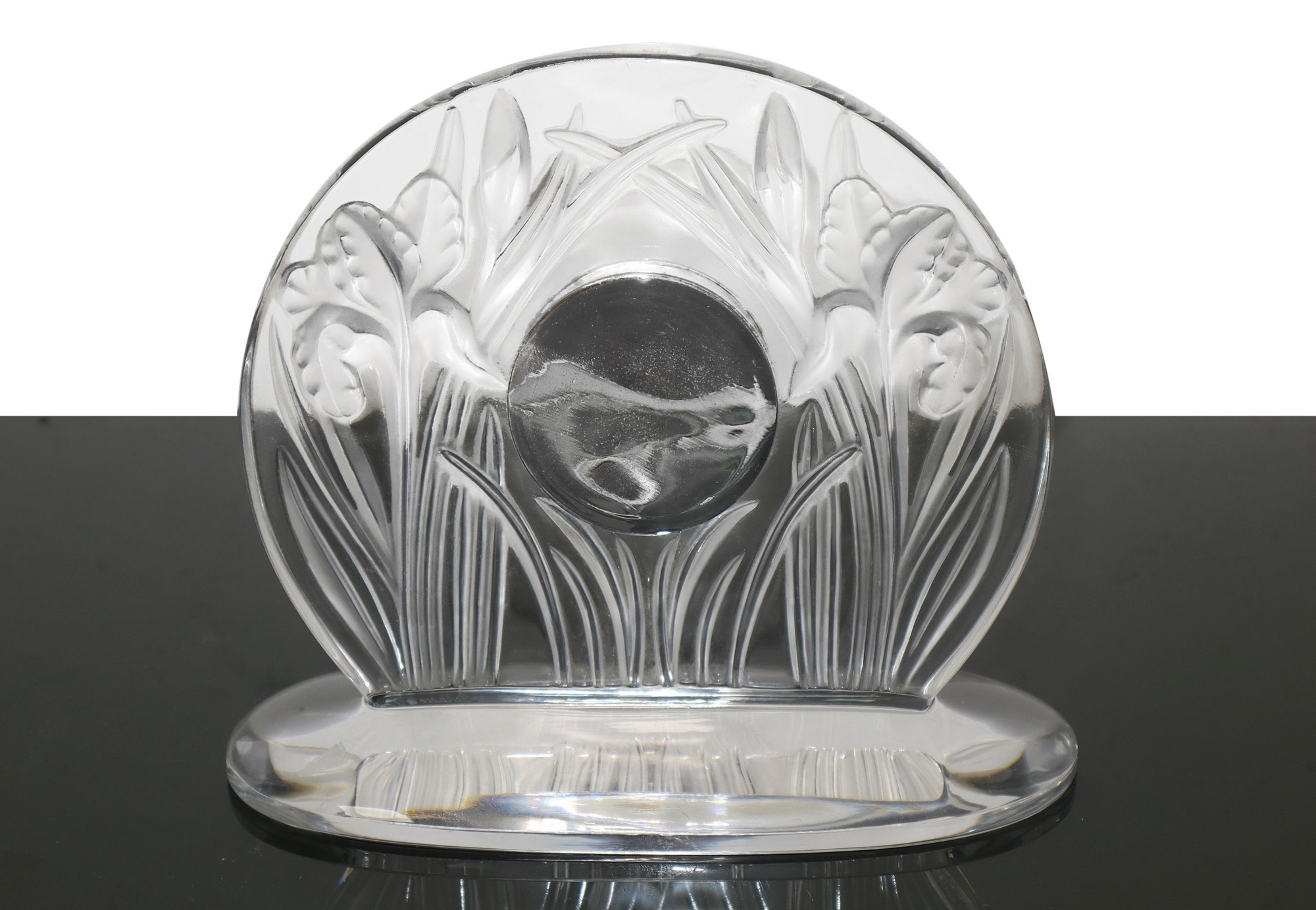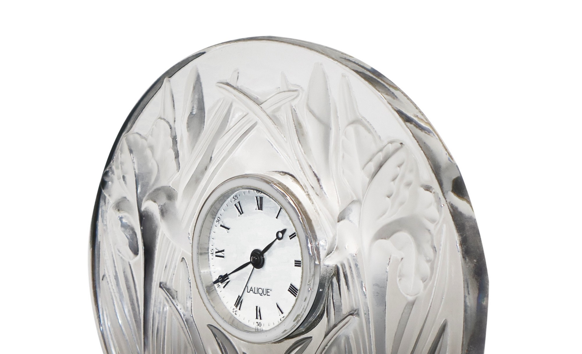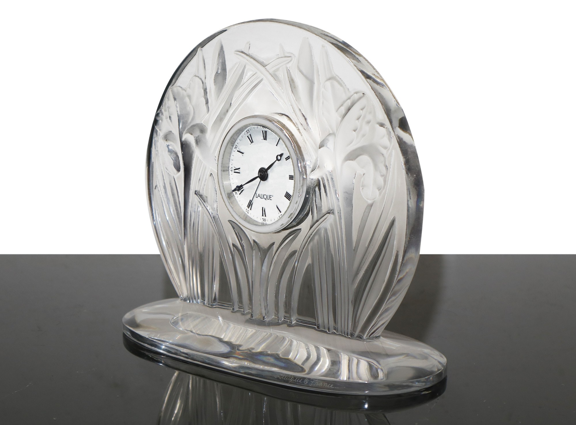 Lalique (1888) - Orologio da tavolo in cristallo con decoro di piante in bassorilievo.