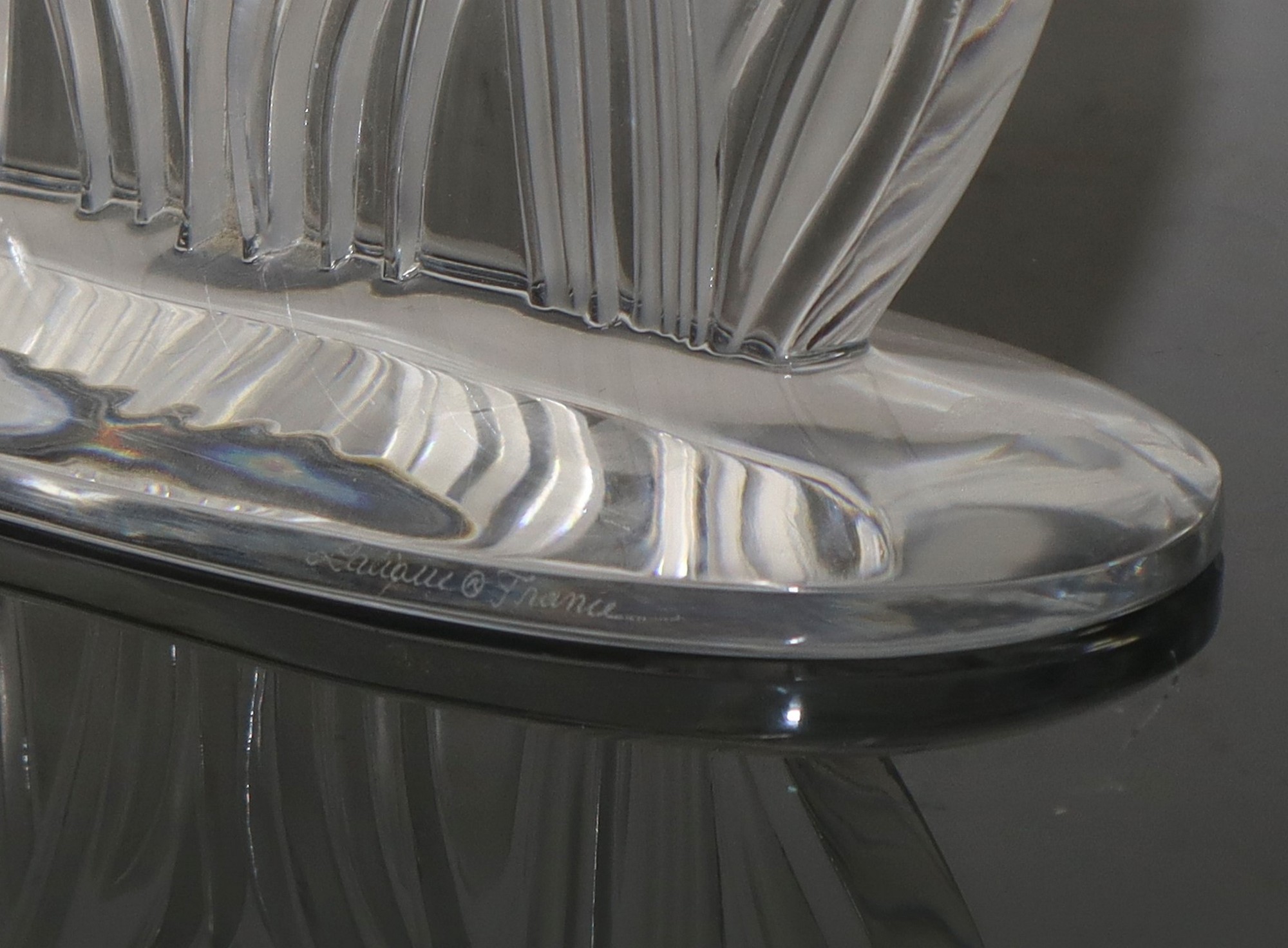 Lalique (1888) - Orologio da tavolo in cristallo con decoro di piante in bassorilievo. Cm 18 x 20 x 8. Cassa circolare firmata.