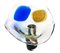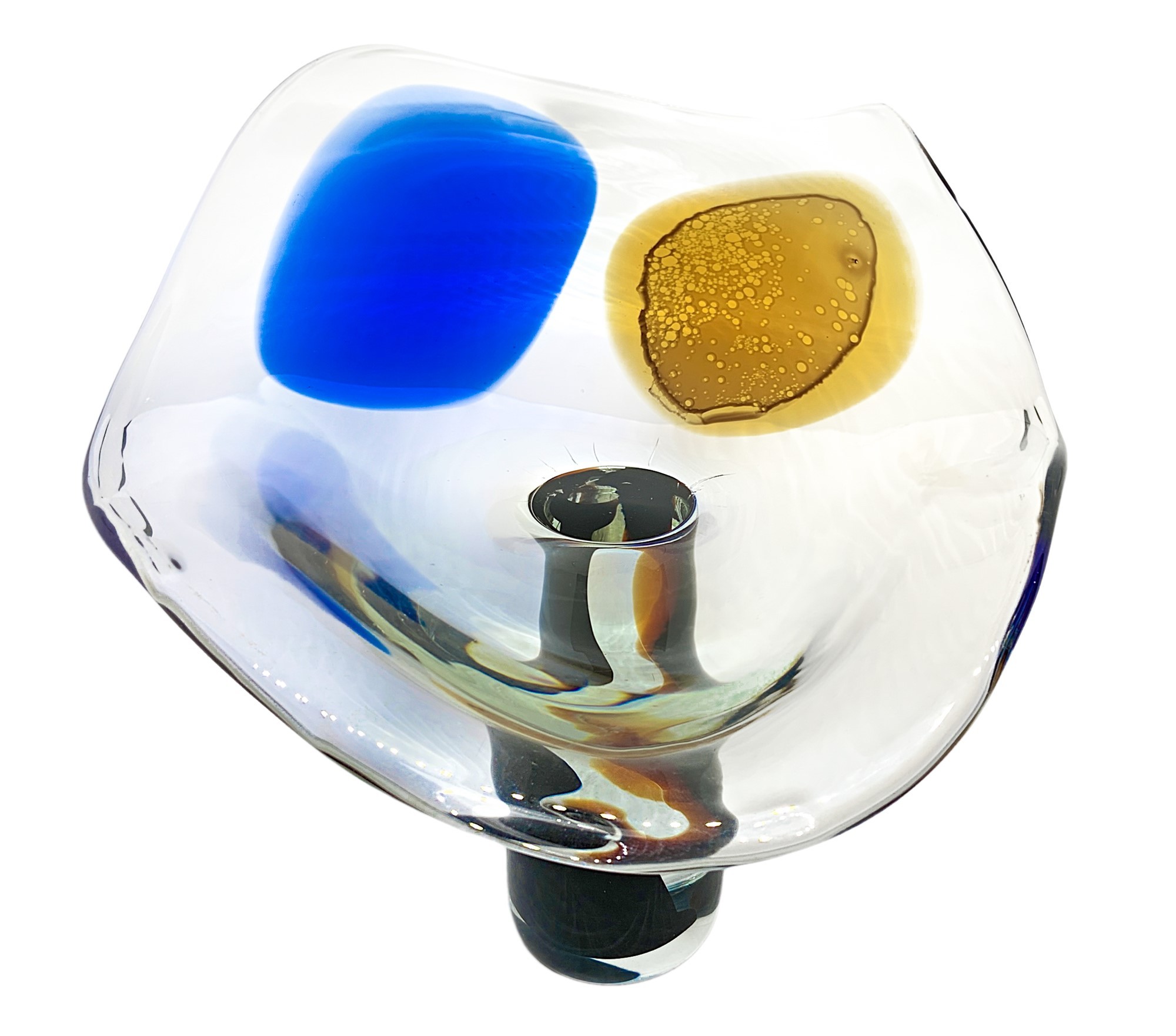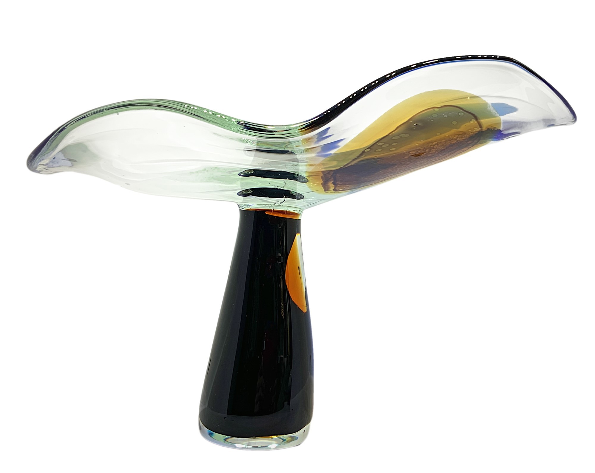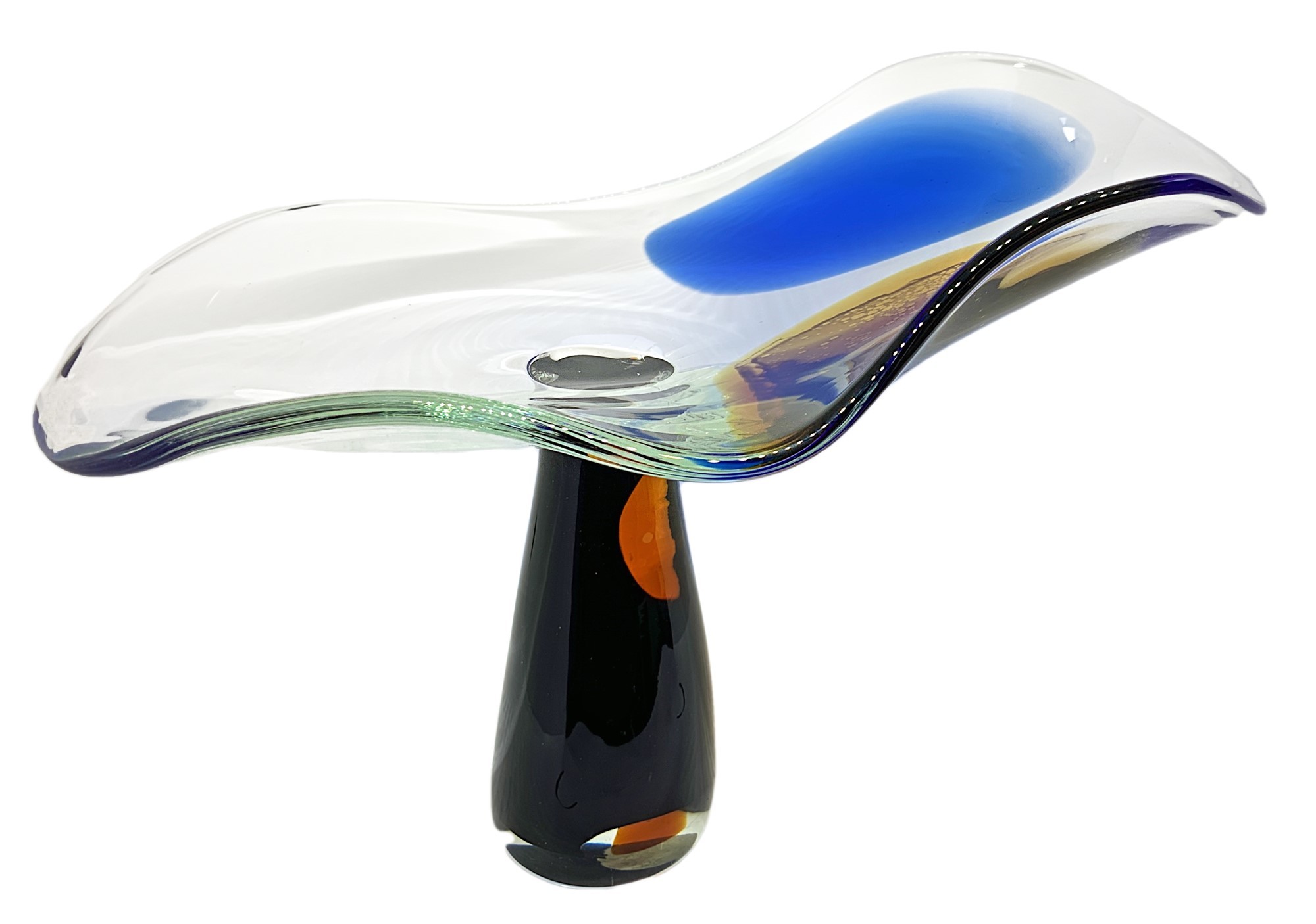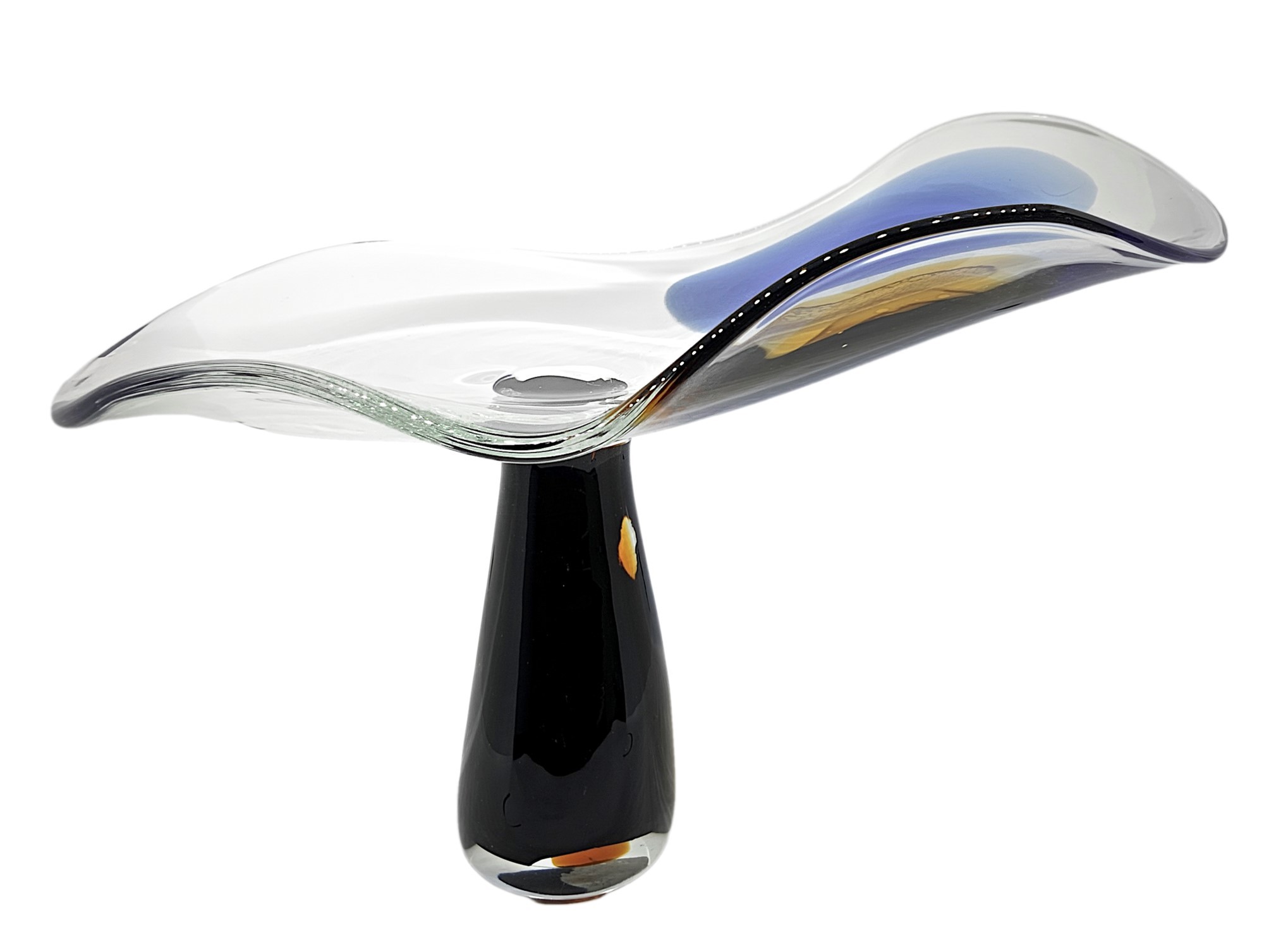 Alzata in vetro con bordo ondulato e decorazione centrale nei toni del blu e marrone