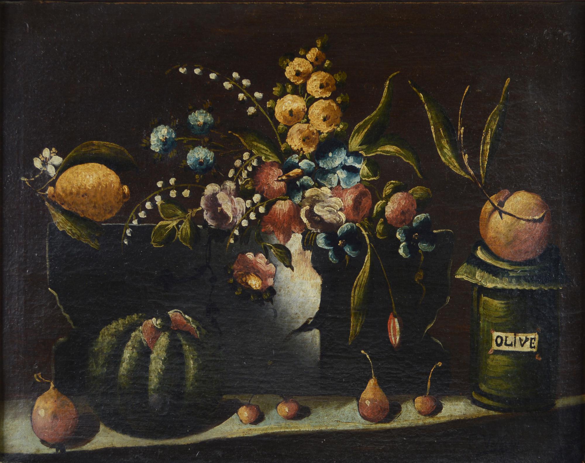Scuola del XIX secolo NATURA MORTA CON OLIVE olio su tela, cm 47x60