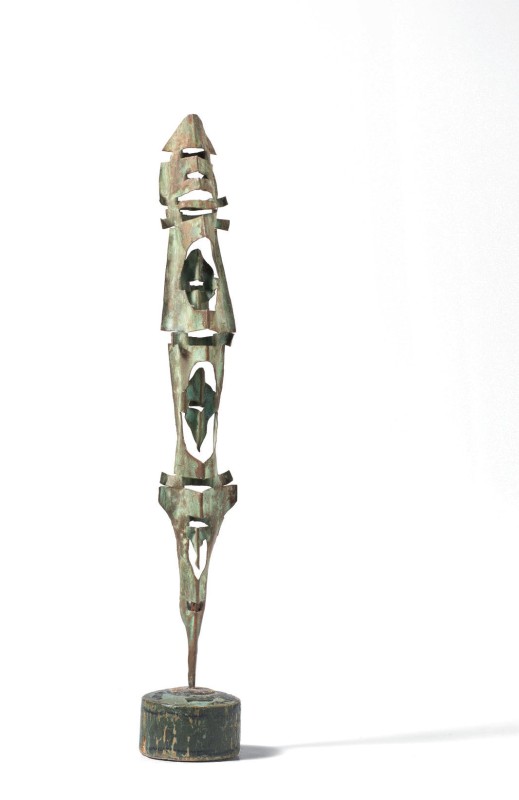 Mirko Udine 1910 - Cambridge 1969 Piccolo Totem, 1950 Scultura in rame, cm. 20 h. Sotto la base: numero R 87 (a penna). Storia: Collezione privata, Prato; Collezione privata Certificato su foto di Serena Cagli Basaldella, 12 novembre 1989, con n. R-87. Esposizioni: Grandi maestri, piccole sculture, da Depero a Beverly Pepper, a cura di Lara Vinca Masini, Pistoia, Palazzo Sozzifanti, 6 aprile - 30 giugno 2013, cat. pp. 306, 307, illustrata a colori.